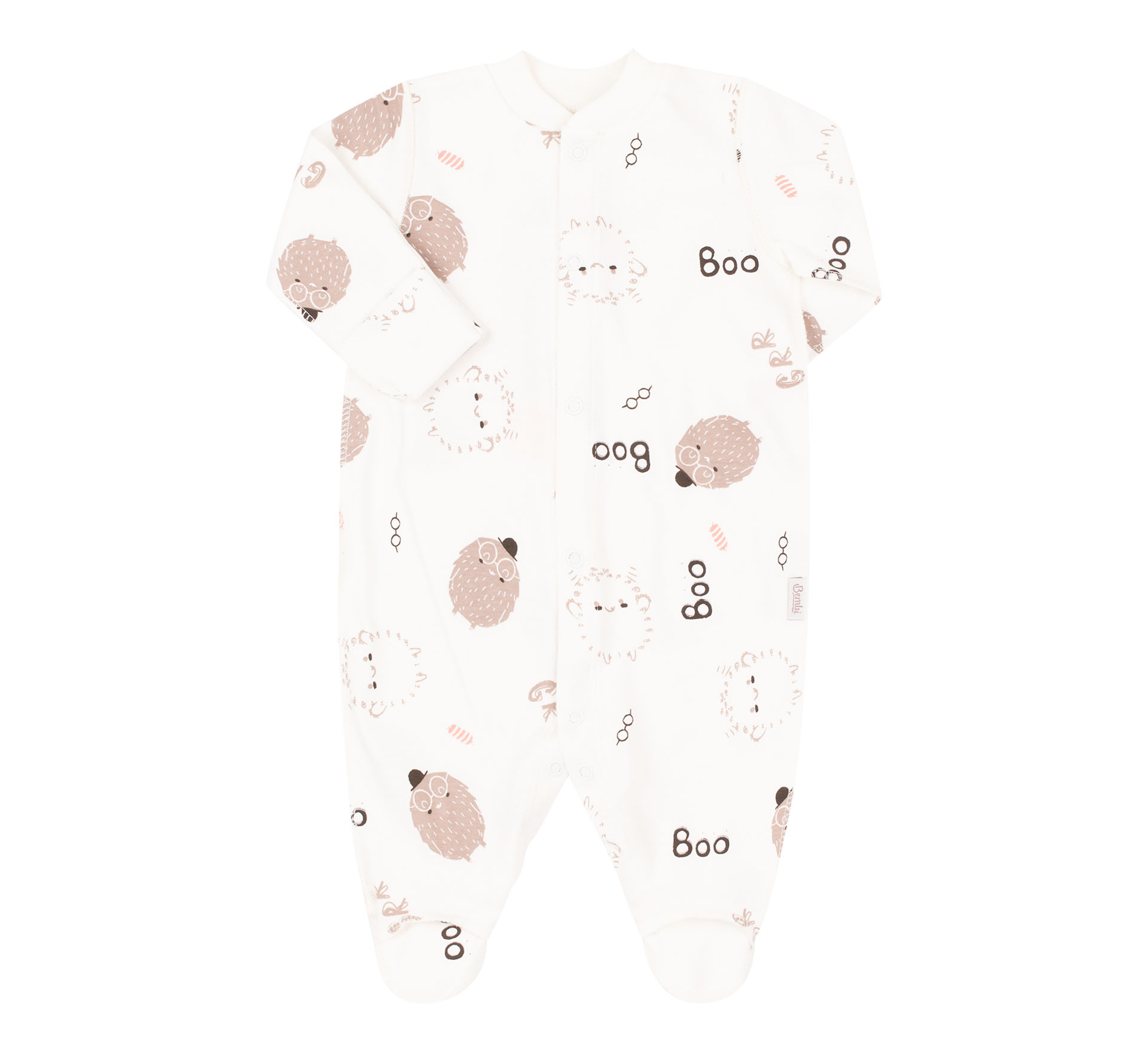 Молочный детский комбинезон человечек с принтом. Застёгивается на кнопочки по всей длине изделия, поэтому легко надевать. Длинный рукав имеет нашитые царапки, которые можно носить открытыми или закрытыми, что очень удобно для новорожденных. Ножки закрыты. Комбинезон сшит из натурального хлопкового трикотажа средней плотности и украшен стойким принтом.