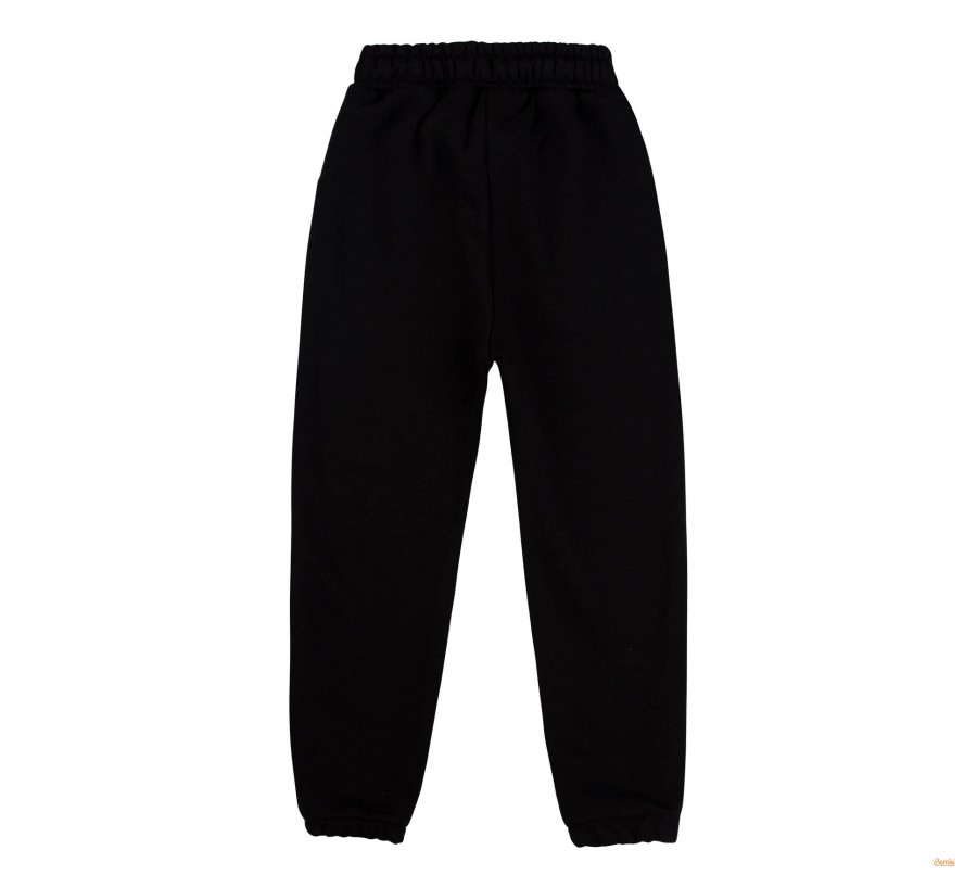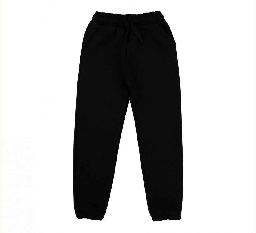 Детские черные штаны из трикотажа тринитка. Удобные спортивные штаны с боковыми карманами. Пояс и манжеты из основного материала с эластичной тесьмой. В поясе есть декоративные шнурочки. Удобные и стильные штаны для ребенка. Хлопковый трикотаж тринитка достаточно плотный, но хорошо пропускает воздух, поэтому подходит на любой сезон.