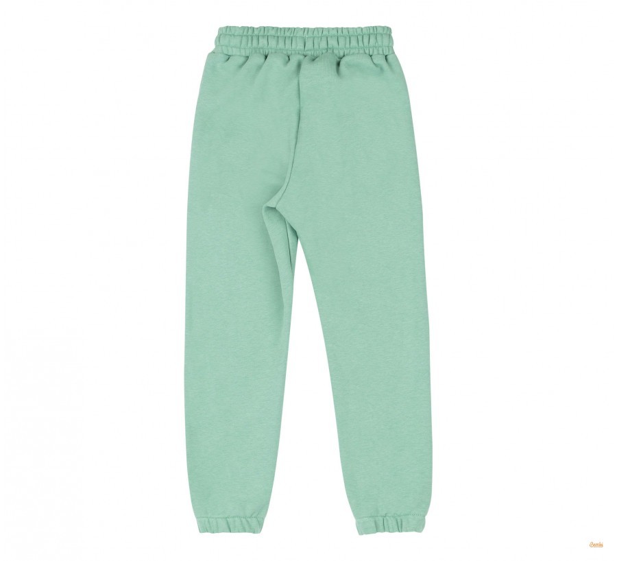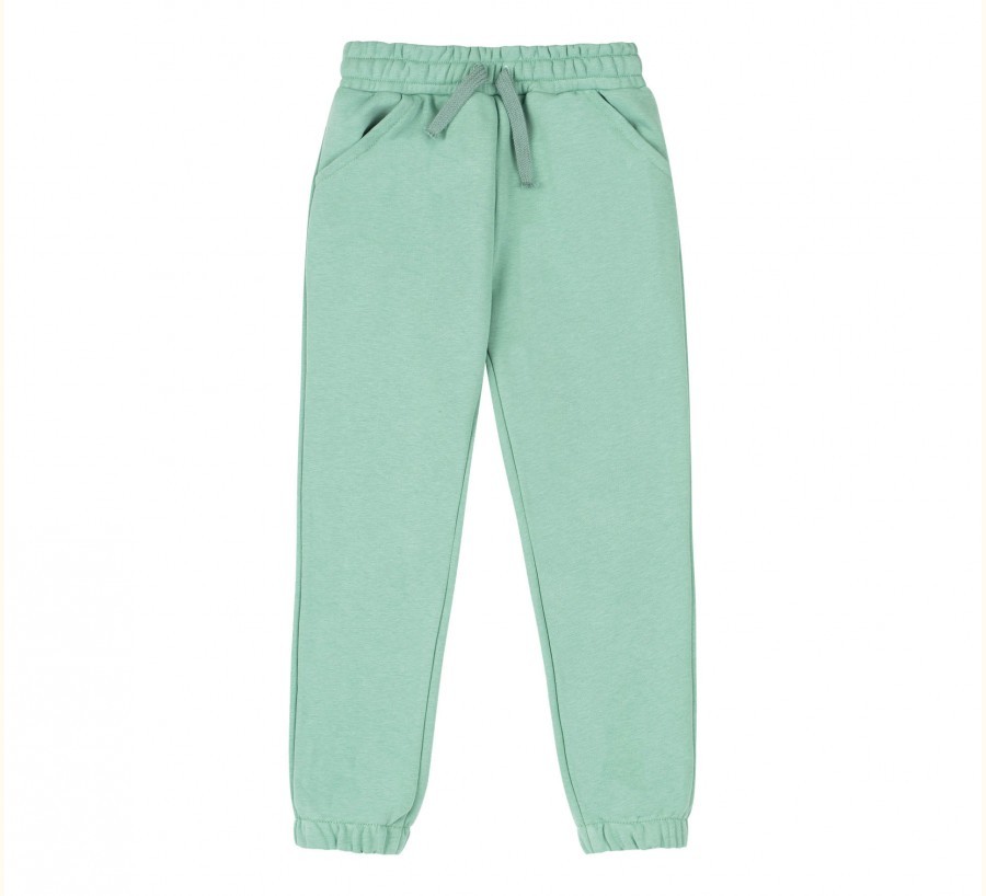 Детские мятные штаны из трикотажа тринитка. Удобные спортивные штаны с боковыми карманами. Пояс и манжеты из основного материала с эластичной тесьмой. В поясе есть декоративные шнурочки. Удобные и стильные штаны для ребенка. Хлопковый трикотаж тринитка достаточно плотный, но хорошо пропускает воздух, поэтому подходит на любой сезон.