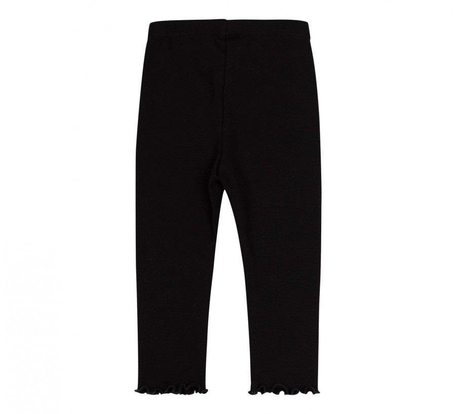 Детские черные леггинсы в рубчик. Край штанин украшен фигурным краем. Пояс на резинке. Удобные детские лосины для активных девочек.