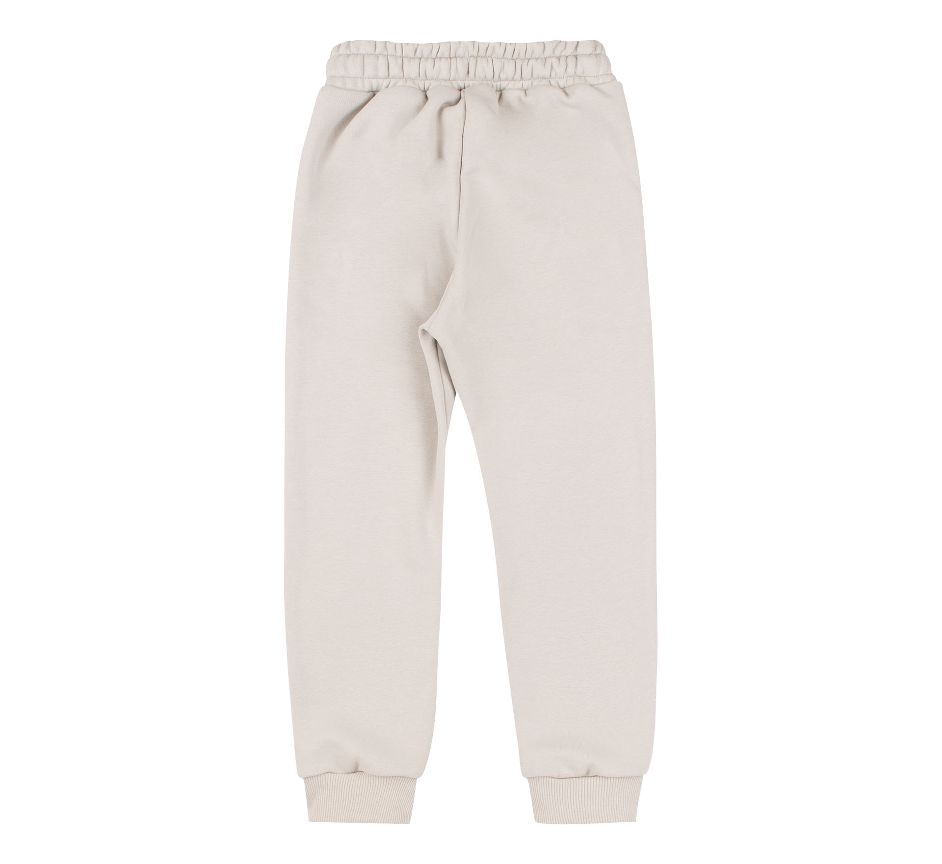 Бежевые спортивные штаны для мальчика. Украшены надписями. Сшитые из трикотажа тринитка. По бокам удобные карманы с косым входом. Пояс на резинке со шнурочками. Край штанов собран манжетами из трикотажа в рубчик.