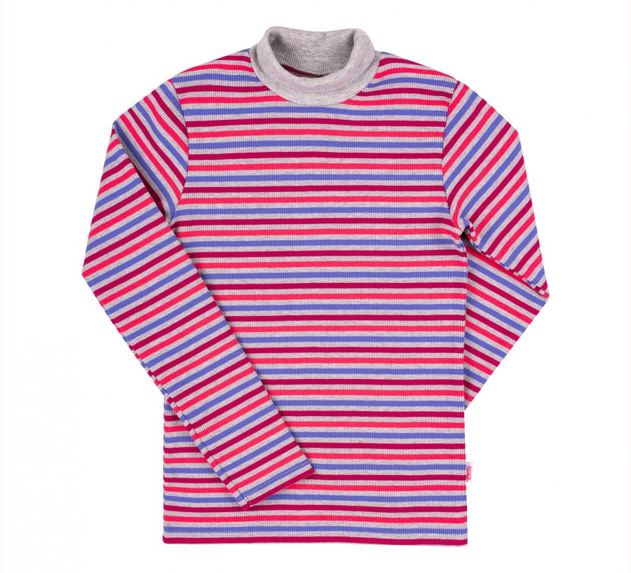Полосатый детский гольф в малиновую полоску. Сшит из фактурной эластичной ткани. Имеет высокую горловину с заворотом, длинный рукав и прямой крой.