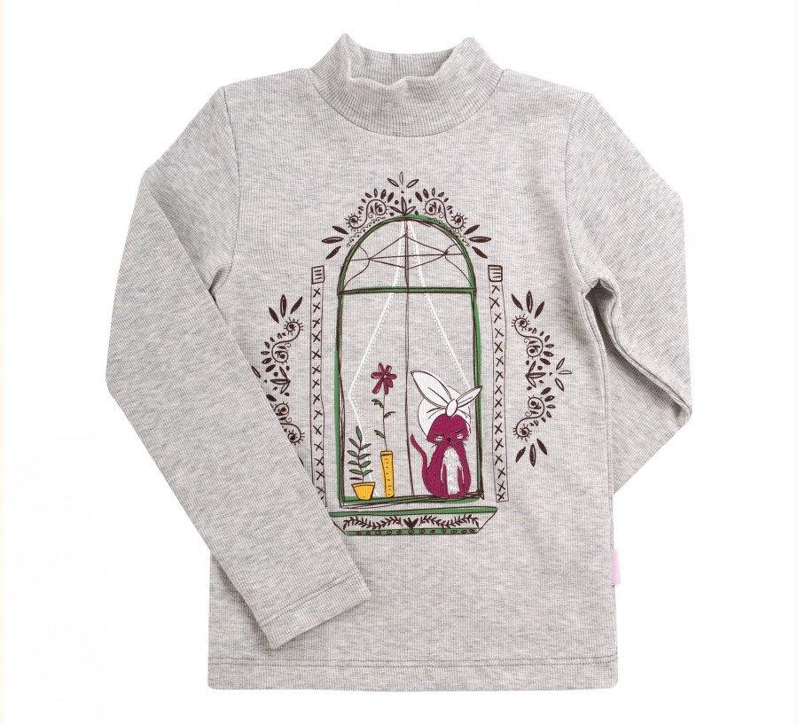 Детский серый гольф в рубчик с милым принтом для девочки. Имеет прямой крой и длинный прямой рукав. Горловина оформлена горловиной стойкой без заворота. Трикотажная ткань в рубчике хорошо эластичная и проста в уходе.