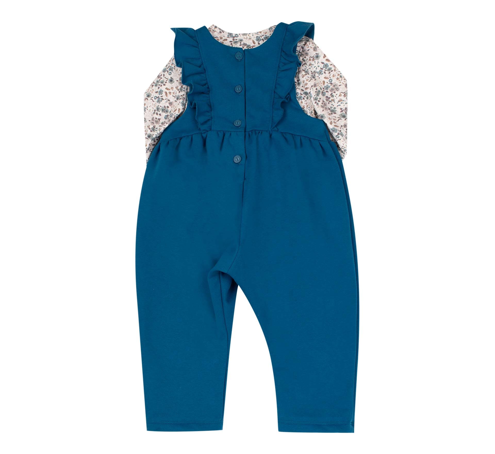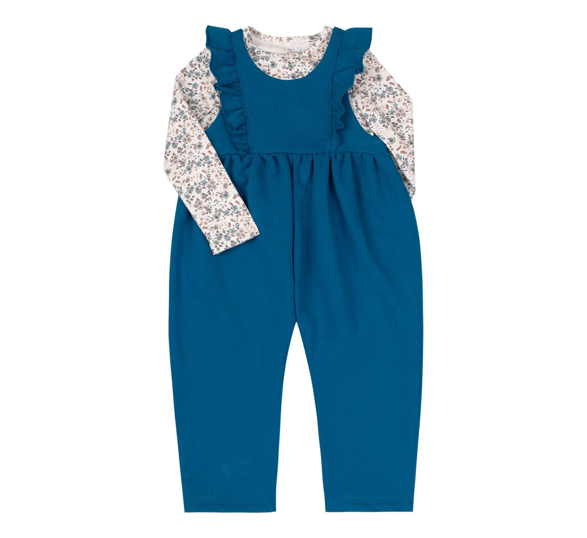 Детский комплект для девочки. В состав входят: бирюзовый комбинезон и кофта в цветочек. Комбинезон пошит из теплого трикотажа с начесом, а кофта из хлопкового трикотажа средней плотности. Комбинезон украшен оборками, которые переходят из полочки на спинку, застегивается на спине на пуговицы. Кофта лаконичная, с прямыми длинными рукавами, круглой горловиной и застежкой на плече на кнопочки, чтобы удобно было надевать.