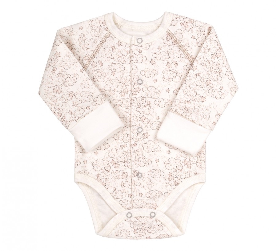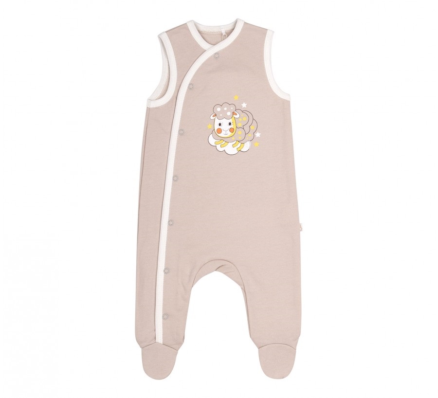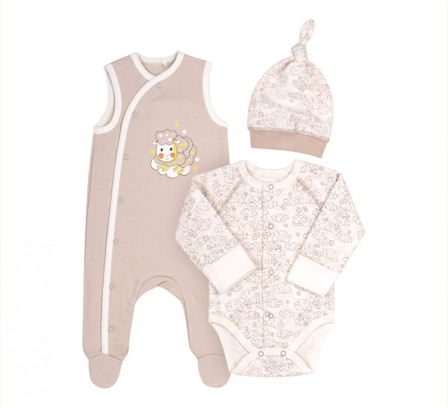 Бежевый байковый детский комплект для малыша. Сшит из нежной к телу байки. Состоит из комбинезона без рукавов (ползунки), бодика с длинным рукавом и шапочки с узелком. Ползунки застегиваются на кнопочки и украшены принтом.