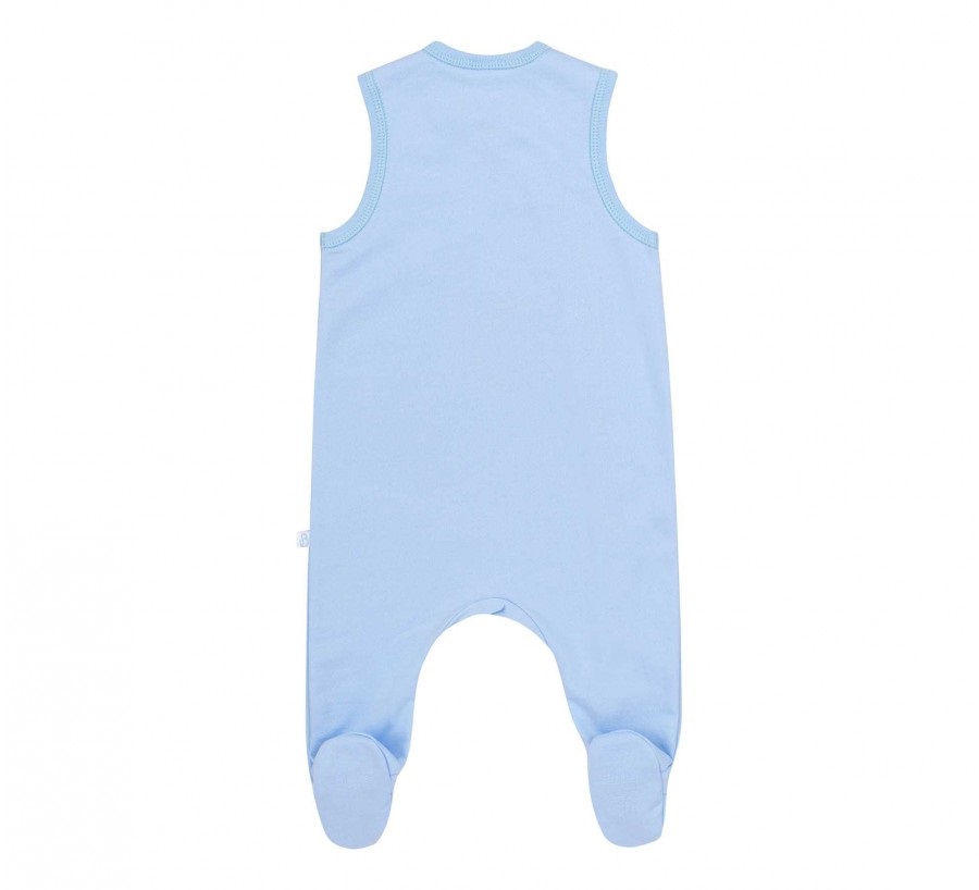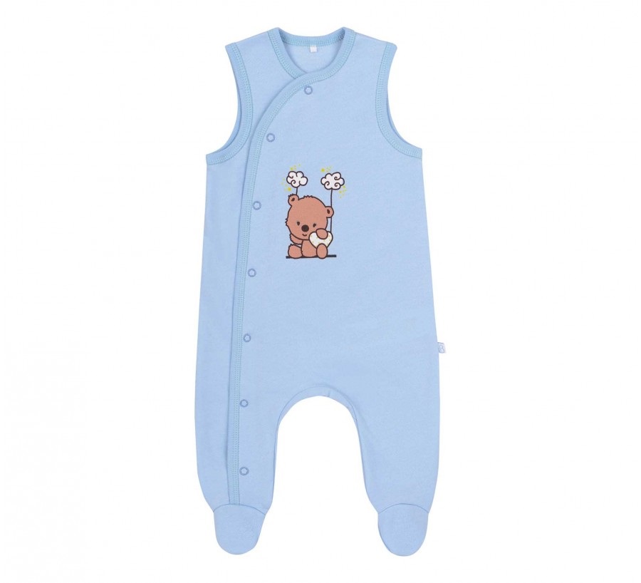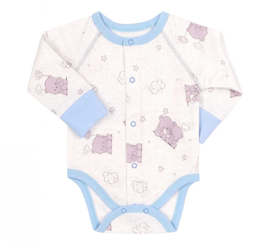 Голубой байковый детский комплект для малыша. Сшит из нежной к телу байки. Состоит из комбинезона без рукавов (ползунки), бодика с длинным рукавом и шапочки с узелком. Ползунки застегиваются на кнопочки и украшены принтом с мишкой.