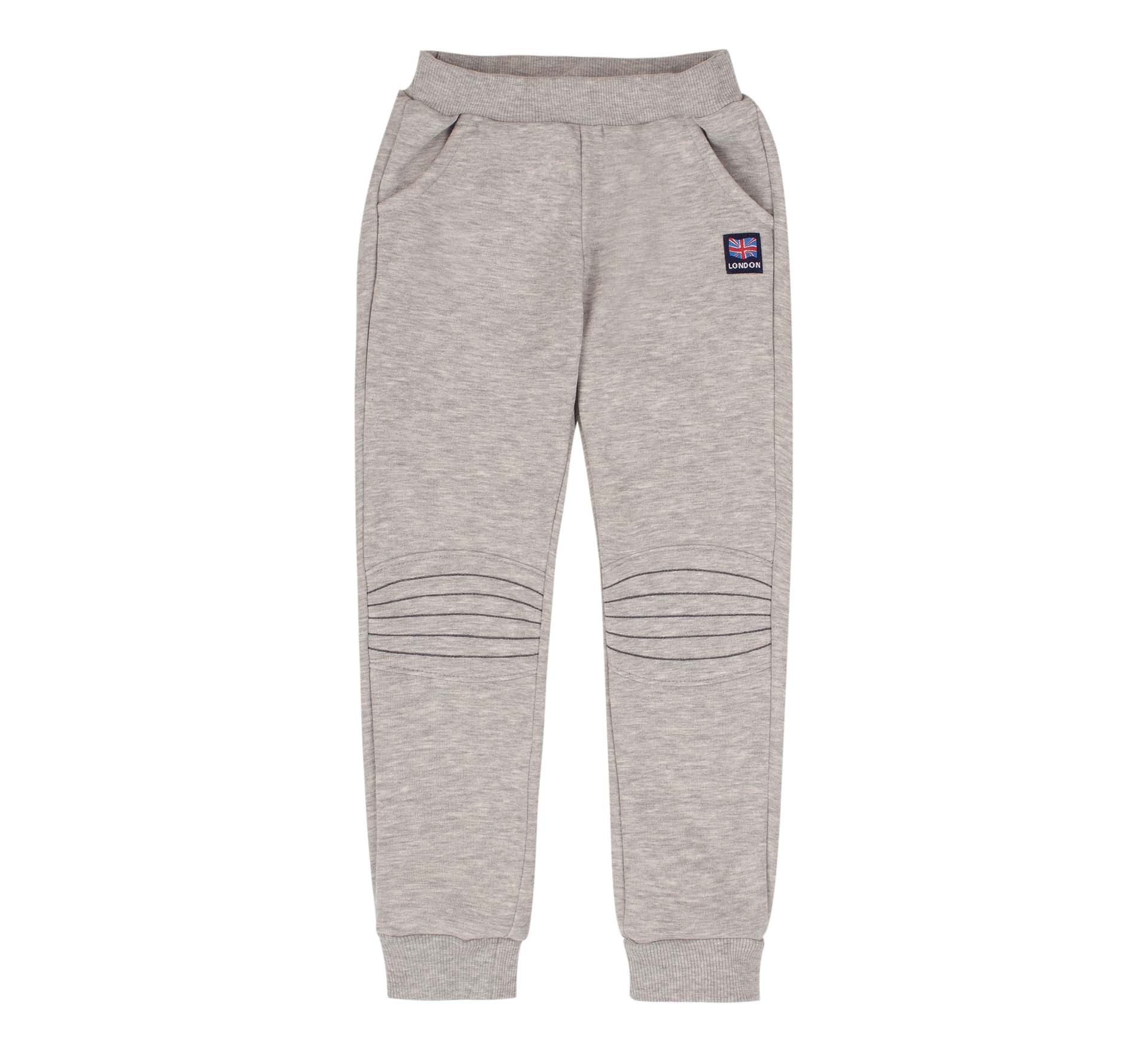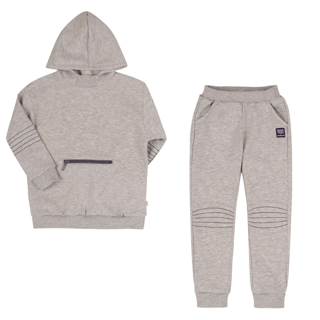 Серый детский костюм на флисе. Состоит из кофты с капюшоном и спортивных штанов с боковыми карманами. Сшитый из теплого трикотажа с начесом. На рукавах и коленях украшен полосатыми вставками. Край кофты, рукавов и штанов собраны манжетами. Теплый и удобный костюм для мальчика.