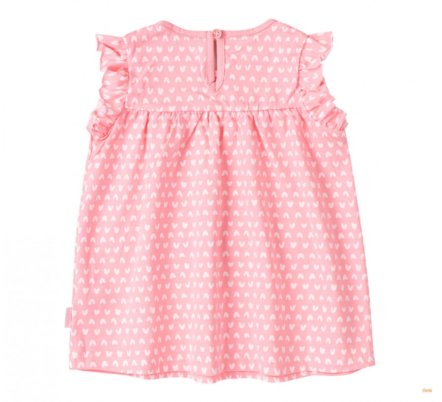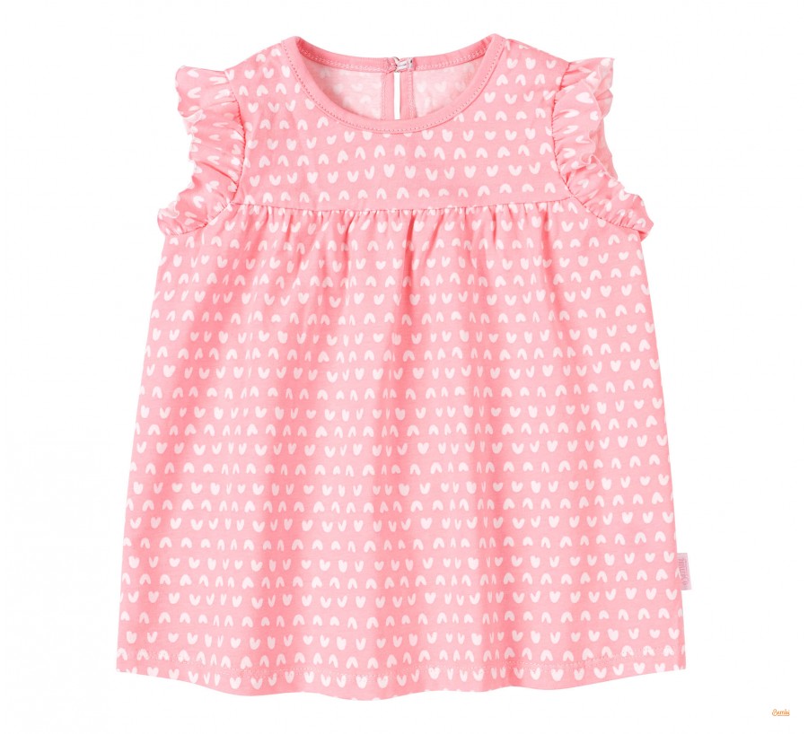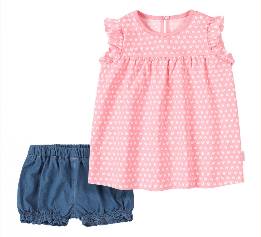 Детский летний костюм девочкам. Состоит из розовой футболки с принтом и джинсовых шорт. Футболка без рукава с рюшами на плечах и застегивается сзади на пуговицу. Шортики короткие, с рюшами по краю. Легкий, удобный и просто милый детский костюм на лето.