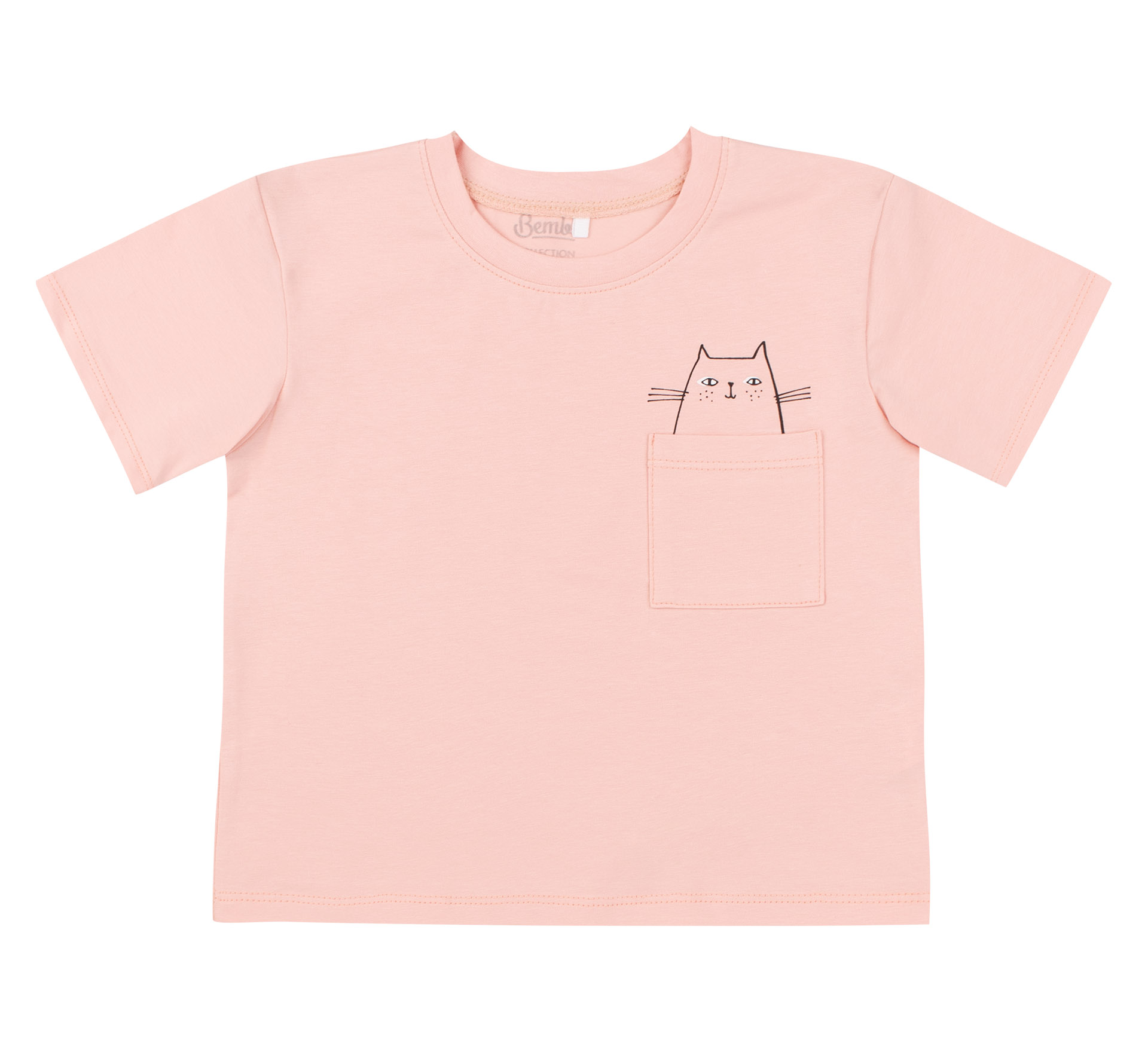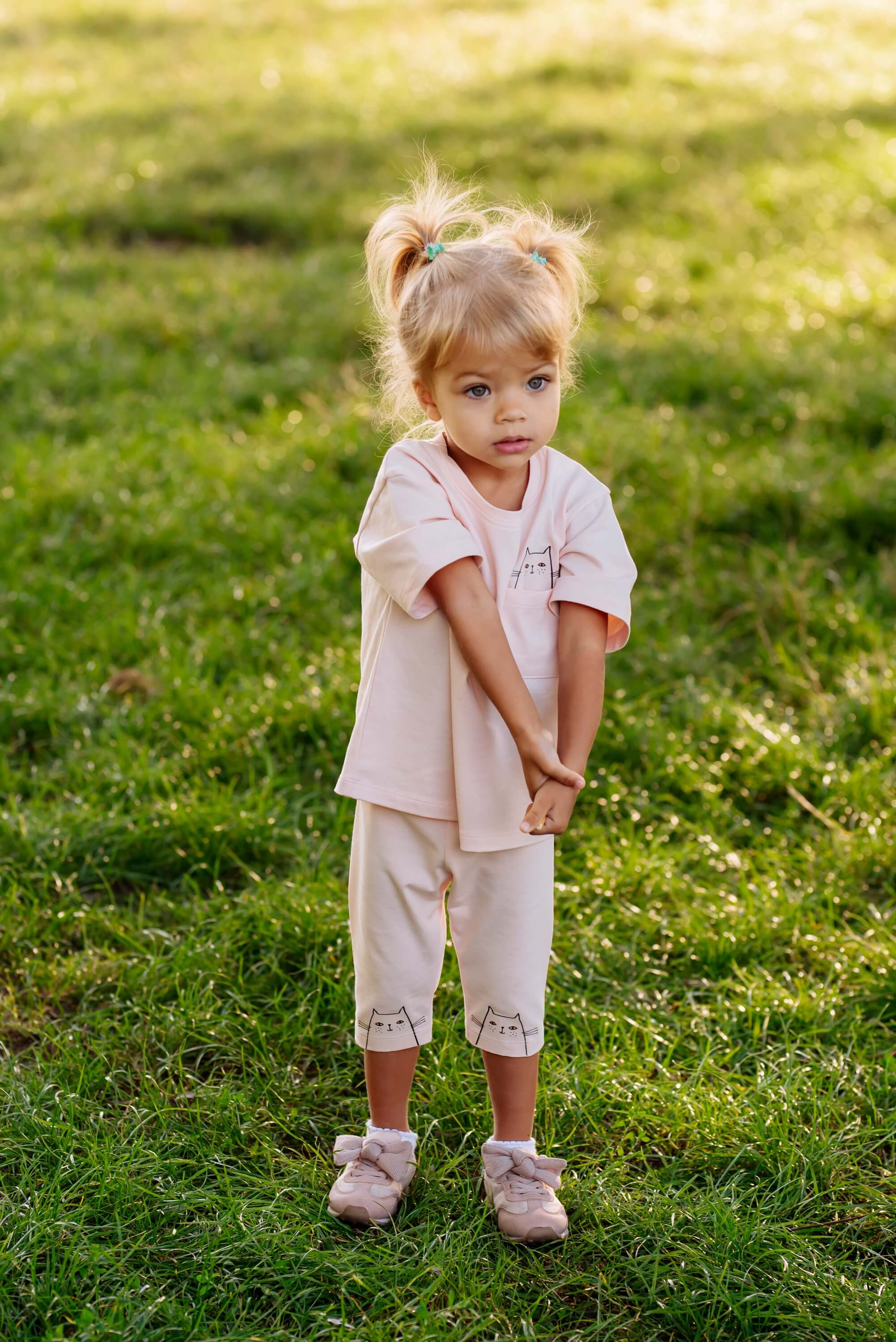 Персиковый летний детский костюм для девочек. Состоит из футболки и шорт с оригинальным принтом Котики. Сшитый из тонкого хлопкового трикотажа, легкий, удобный, ткань не парит. Шорты на эластичном поясе с принтом на коленях. Футболка свободная, с накладным карманом и принтом.