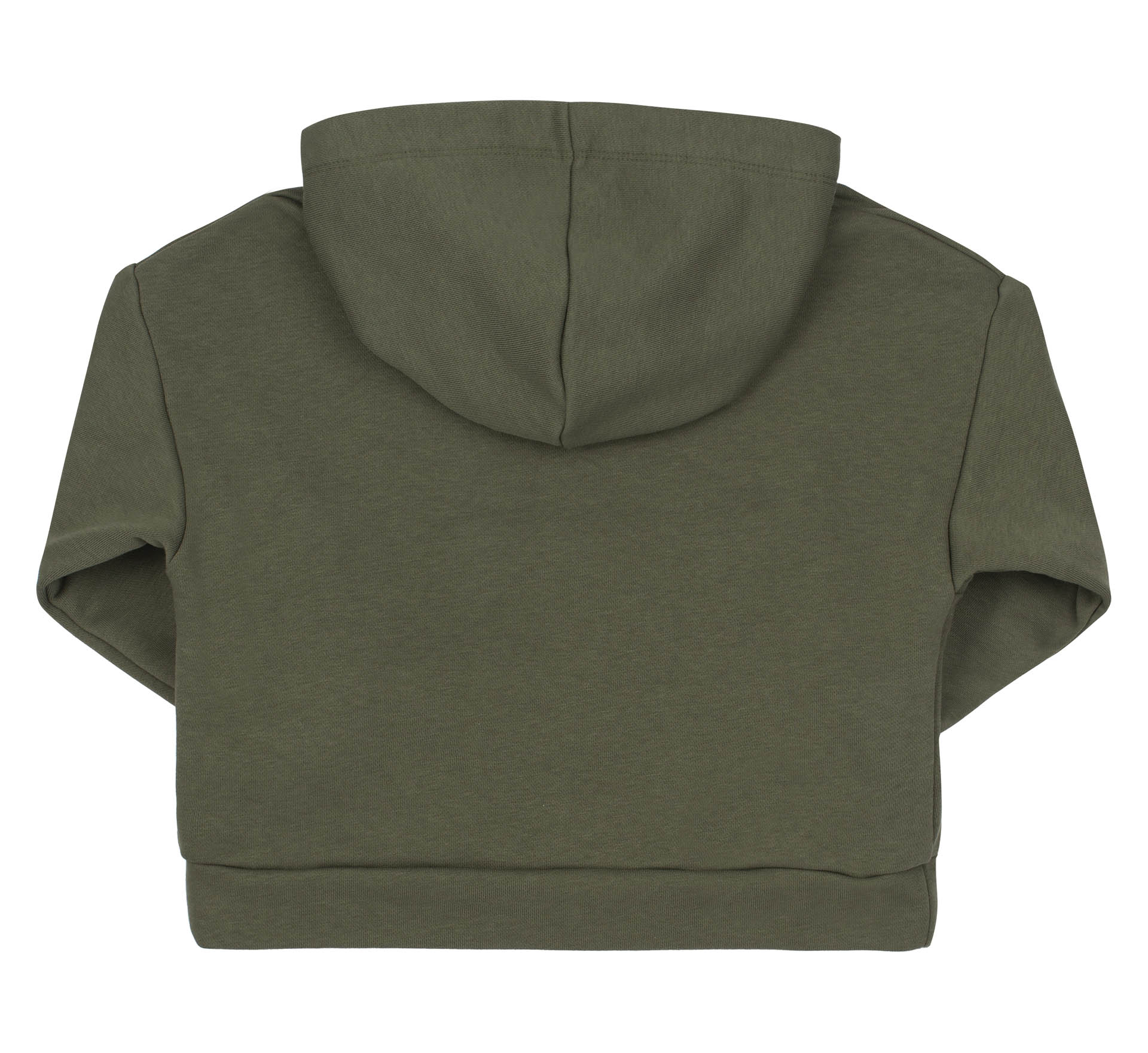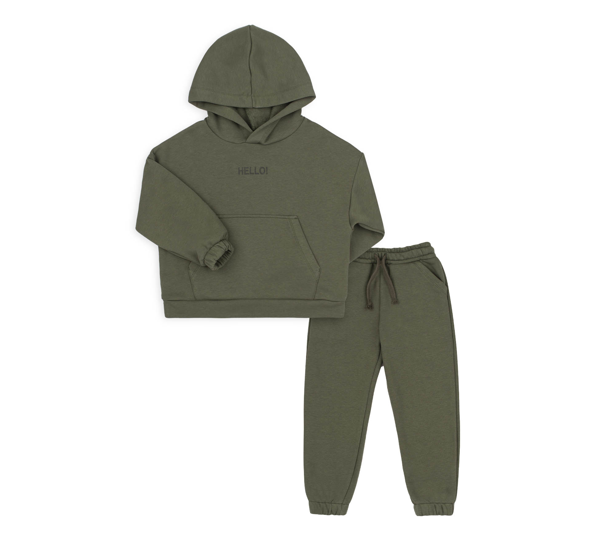 Детский костюм хаки из трикотажа тринитка. Состоит из кофты с капюшоном и спортивных штанов. Детское худи украшено надписью Hello! Имеет удобный карман кенгуру и длинный собранный по краю рукав. Штаны с эластичным поясом и собраны по краю, по бокам имеют карманы с косым входом. Ткань на детский спортивный костюм использована хлопковая и плотная. Тринитка великолепна тем, что при плотности отлично пропускает воздух, поэтому подходит на разный температурный режим.