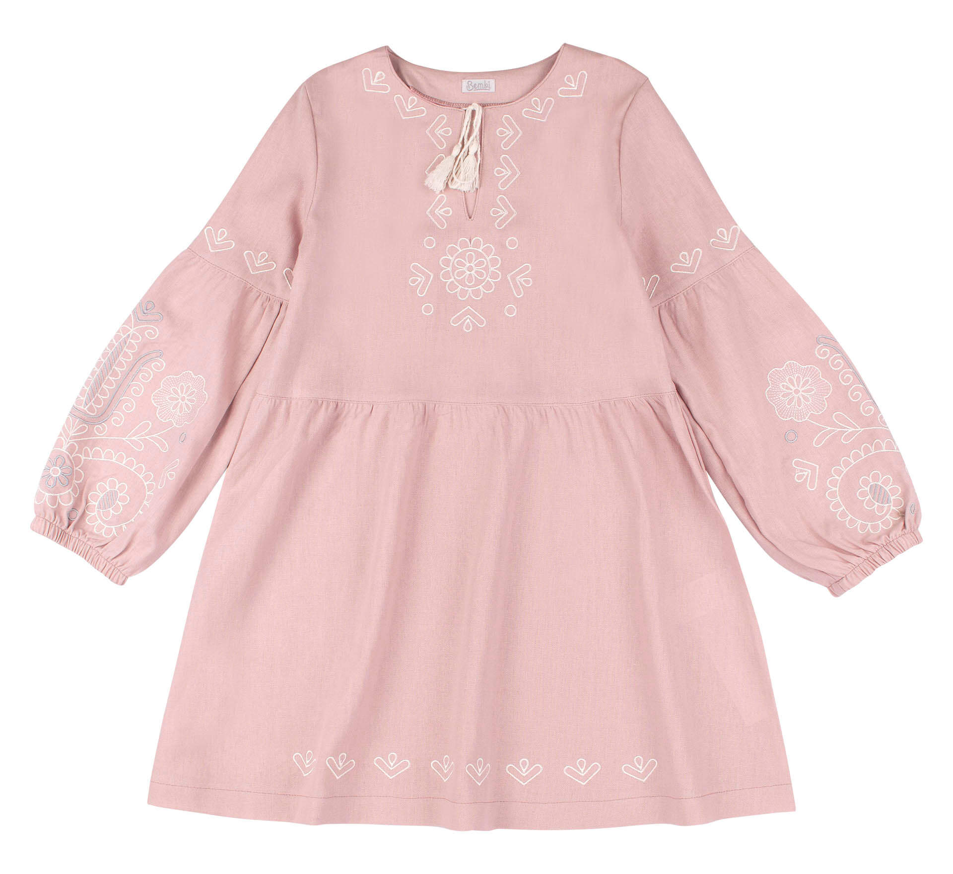 Бежевое вышитое детское платье из льна. Натуральная ткань отлично пропускает воздух, не парит, красиво смотрится. Детское платье имеет пышный длинный рукав, собранный по краю резиночкой. Горловина, рукав и низ изделия украшены узорами вышитыми нитями. Горловина имеет небольшой разрез с завязками из ниток в тон вышивки. Покрой платья свободный, с отрезной талией.