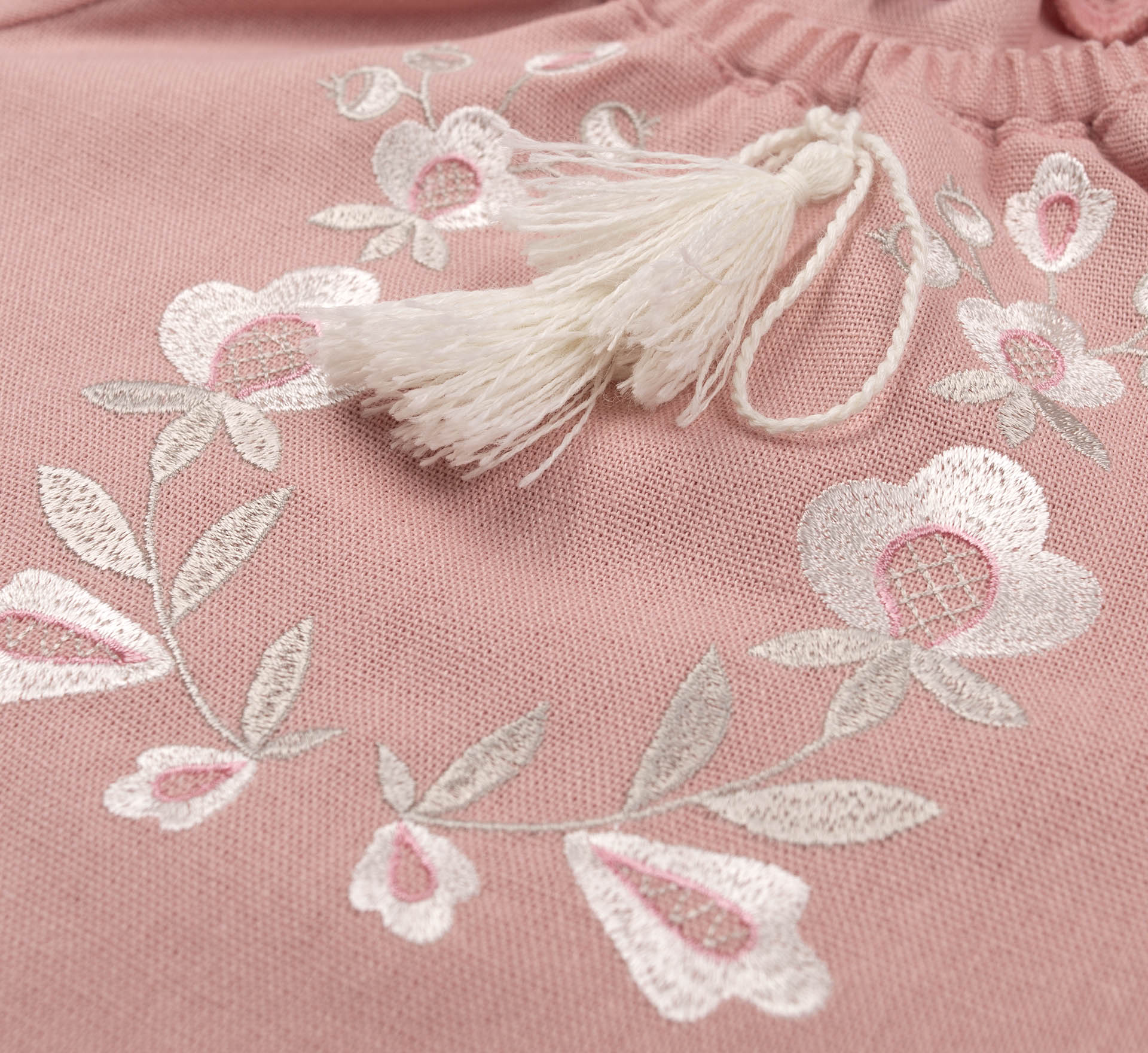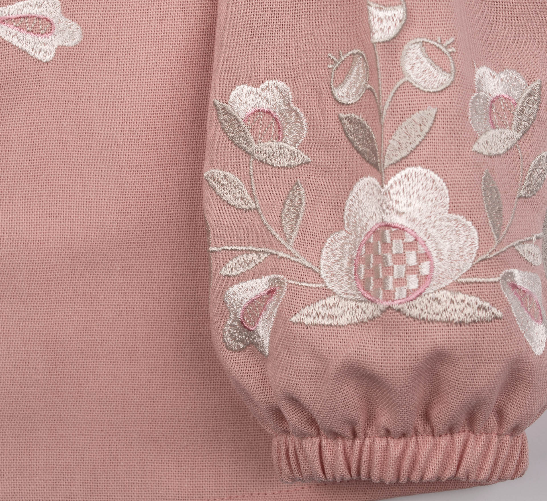 Детская льняная вышиванка для девочек. Сшита из льна розового оттенка. Украшена вышитыми ниточками узорами и завязками из ниток. Имеет пышный длинный рукав. Детская вышитая рубашка создает нарядный образ, а благодаря натуральной ткани дарит максимум комфорта!