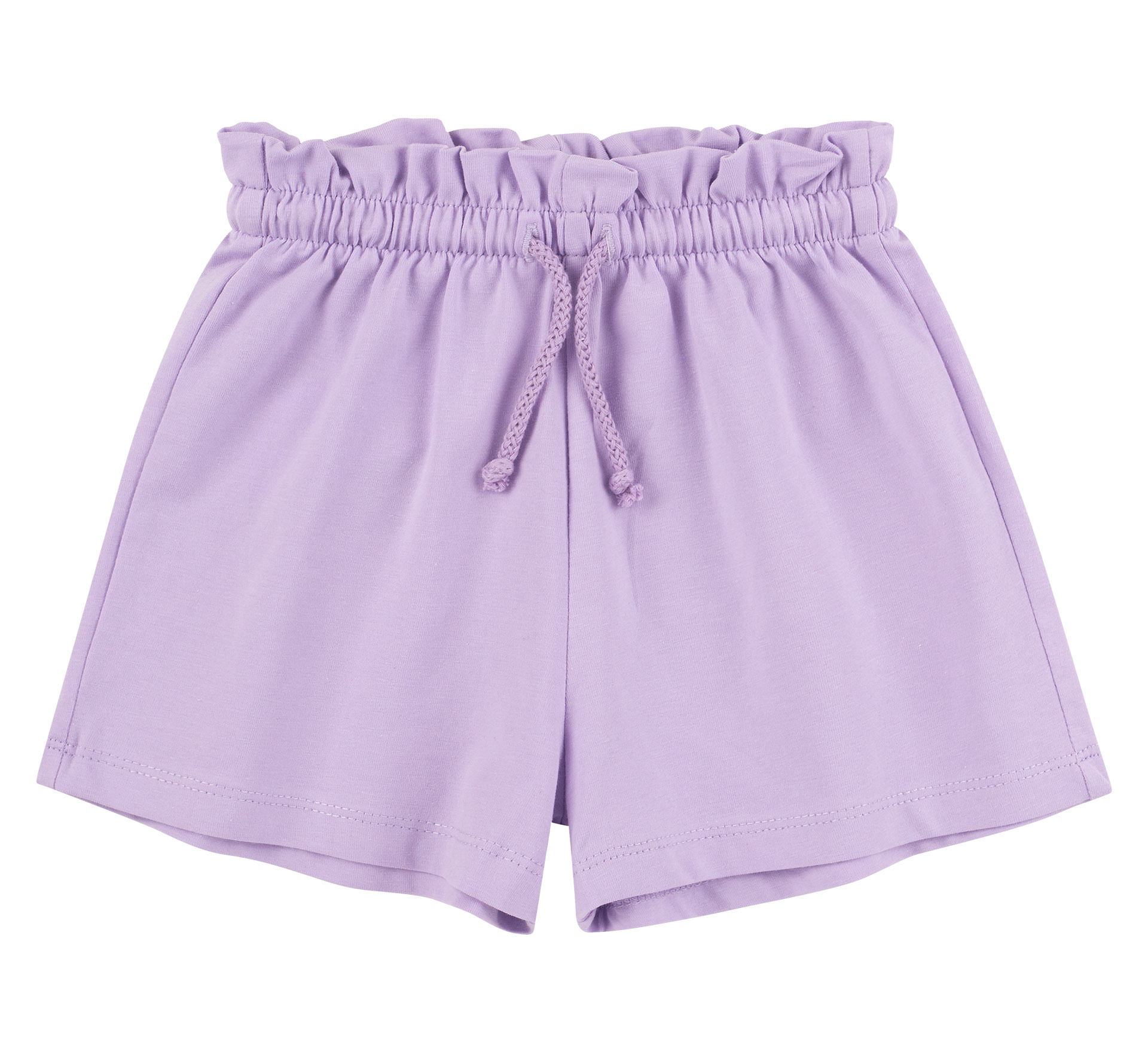 Детские сиреневые шорты. С высокой посадкой и поясом на резинке. Пояс также имеет шнурок для регулировки охвата. Шорты сшиты из легкого материала. Прекрасно дополнят летний гардероб маленькой красавицы.