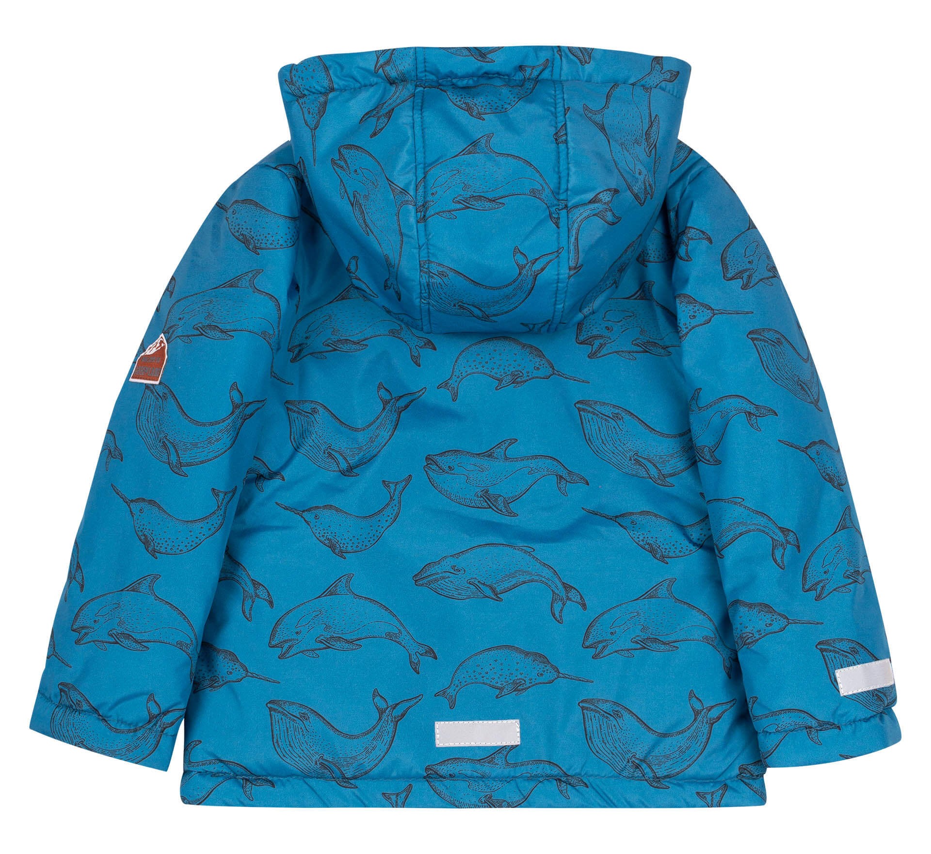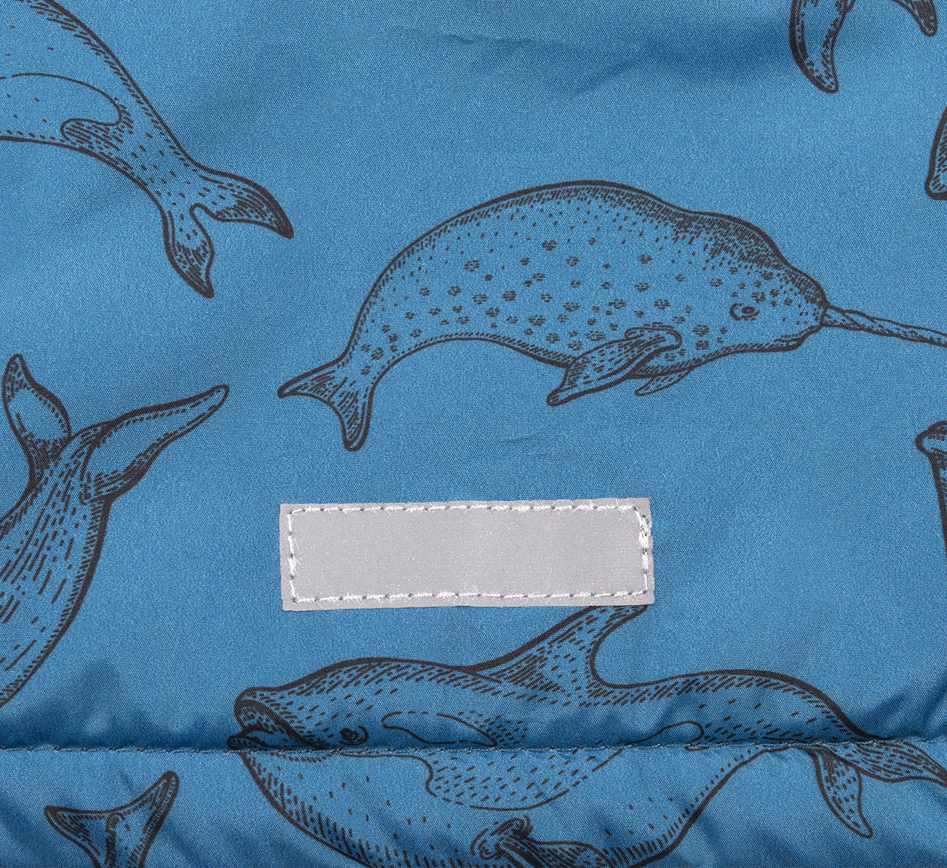 Синяя осенняя детская куртка с принтом с различными рыбами. Застегивается на замочек, который вверху закрыт, чтобы не пристегнуть бородку. Длинный рукав прямой по краю, а внутри вшита трикотажная манжета, защищает ребенка от ветра. По бокам удобные карманы. На рукаве и внизу на спине нашиты светоотражающие элементы. Капюшон регулируется по обхвату. Детская куртка с утеплителем и на флисовой подкладке.