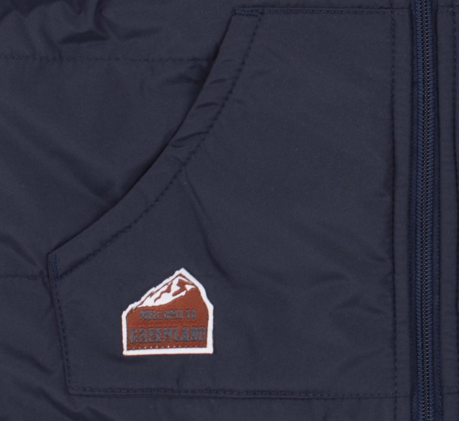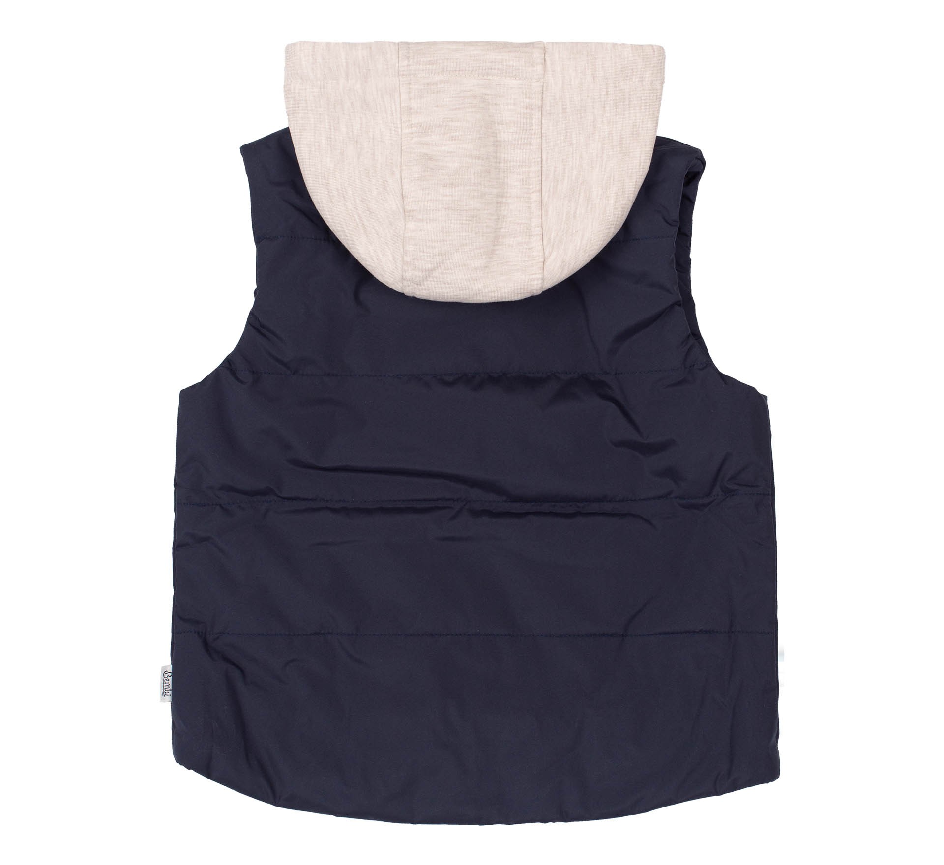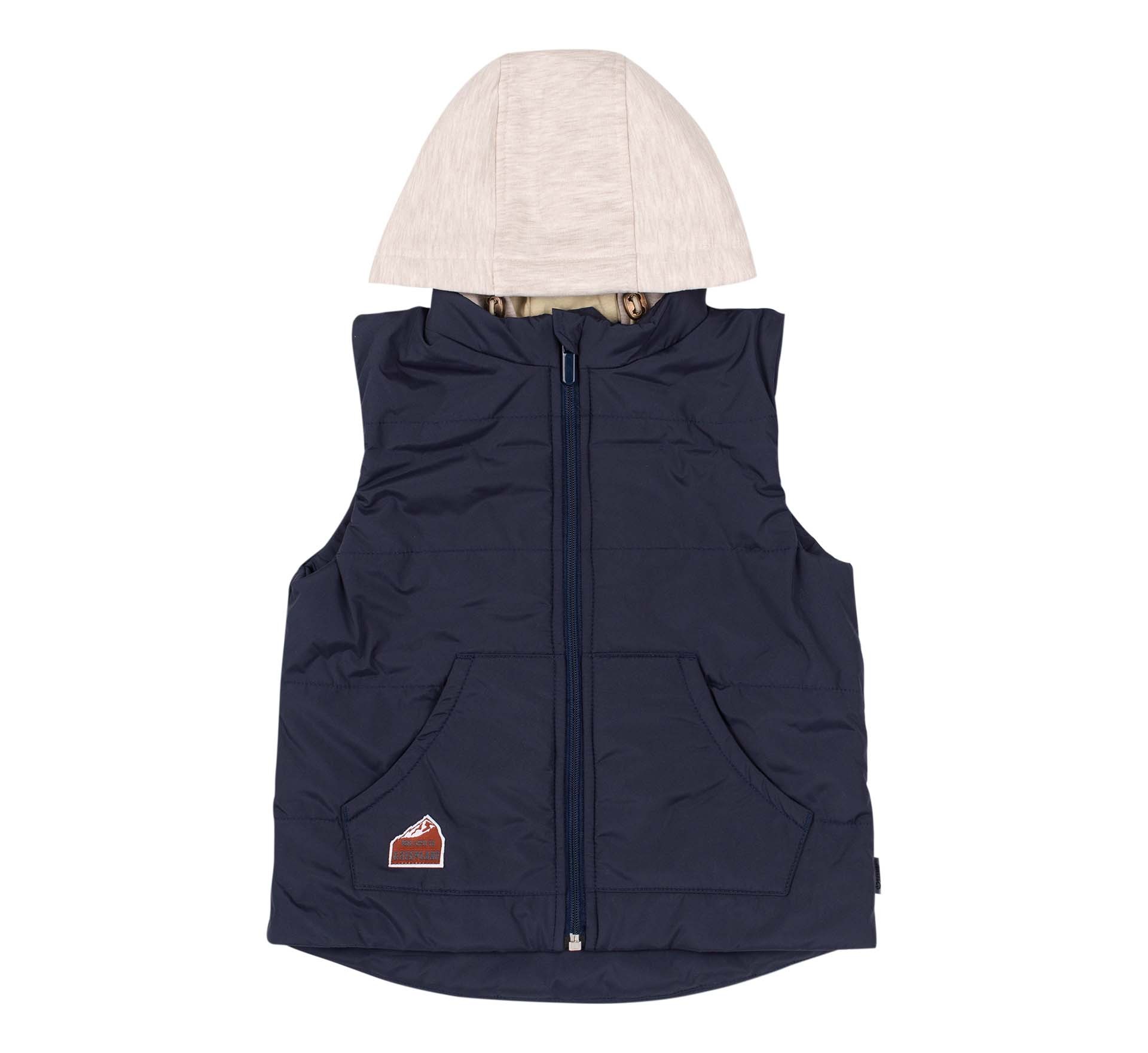Синяя детская жилетка с трикотажным капюшоном. Спереди имеет удобные накладные карманы и украшена лаконичной нашивкой. Спинка удлиненная с закругленным краем. Капюшон регулируется по обхвату. Детская теплая безрукавка застегивается на замочек. Имеет петельку для удобного хранения.