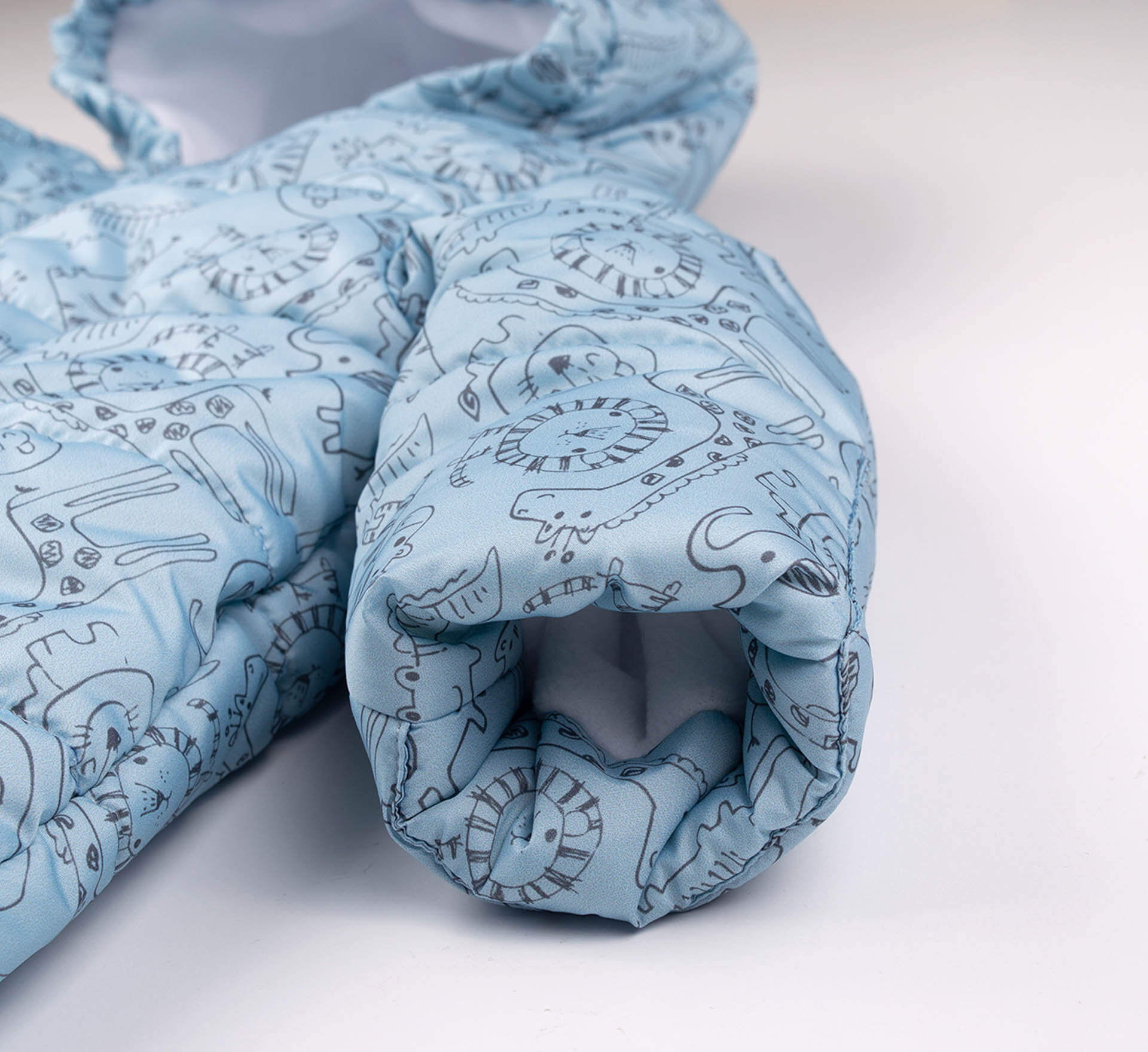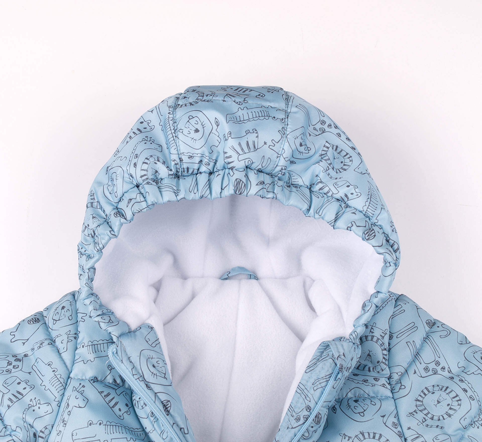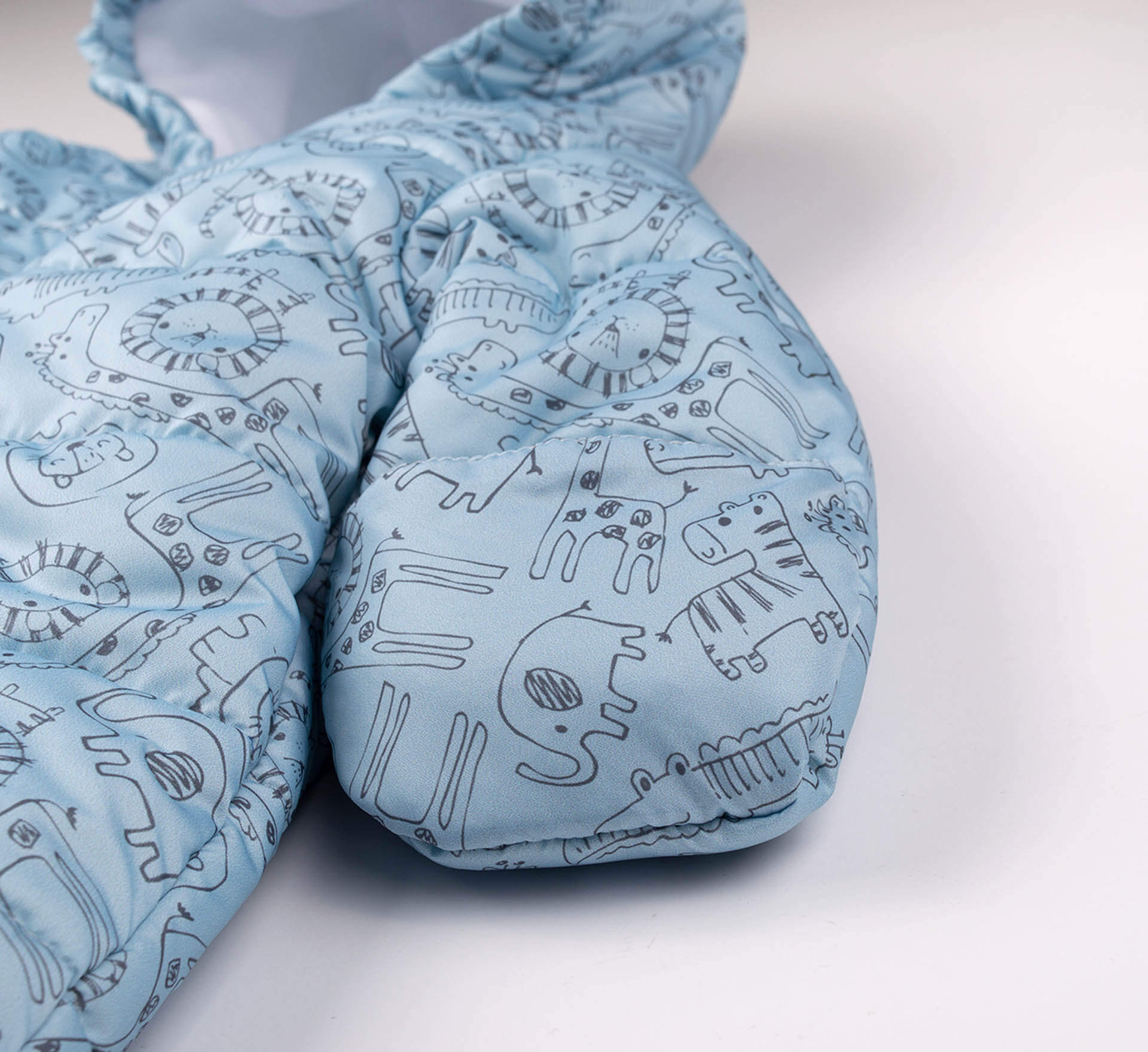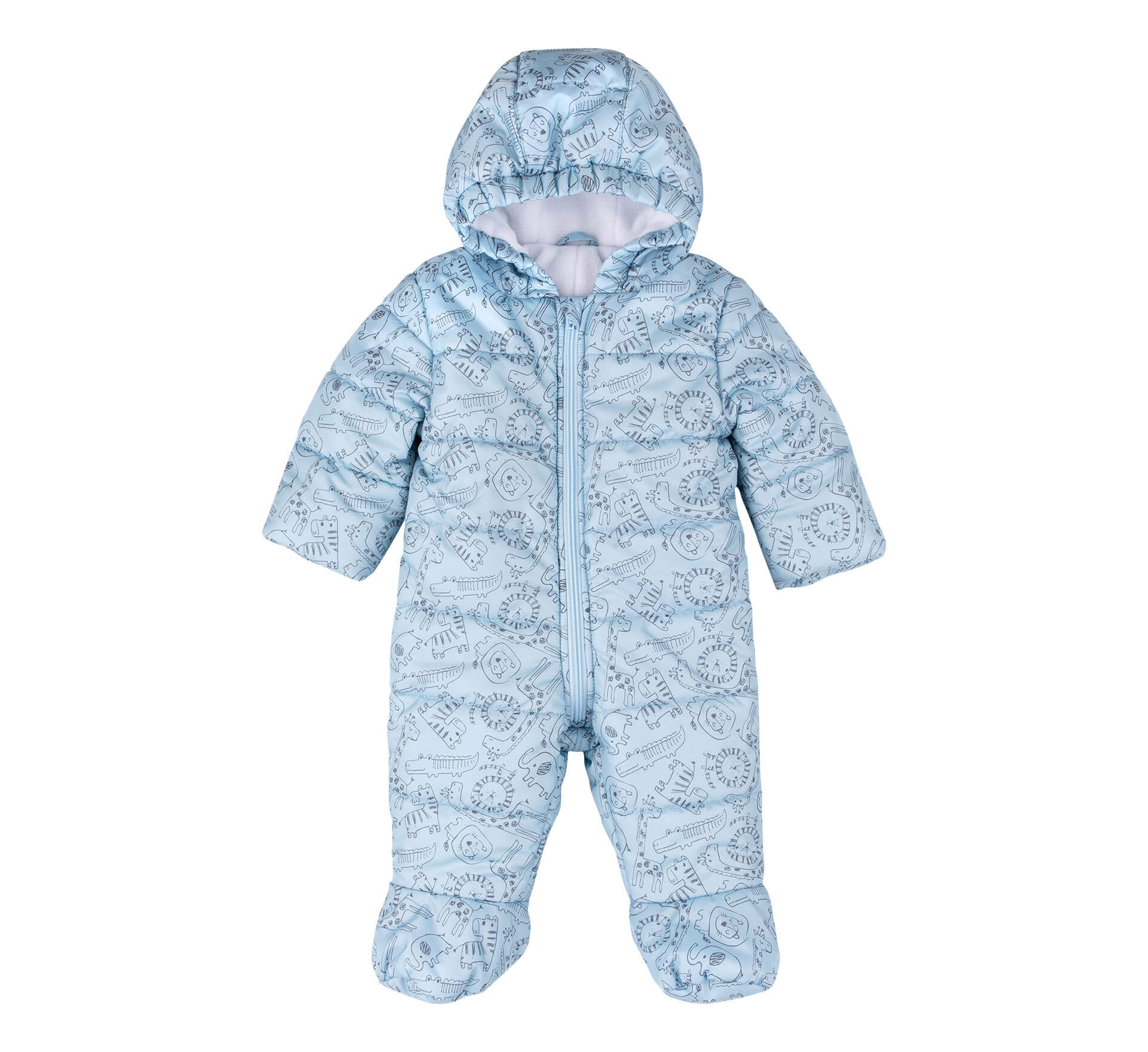 Теплый голубой зимний детский комбинезон с принтом. Имеет закрытые ножки и нашитые варежки на край рукава (можно носить завернутыми или открыв ручки). Застёгивается на замочек с защитой бородки. Капюшон собран по краю.
