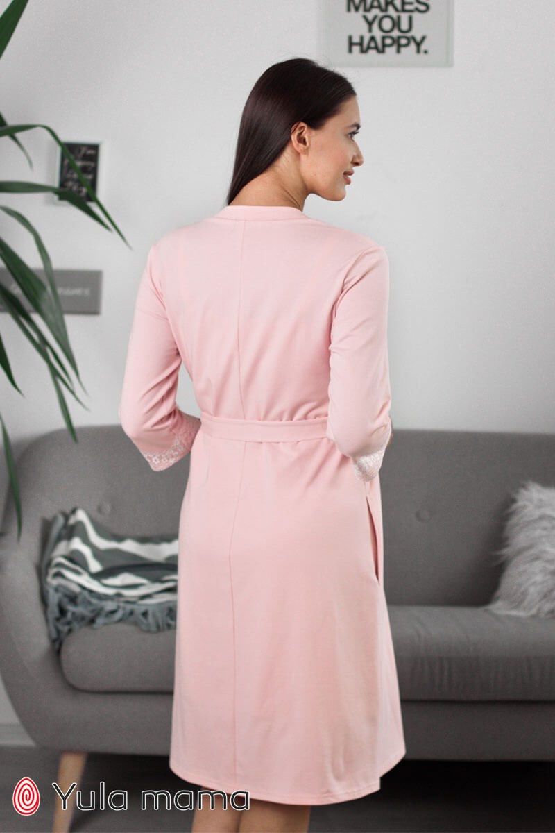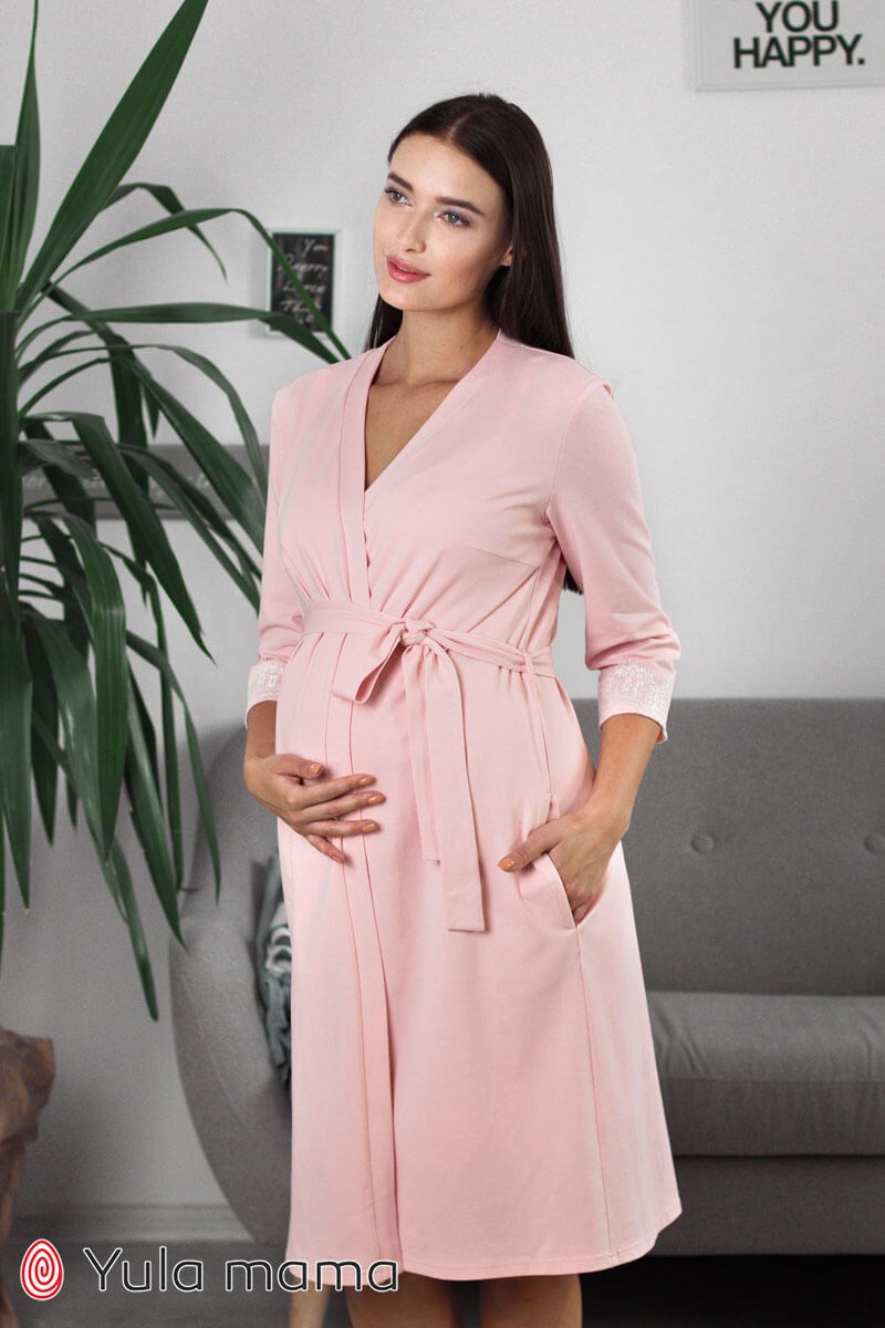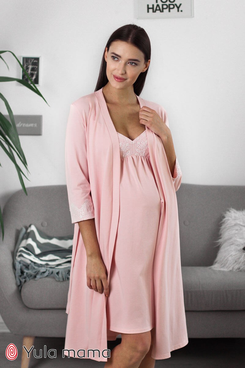 Комплект для беременных и кормящих из хлопкового трикотажа цвета пудра. В комплект входит халат и ночнушка украшенные кружевом. Халат фасона на запах, с поясом, А-силуэта, свободный, имеет рукав длиной три четверти. Ночнушка на бретельках, со свободным низом и облегающим лифом с поддержкой груди (можно не использовать бюстгальтер), лиф оснащен специальными клипсами для кормления малыша.