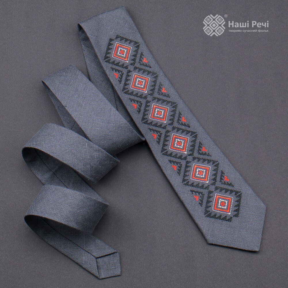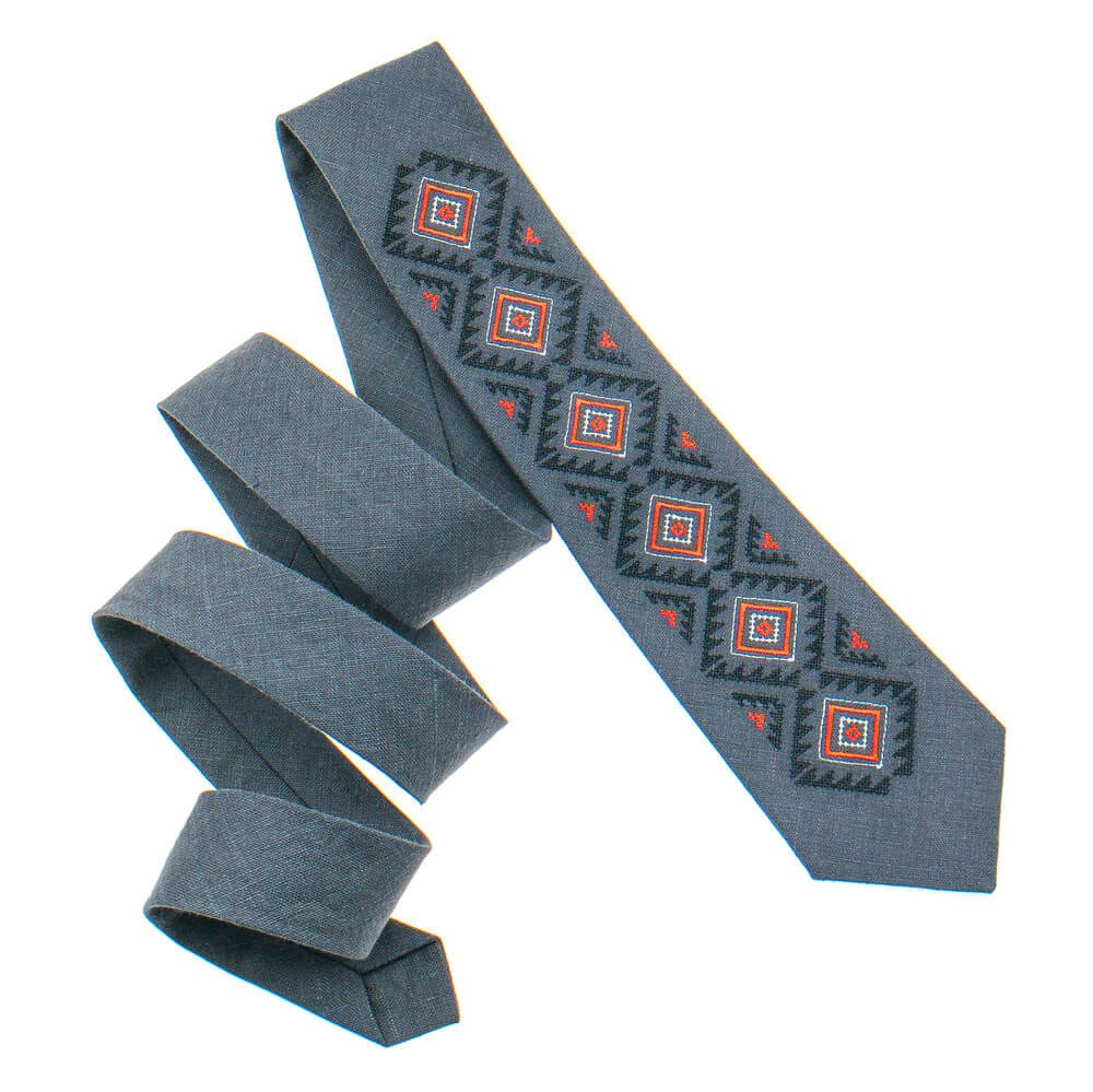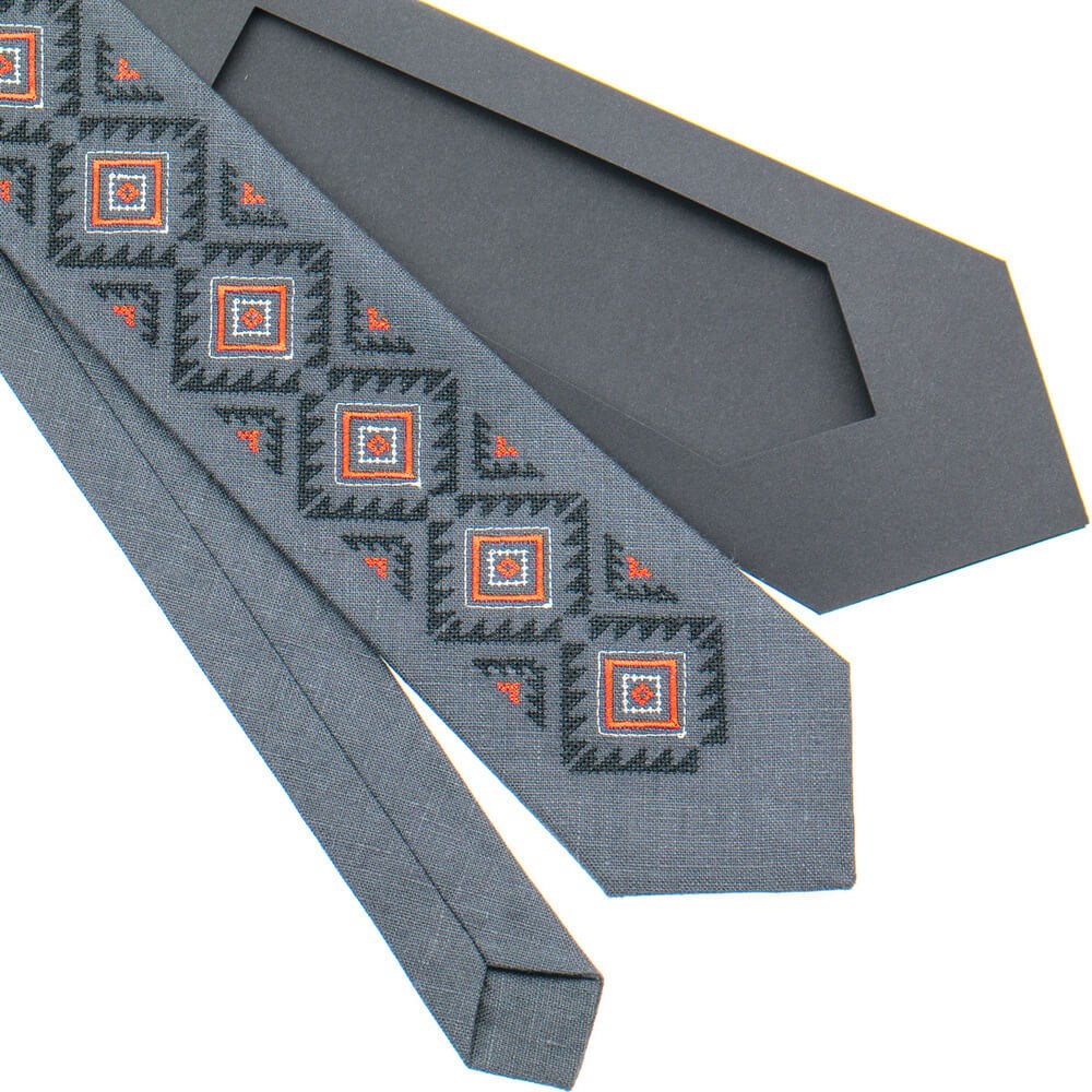 Вышитый галстук №928. Современная классическая модель галстука. Галстук - это необходимый аксессуар для делового человека. Материал галстука - натуральный лен темно-серого цвета. Длина изделия: 145 см. Сочетайте прошлое и современность вместе с интернет-магазином МамаТато!