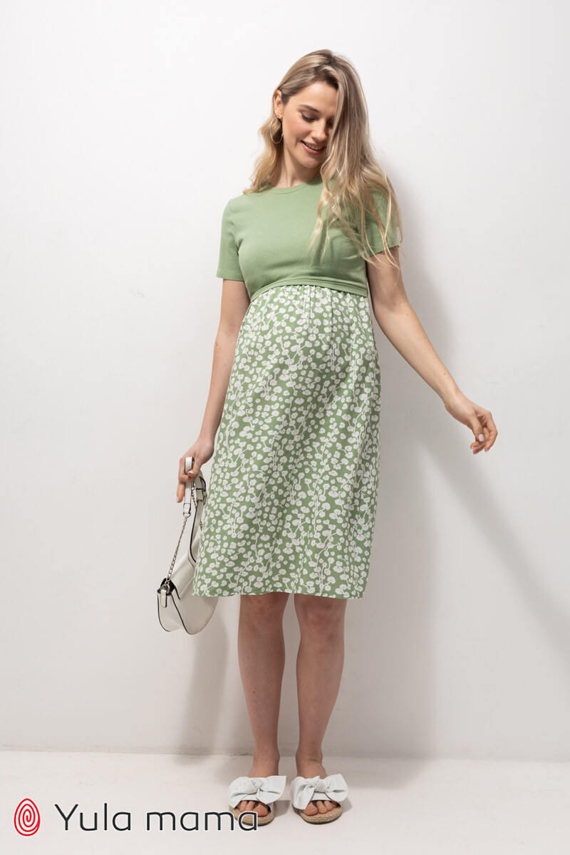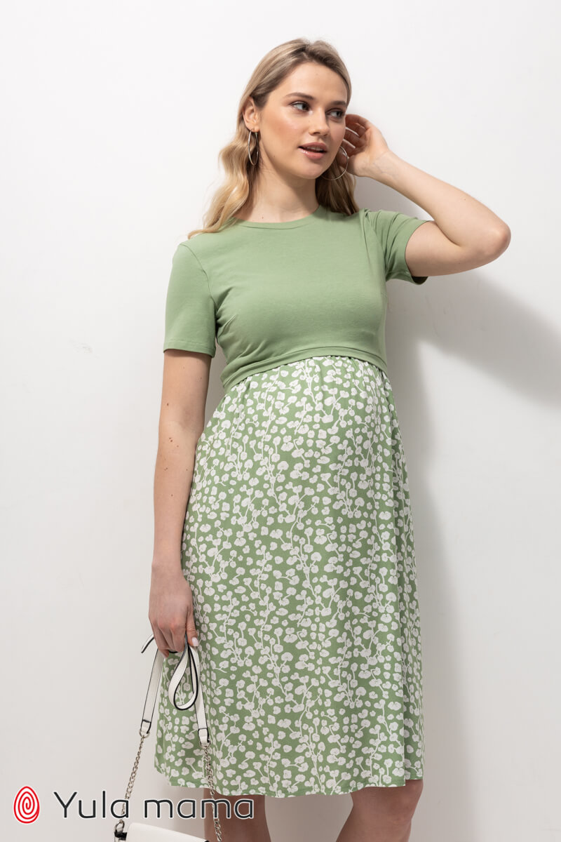 Невероятно удобное платье беременным и кормящим с оливковым трикотажным лифом и юбкой из штапеля в цветочек. Короткий рукав и лаконичная круглая горловина прекрасно сочетаются со свободным кроем. Секрет кормления: верхняя часть полочки находит на нижнюю.