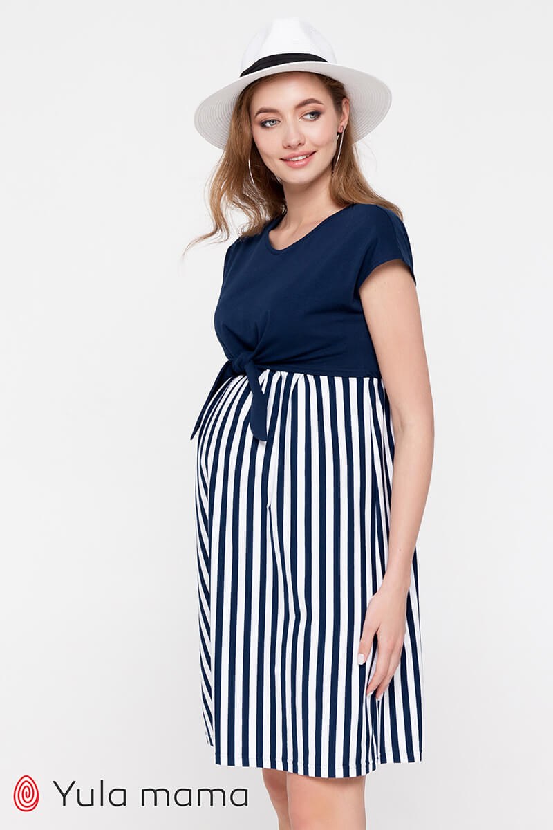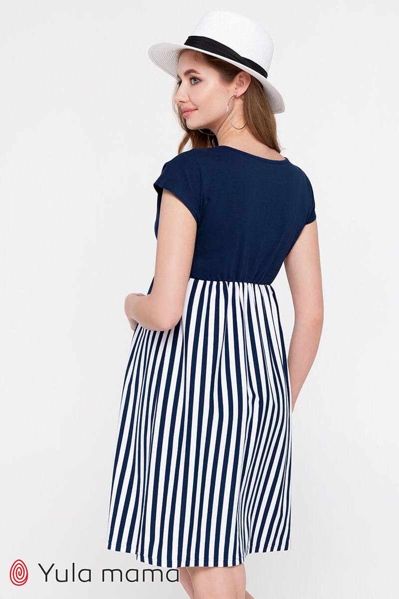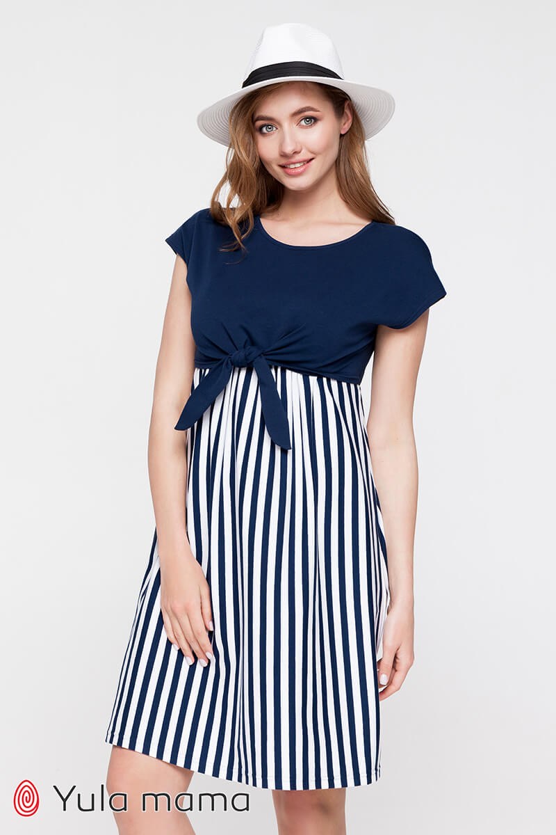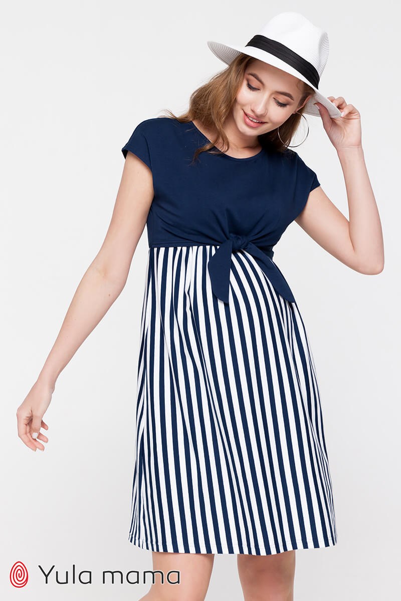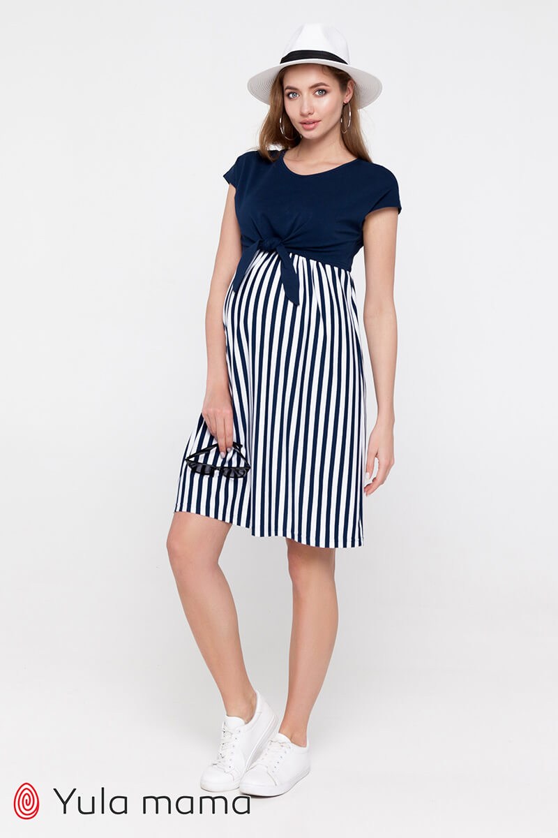 Двухцветное трикотажное платье для беременных и кормящих, которое станет основой базового летнего гардероба будущей мамы. Синий верх и полосатый низ создают легкий летний образ. Выполнено из тонкого хлопкового трикотажа. Имеет оригинальный и совершенно незаметный секрет кормления: двойной лиф с доступом к груди при развязаных завязках. Лиф полуприлегающий, низ свободный. Платье удобное на любом сроке беременности и потом.