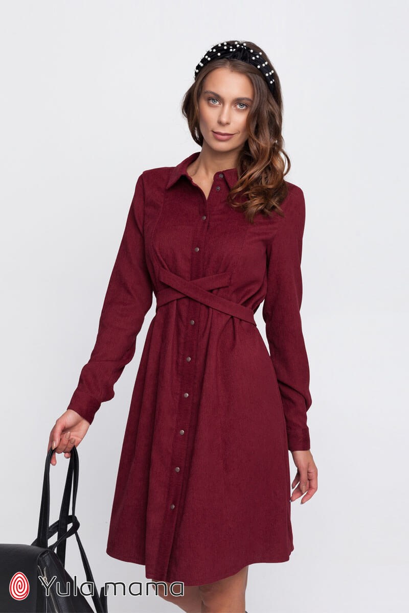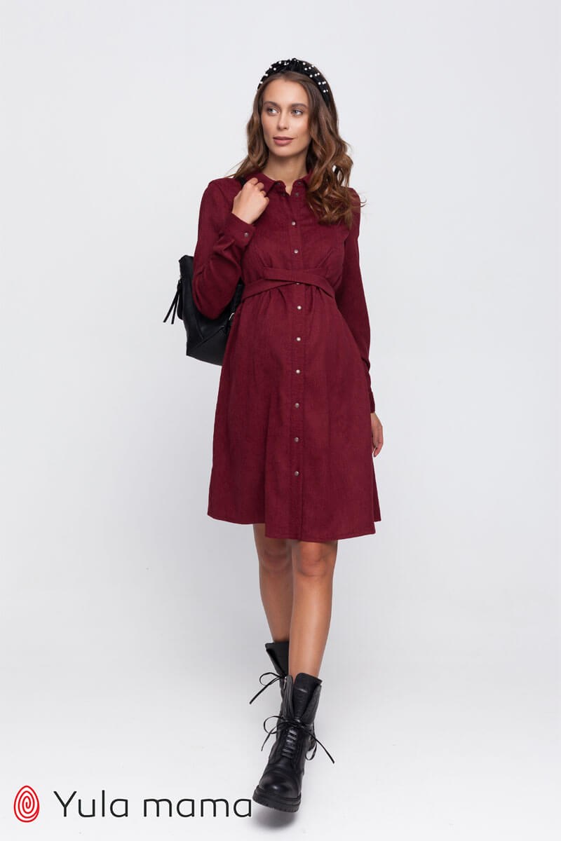 Бордовое вельветовое платье для беременных и кормящих. Платье рубашечного типа уверенно поселилось в гардеробах модниц всего мира. Длинный рукав заканчивается манжетой на кнопке. Застегивается платье по всей длине на кнопочки. Горловина оформлена стоечно-отложным воротничком. Платье А-образного силуэта с регулировкой обхвата с помощью вшитых поясов. Секрет кормления: потайные замочки в нагрудных швах. Стильное и удобное осеннее платье.