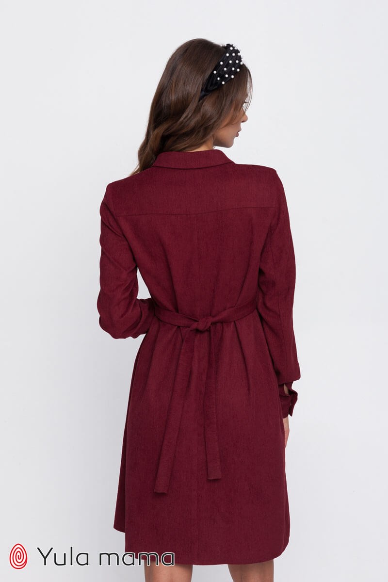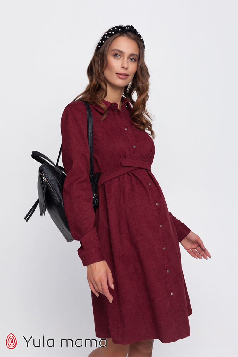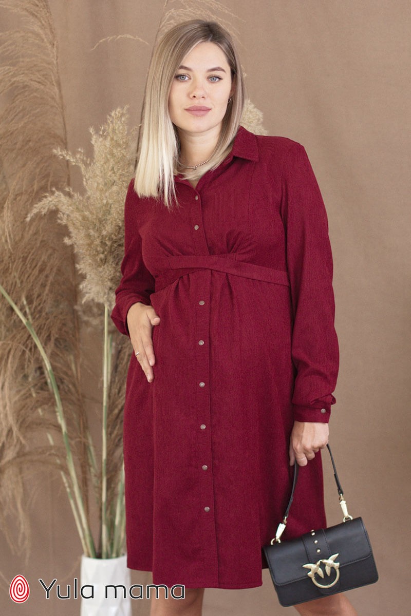 Бордовое платье-рубашка из вельвета для беременных и кормящих. Застегивается на кнопочки, имеет длинный рукав с манжетой, обхват регулируется поясками. Секрет кормления: потайные замочки.