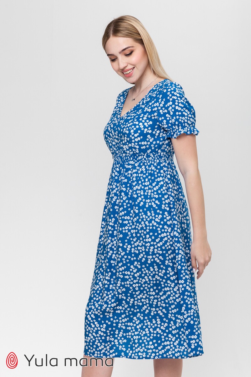 Летнее синее платье в цветочек для беременных и кормящих мам. Имеет полуприлегающий лиф и собранную юбку колокольчиком. Есть секрет кормления: потайные замочки в нагрудных швах. Горловина оформлена V-образным вырезом. Короткий рукав собран по краю рюшей. Очень удобное и милое платье.