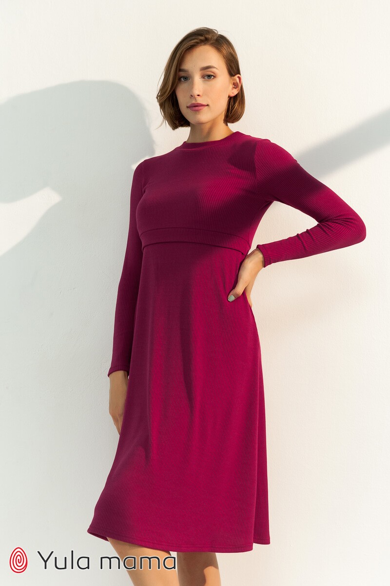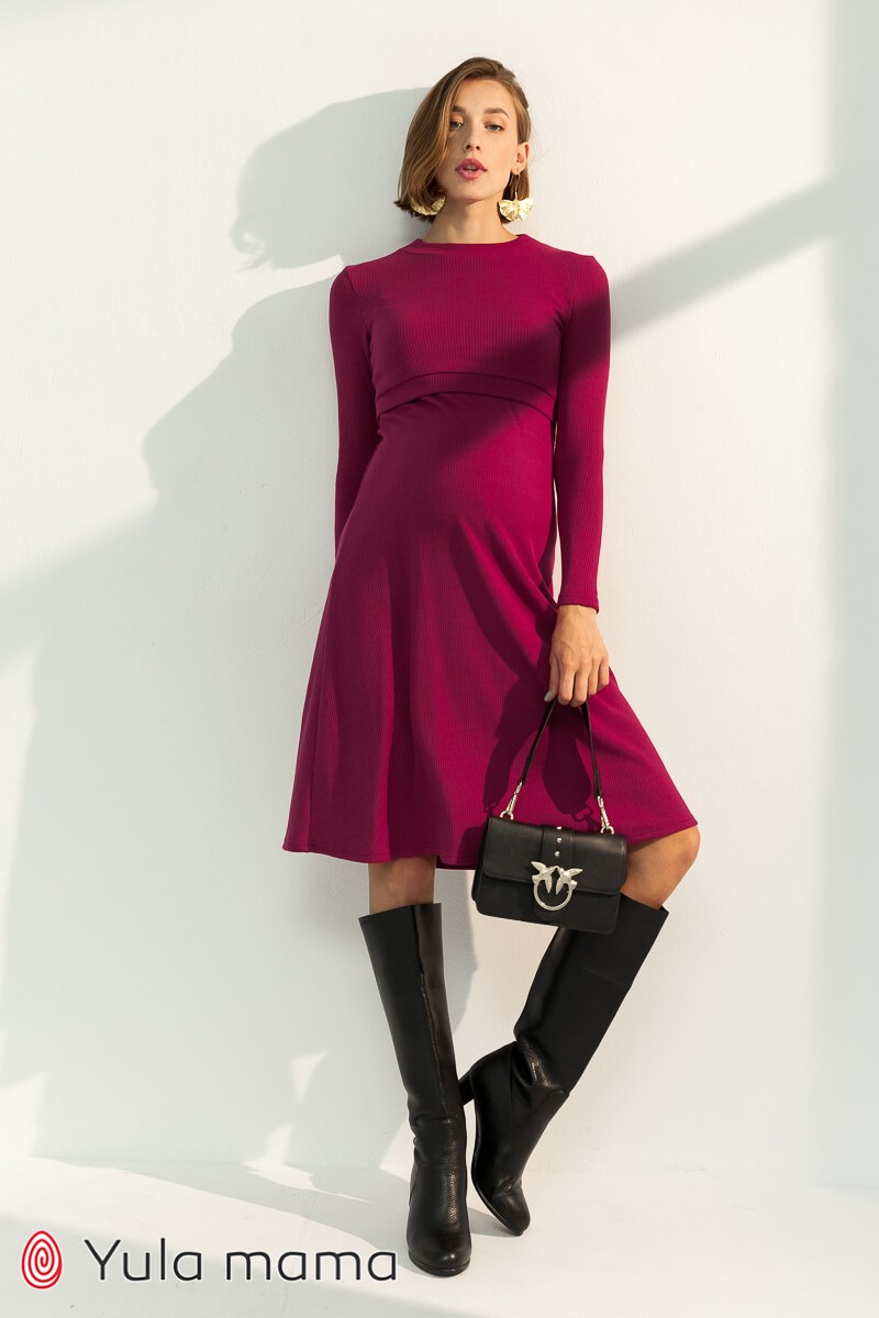 Трикотажное платье цвета фуксия для беременных и кормящих. Имеет длинный облегающий рукав. Горловина оформлена высоким круглым вырезом. Платье имеет облегающий лиф и свободную юбку, поэтому подойдет на любой срок беременности. Секрет кормления: верхняя часть полочки поднимается.
