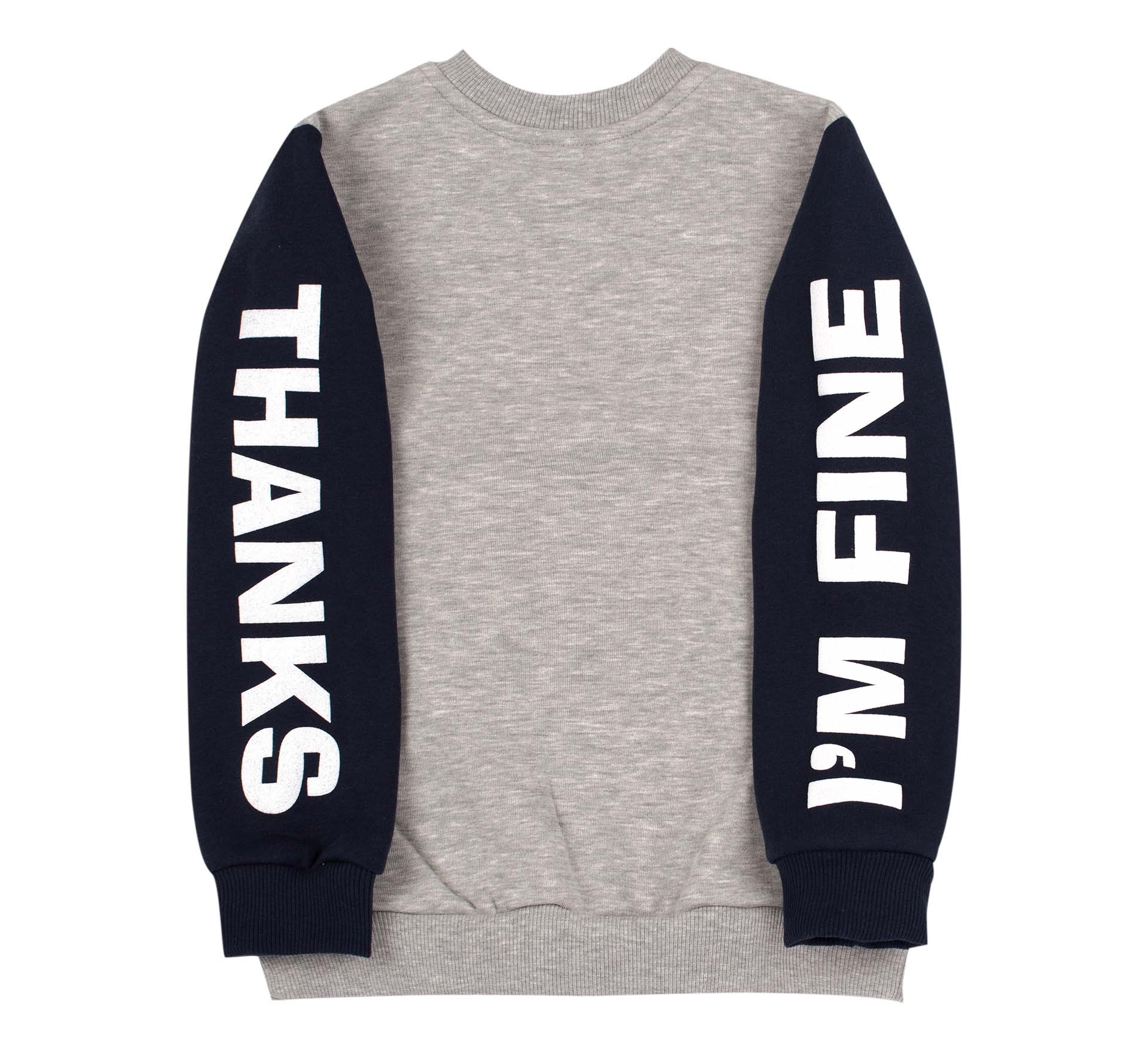 Серый детский джемпер с синими рукавами. Выполнен из теплого трикотажа с начесом. Спереди имеет карман-кенгуру и лаконичную нашивку. Кофта украшена оригинальной надписью на английском: на полочке вопрос "Как дела", а на рукавах ответ "Хорошо, спасибо". Спинка однотонная.