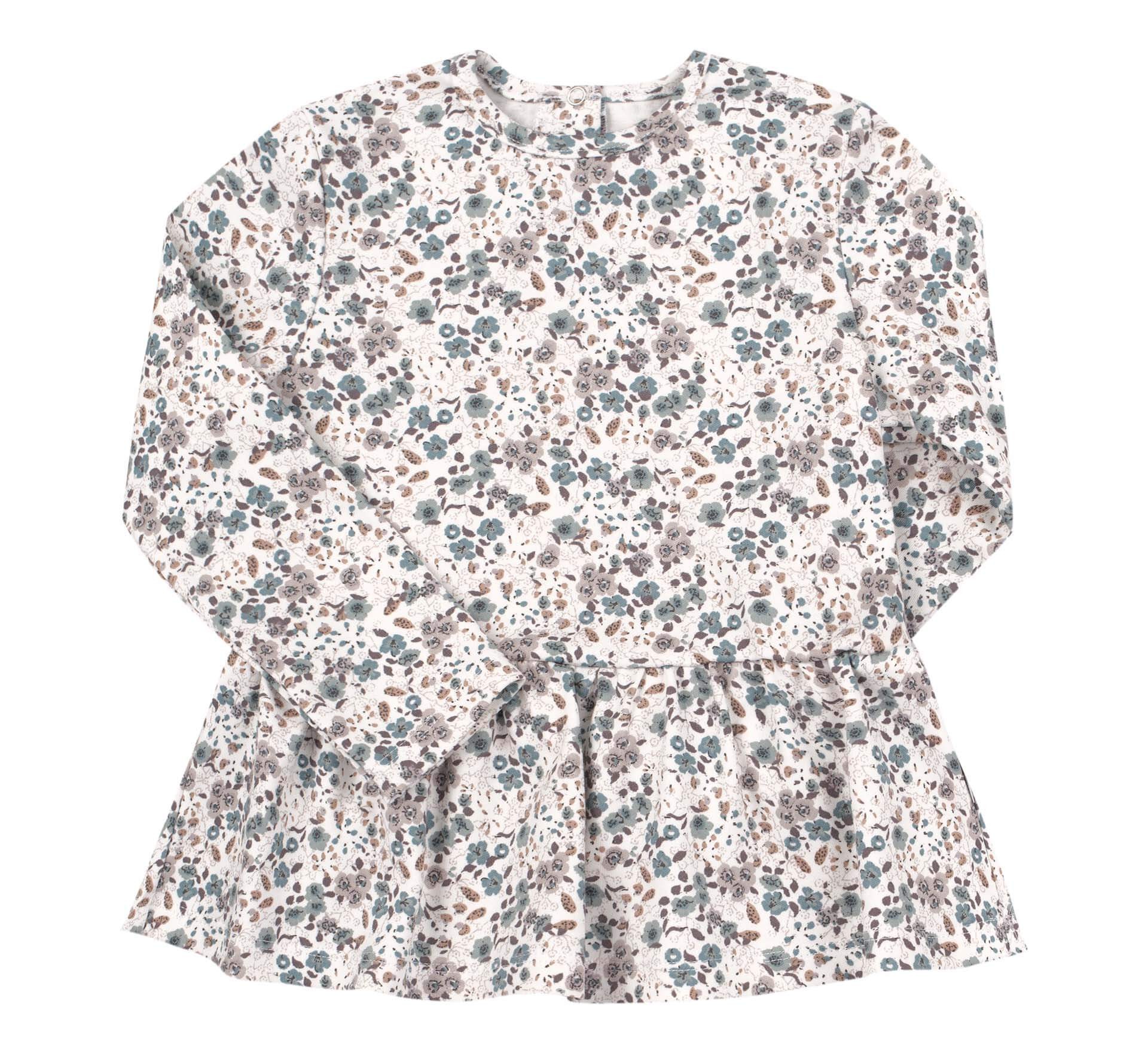 Детский джемпер в цветочек с воланом по краю. Созданный для маленьких модниц! Имеет круглую горловину, на спинке застегивается на кнопочки вверху. Рукав длинный прямой. Спереди кофта украшена принтом. Материалом для пошива выступил хлопковый трикотаж средней плотности.