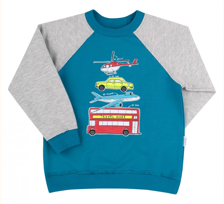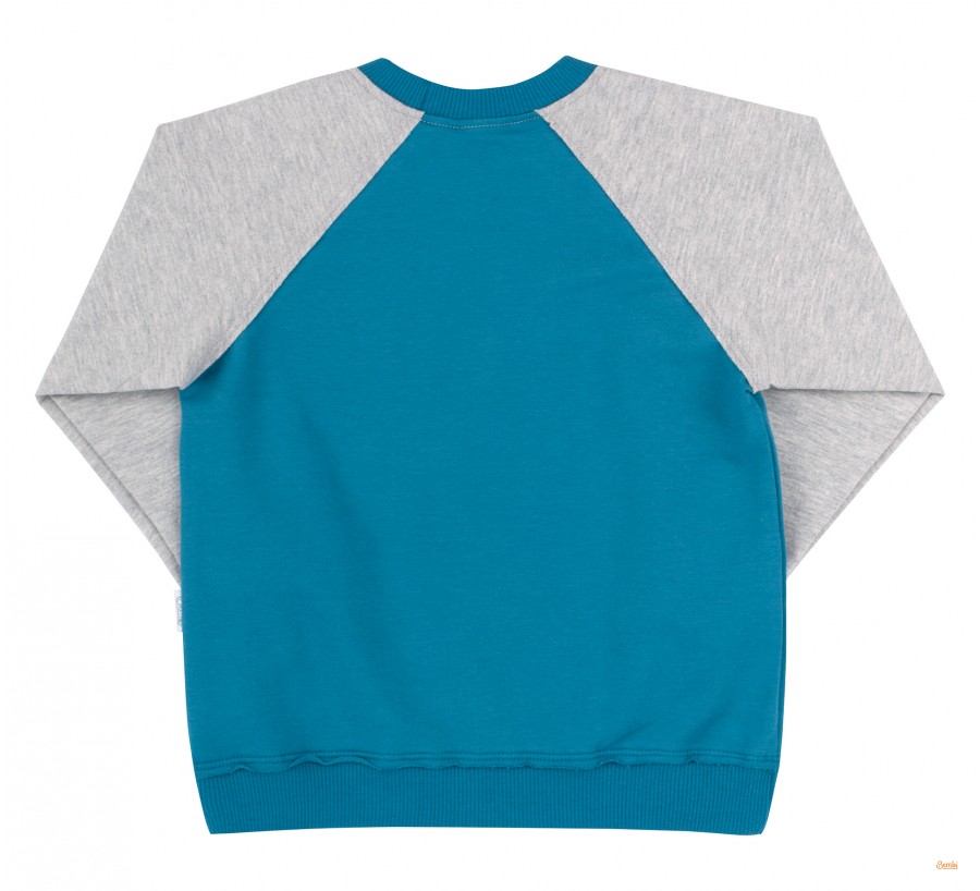Бирюзовый детский джемпер с серым рукавом реглан и принтом для мальчиков. Сшит из хлопкового трикотажа. Круглая горловина, край рукавов и изделия обшиты манжетой в рубчик. Изюминкой модели является дополнительно выступающий необшитый край над манжетами.