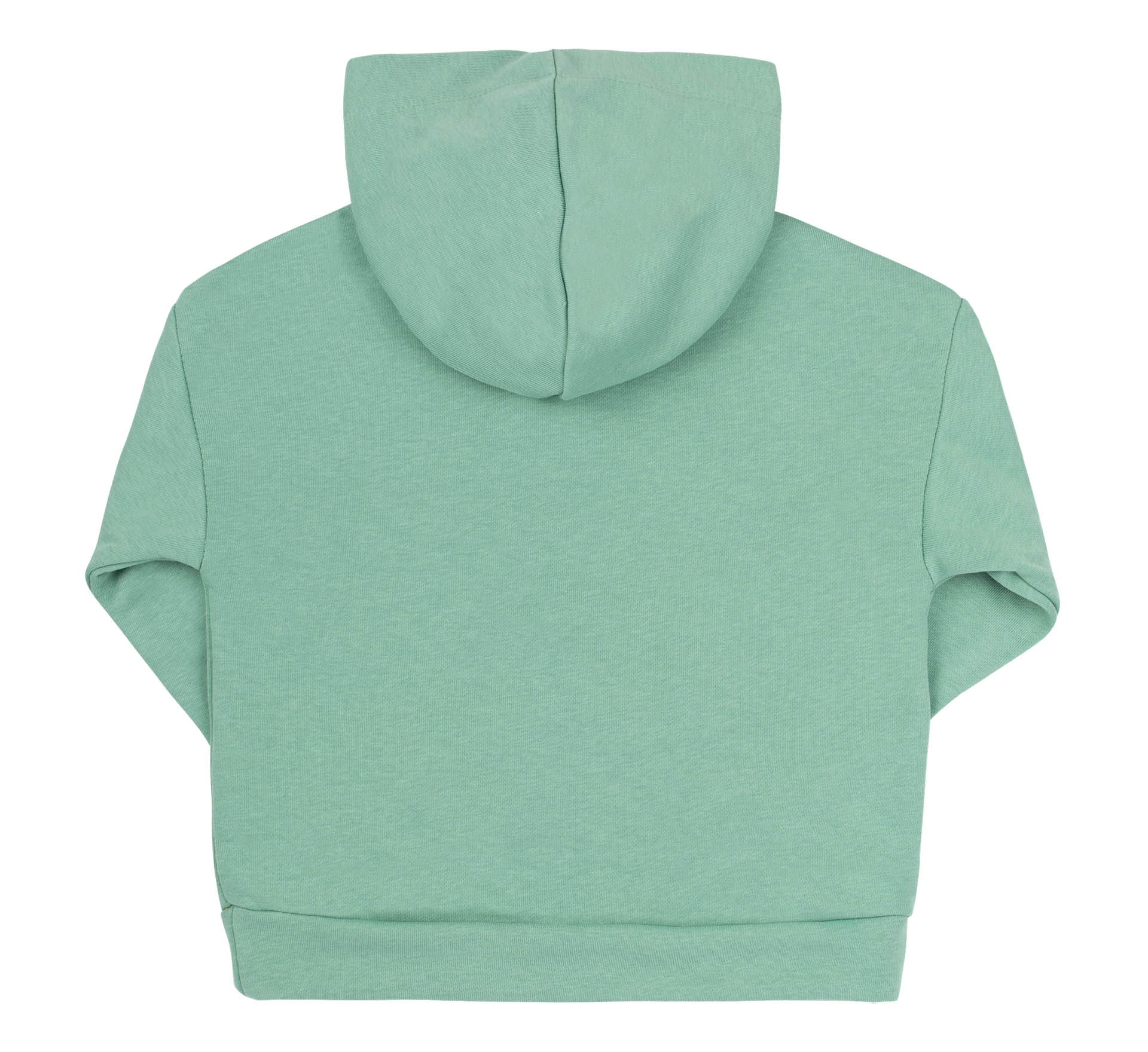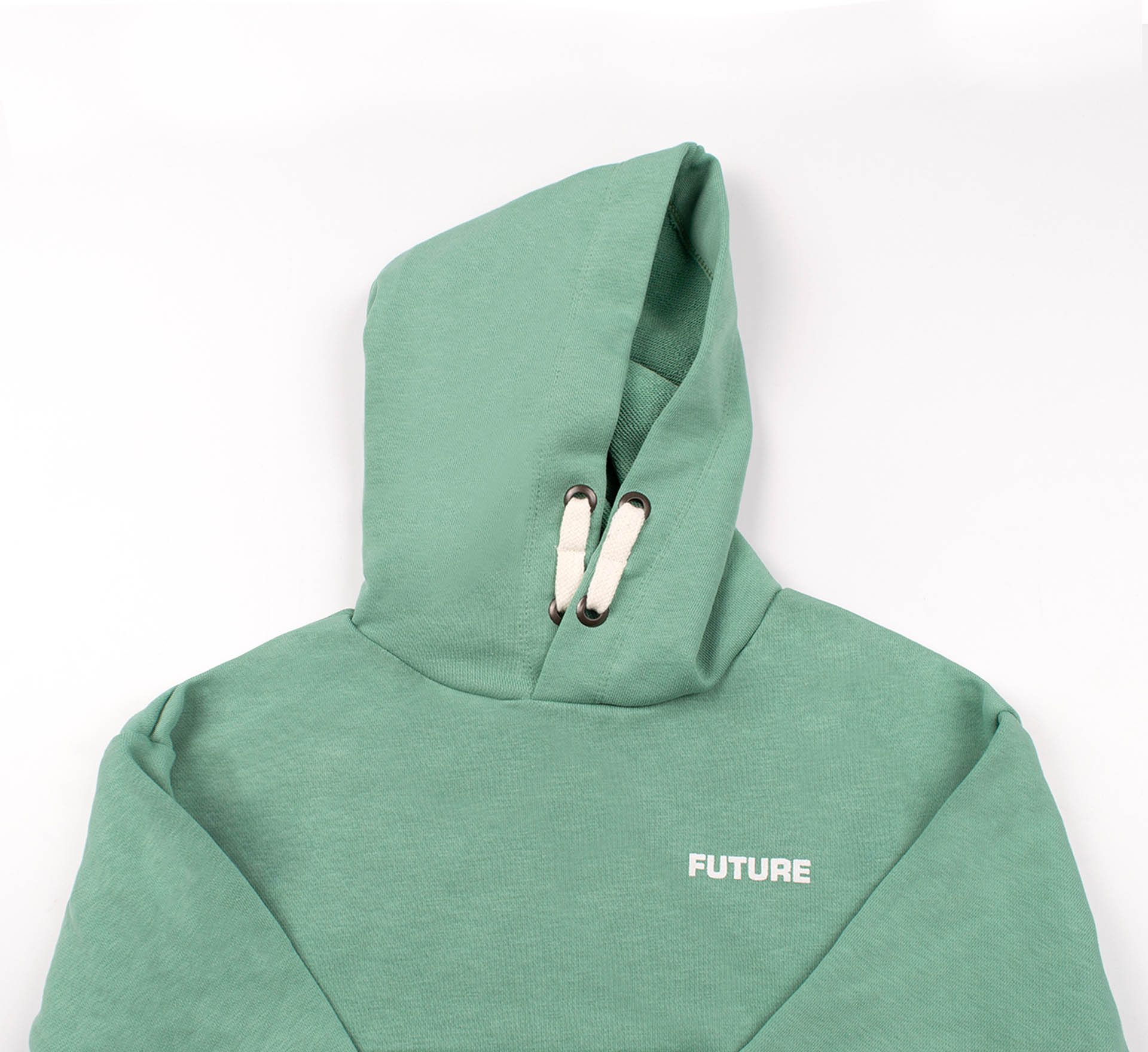 Детское мятное худи с капюшоном. Сшитое из плотного трикотажа тринитка. Удобное и стильное. Имеет свободный прямой крой и капюшон внахлест. Спереди сбоку детская кофта с капюшоном украшена надписью Future (с англ. Будущее). Длинный рукав заканчивается манжетой. Спереди большой карман-кенгуру.