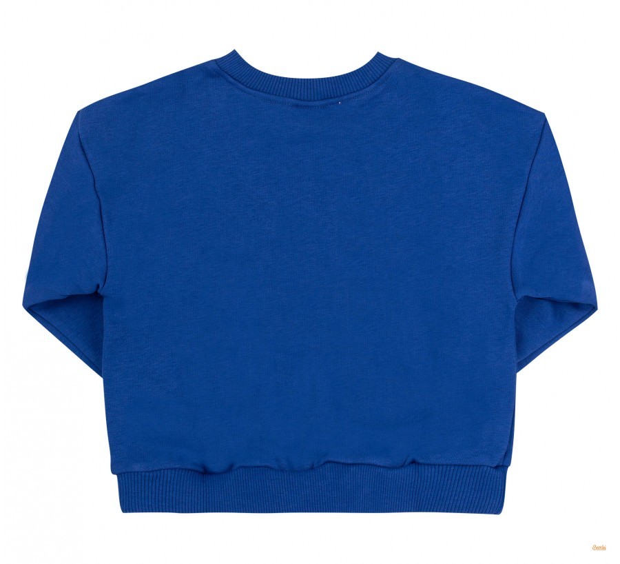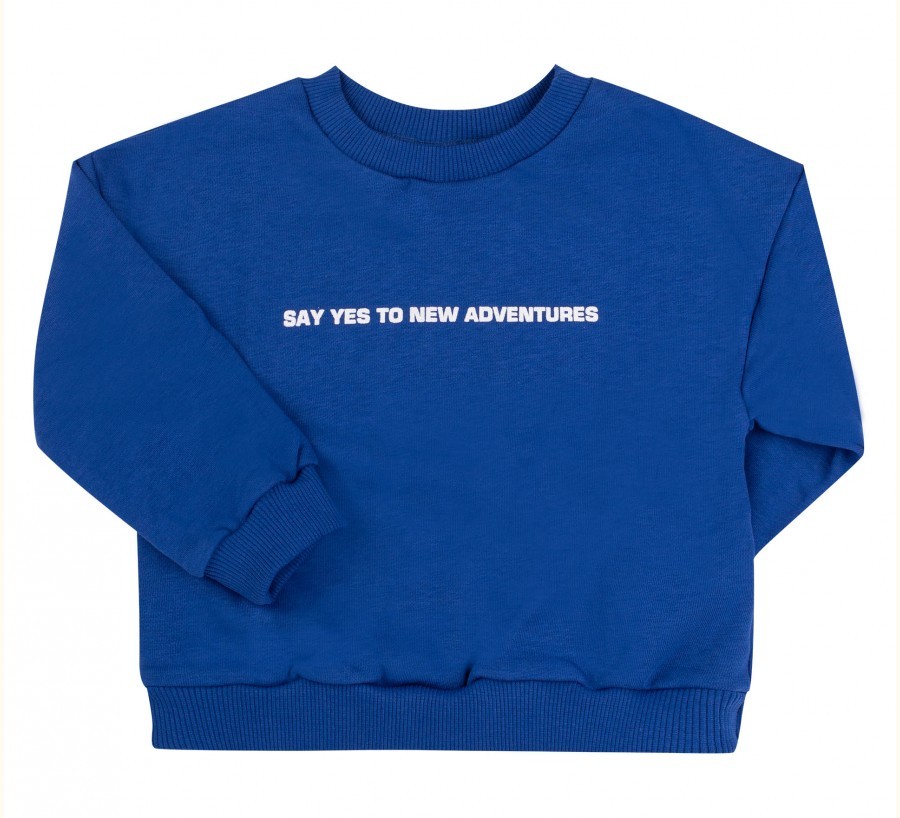 Детский синий свитшот с надписью "Скажи да новым приключениям" (на английском). Сшитый из трикотажа тринитка, довольно плотный, но без начеса. Крой прямой и свободный. Длинный рукав и край изделия собраны манжетой.
