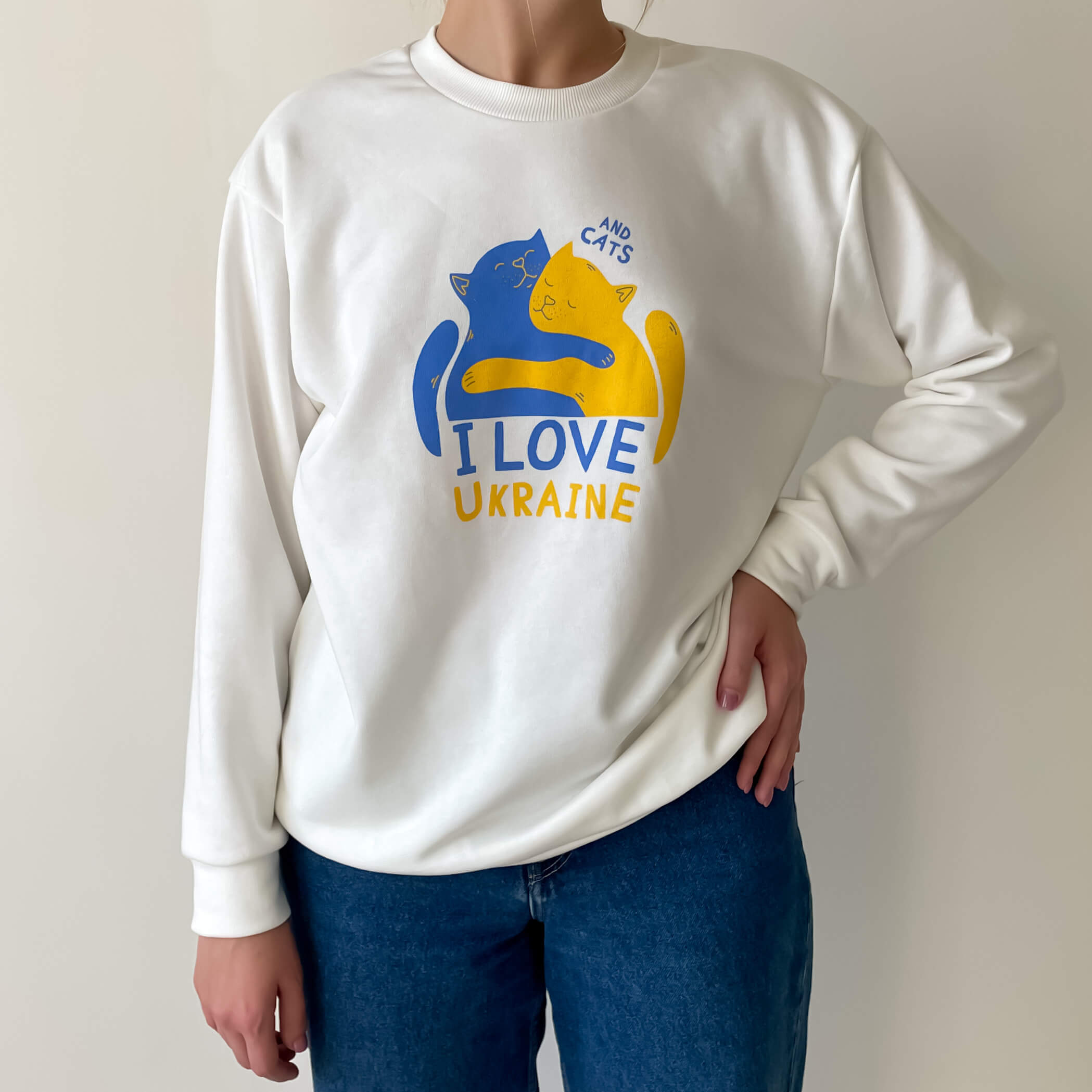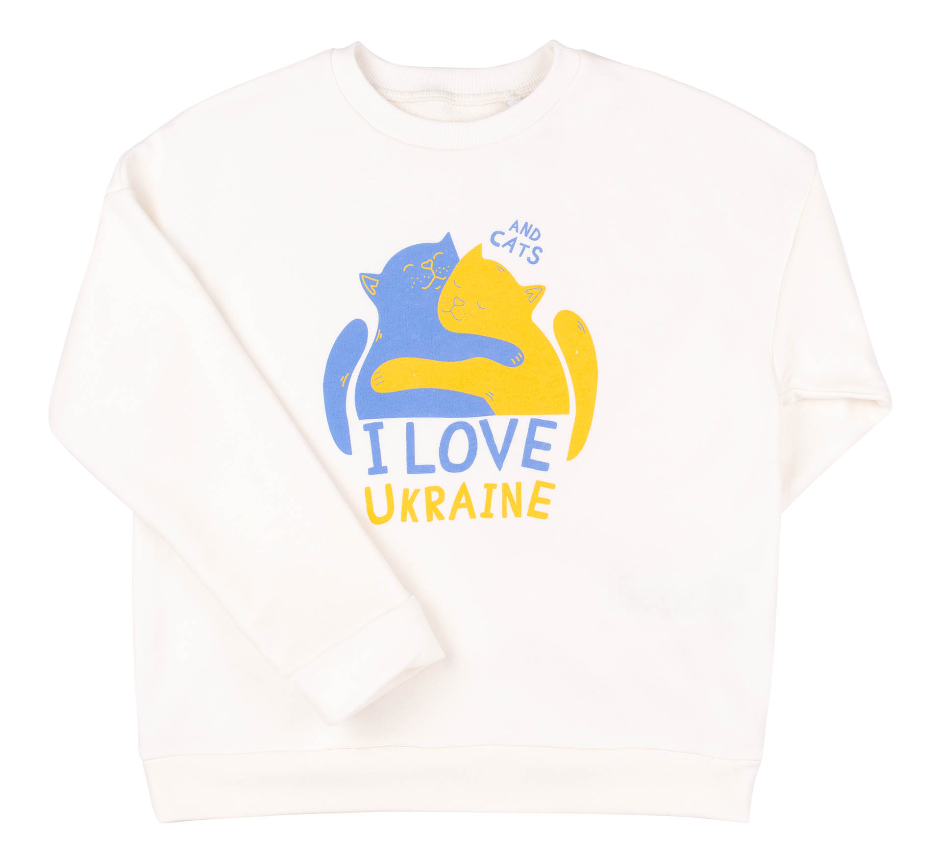 Универсальный патриотический свитшот молочного цвета с милым принтом с котиками и надписью "Я люблю Украину и кошек" (на английском). Свитшот сшит из плотного трикотажа тринитка. Горловина круглая. Длинный рукав заканчивается манжетой. Кофта имеет свободный крой и спущенную линию плеча. Модель выполнена в широкой размерной линейке: от детского 116-го размера – до взрослого 170-го. Размер выбирайте по росту.
