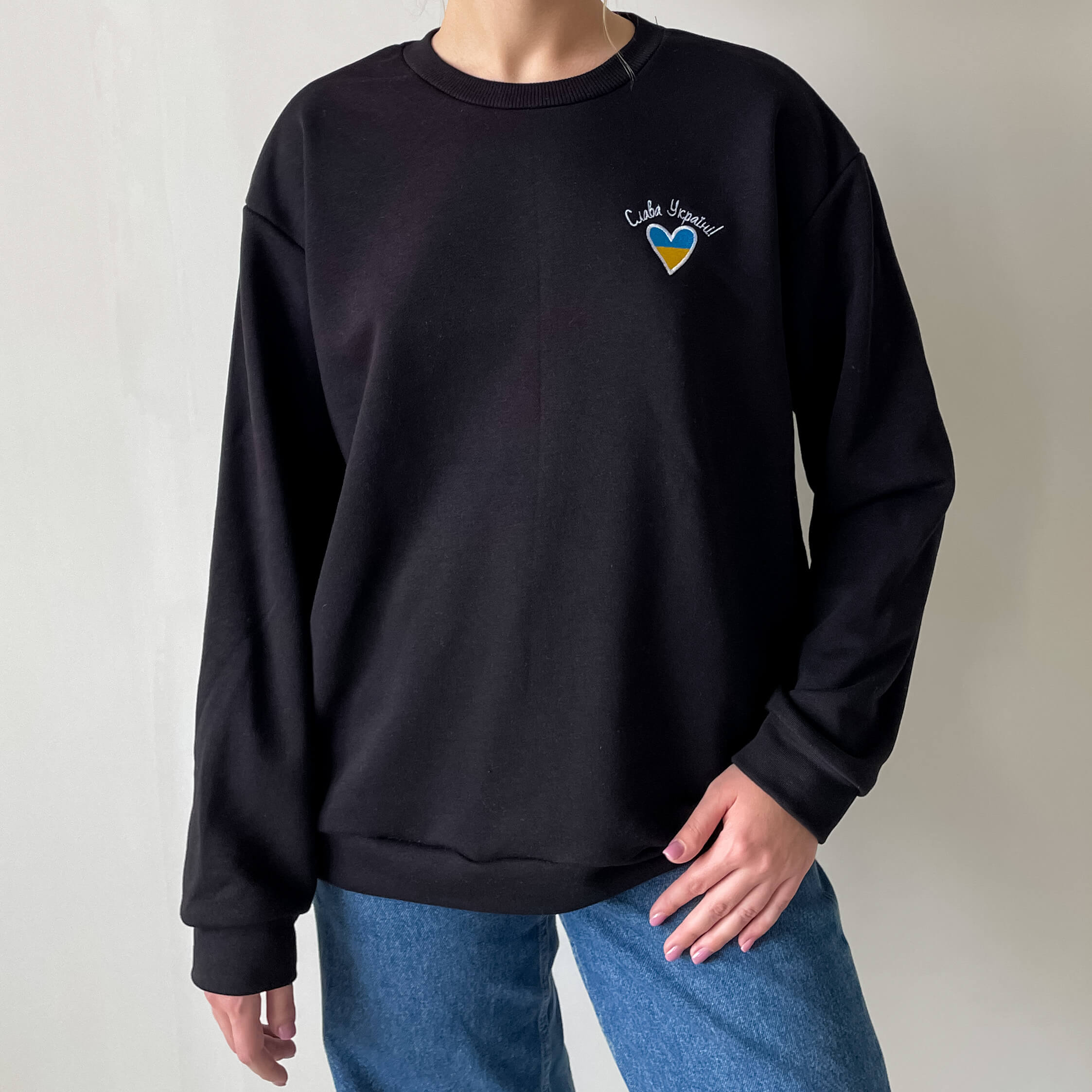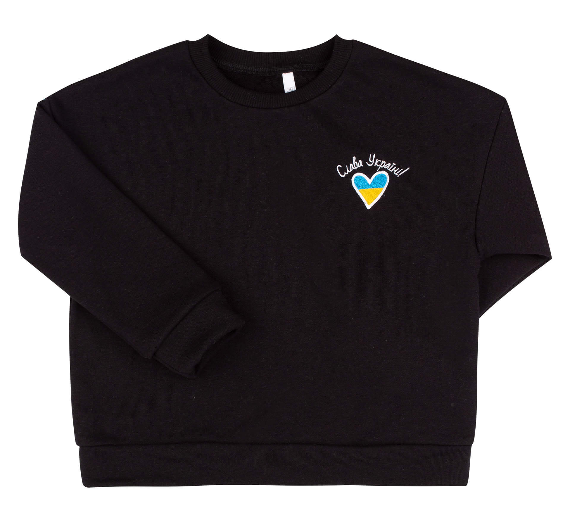 Универсальный патриотический свитшот черного цвета с вышитой надписью "Слава Україні" и желто-голубым сердечком. Свитшот сшит из плотного трикотажа тринитка. Горловина круглая. Длинный рукав заканчивается манжетой. Кофта имеет свободный крой и спущенную линию плеча. Модель выполнена в широкой размерной линейке: от детского 116-го размера – до взрослого 170-го. Размер выбирайте по росту.