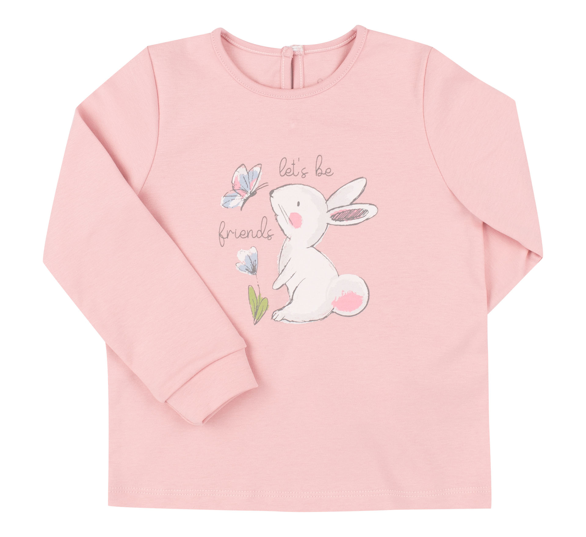 Светло-розовая детская кофта с зайчиком для девочек. Сшита из хлопкового трикотажа средней плотности. Круглая горловина на спинке застегивается на пуговицу. Длинный рукав собран манжетой по краю. Удобная кофта в садик прекрасно подойдет для активных игр в течение дня.