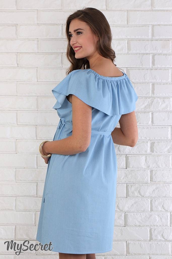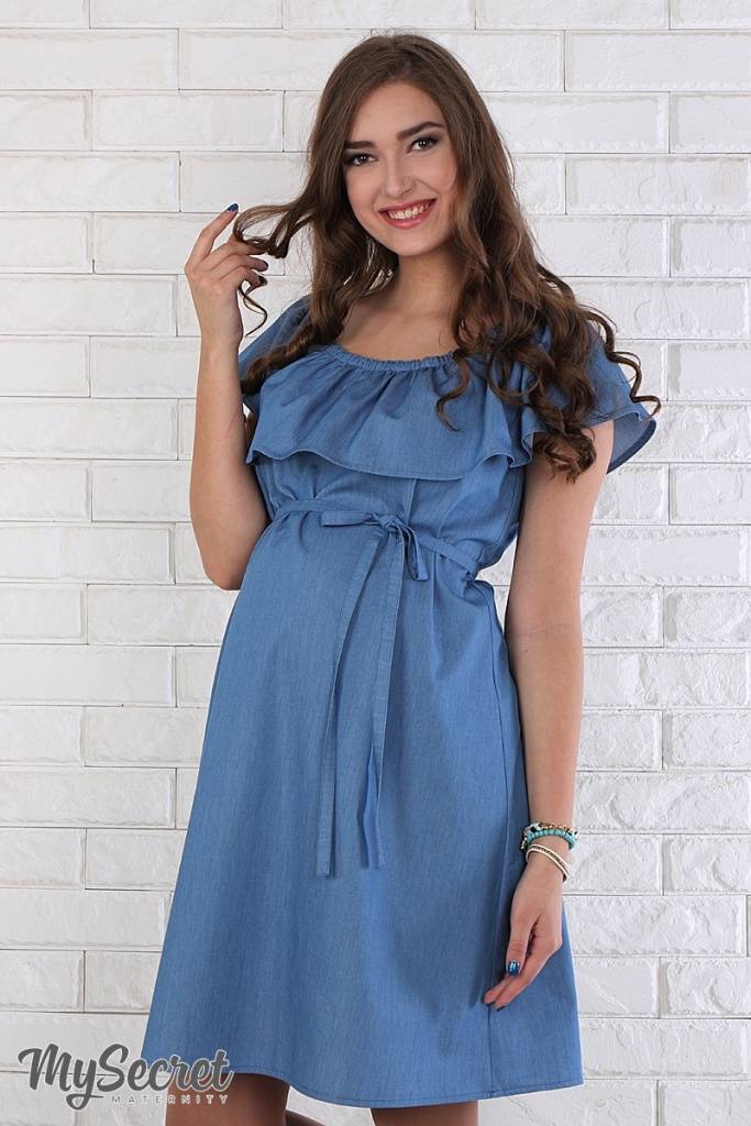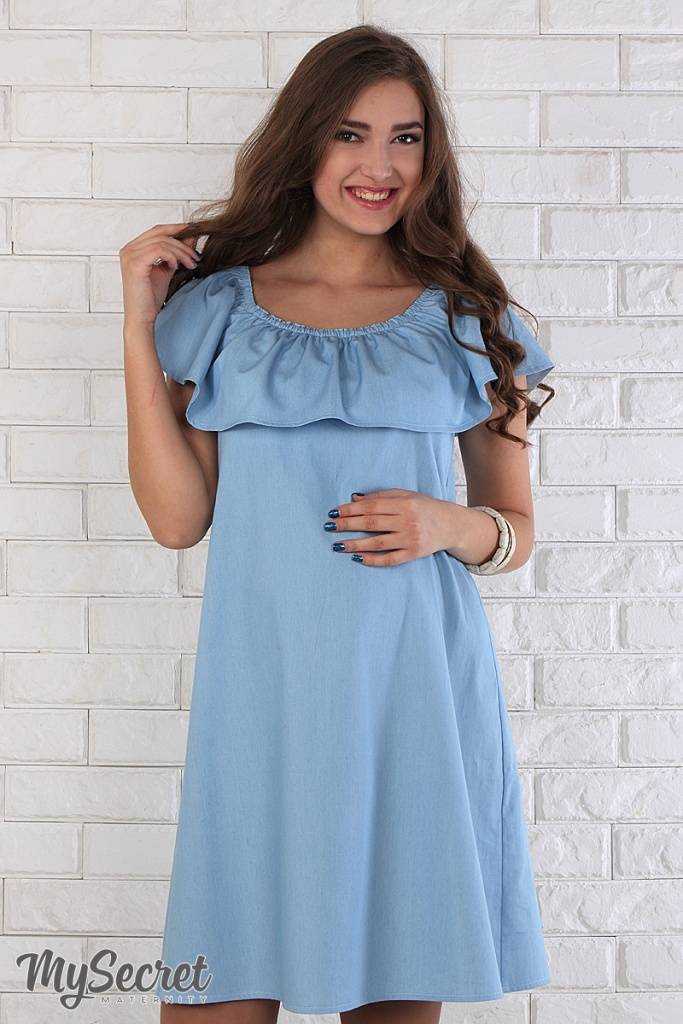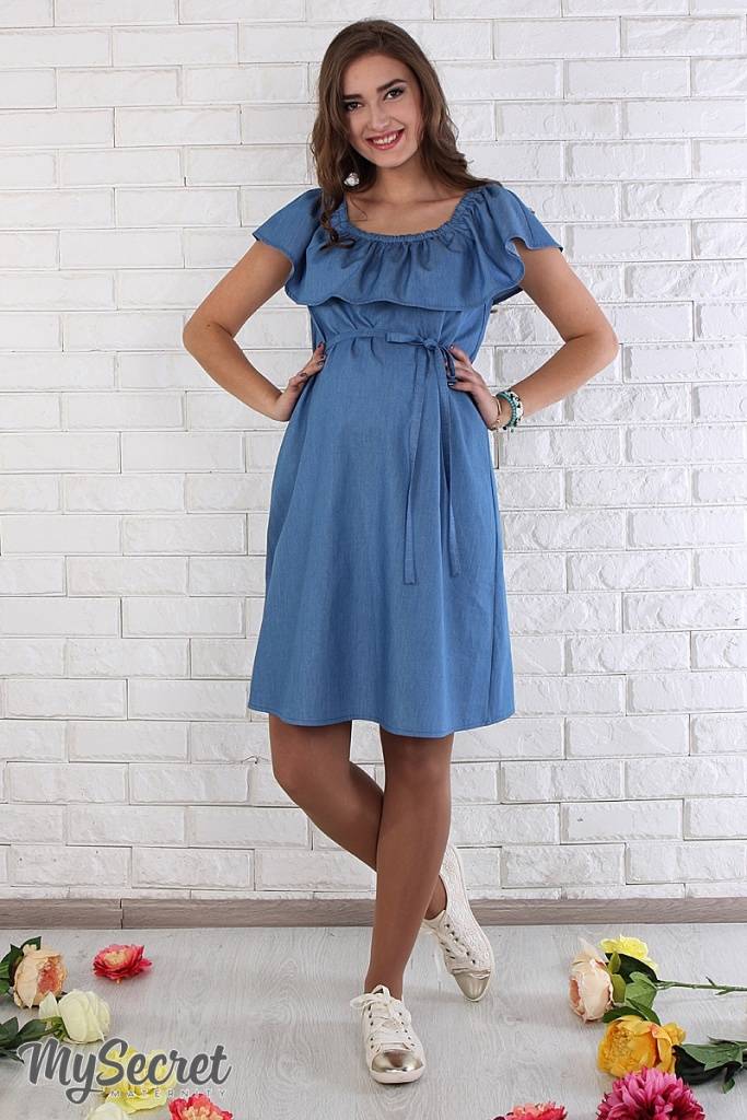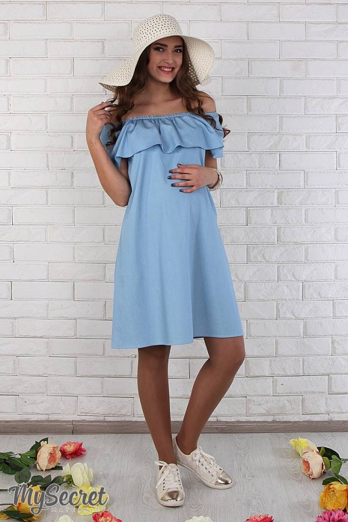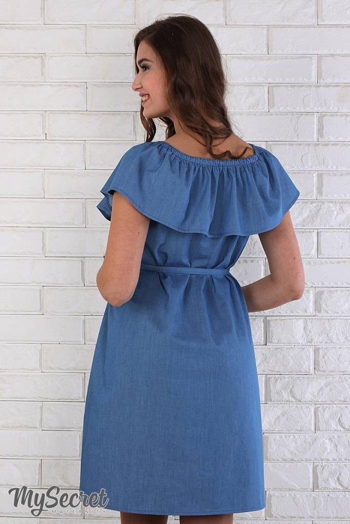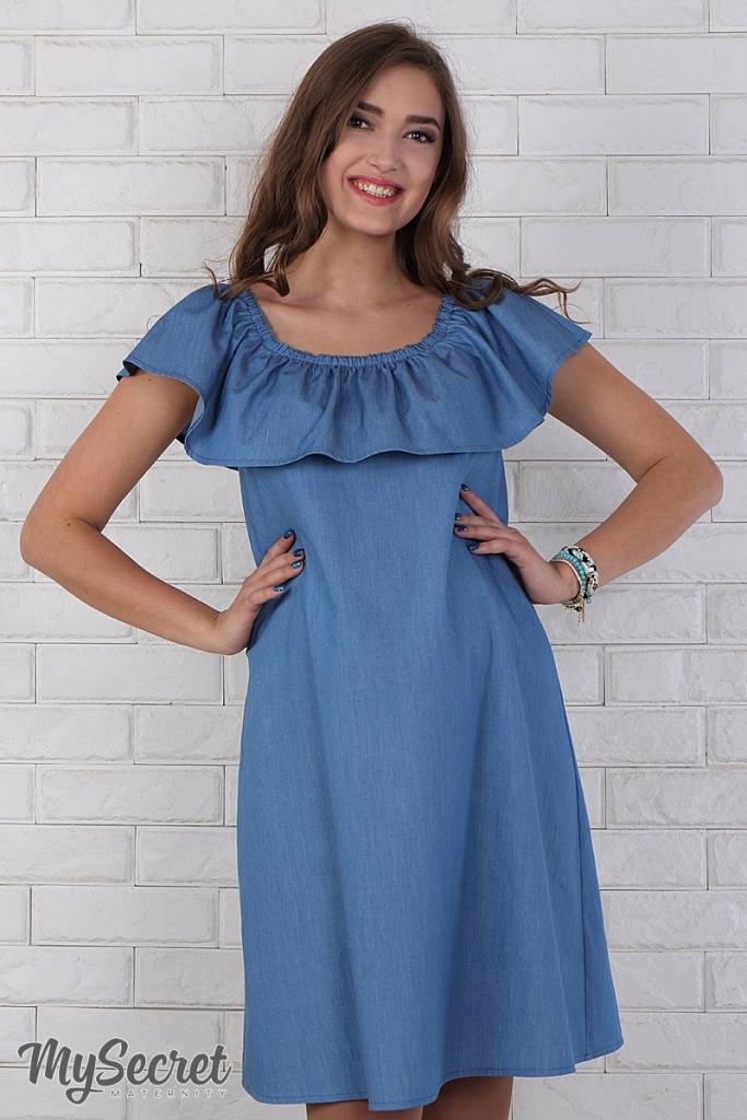Ультра модна і по-дівочому мила сукня з тонкого джинса. Завдяки спеціальному крою широкий волан по плечах можна по-різному носити: одягаючи на плечі або кокетливо приспускаючи. Летючий низ прекрасно маскує мінливі форми і не сковує рухів. У комплекті йде поясок.
