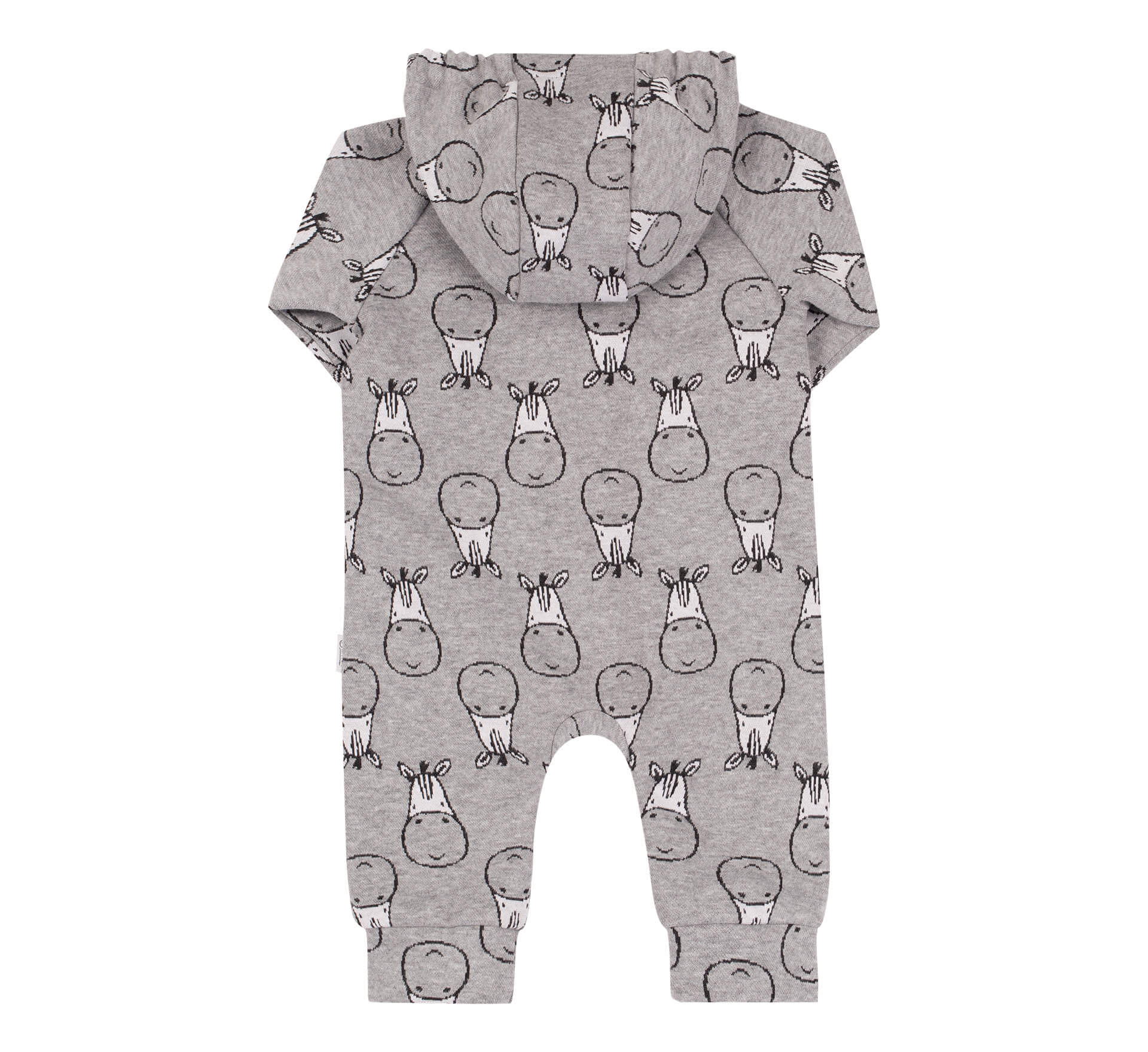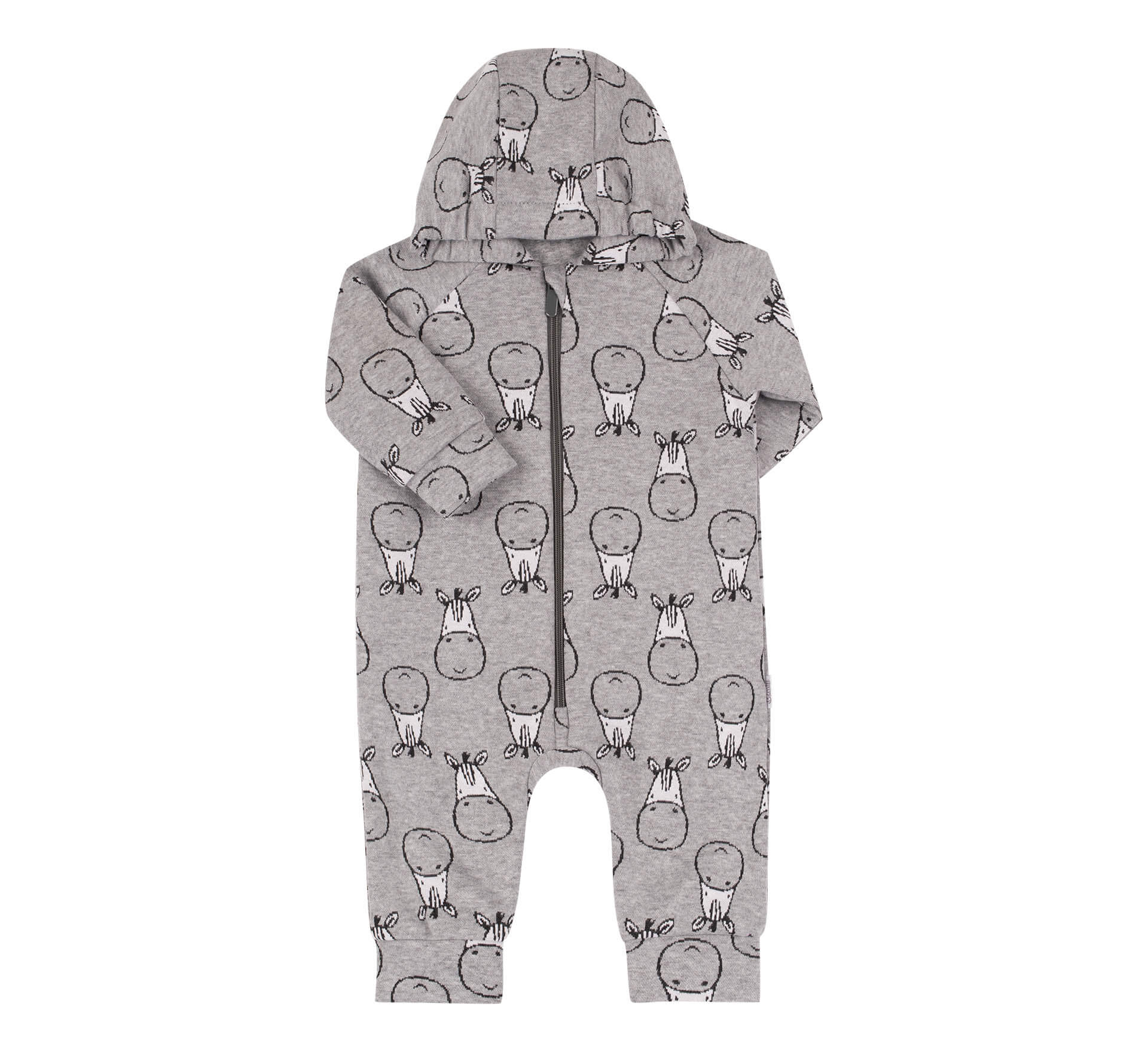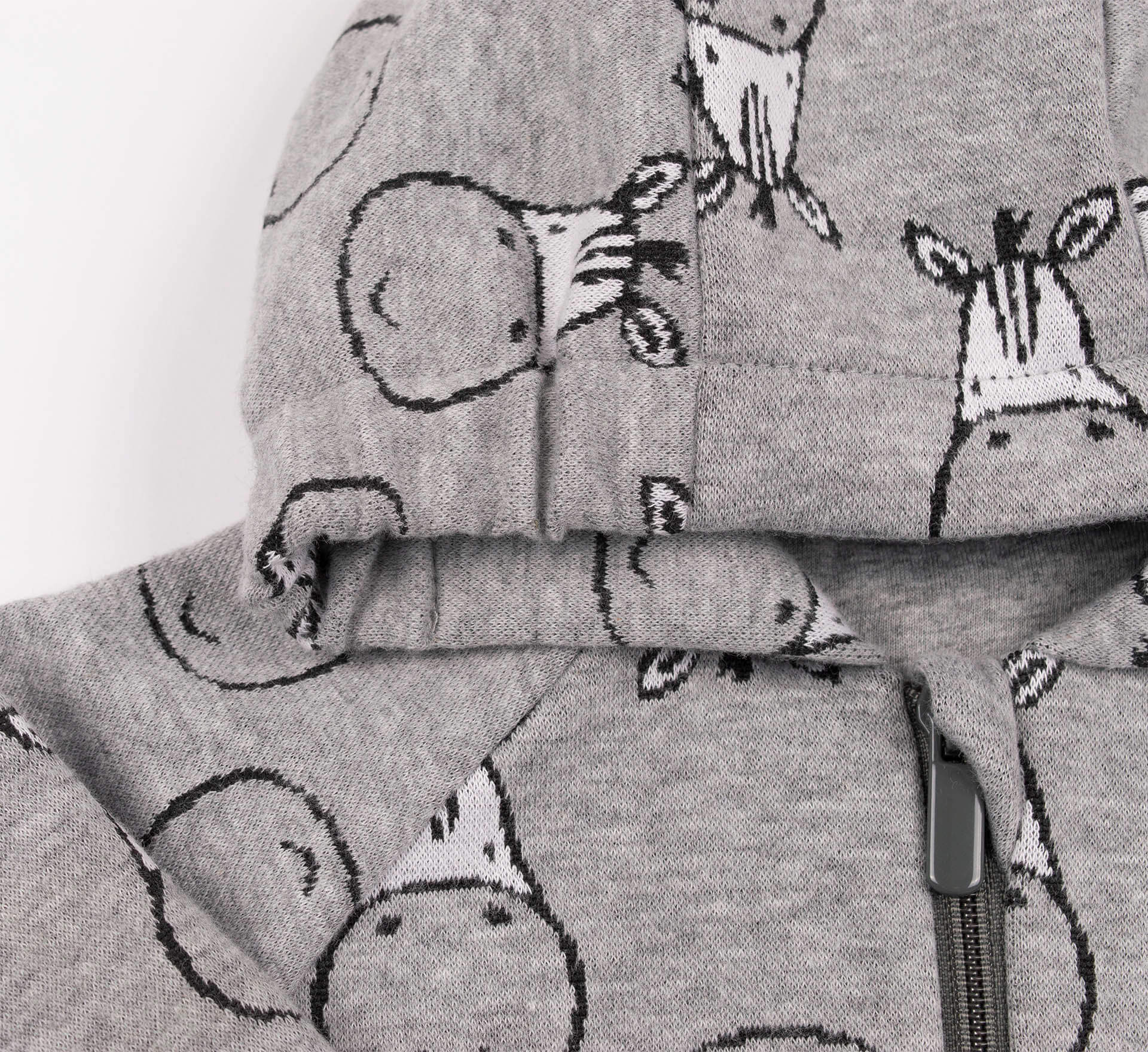 Сірий дитячий комбінезон з зебрами. Пошитий з трикотажу джерсі. Має відкриті ніжки та манжети з основного матеріалу. Комбінезон з капюшоном застібається на блискавку та має довгий рукав реглан. Зручний універсальний комбінезон малюкам.