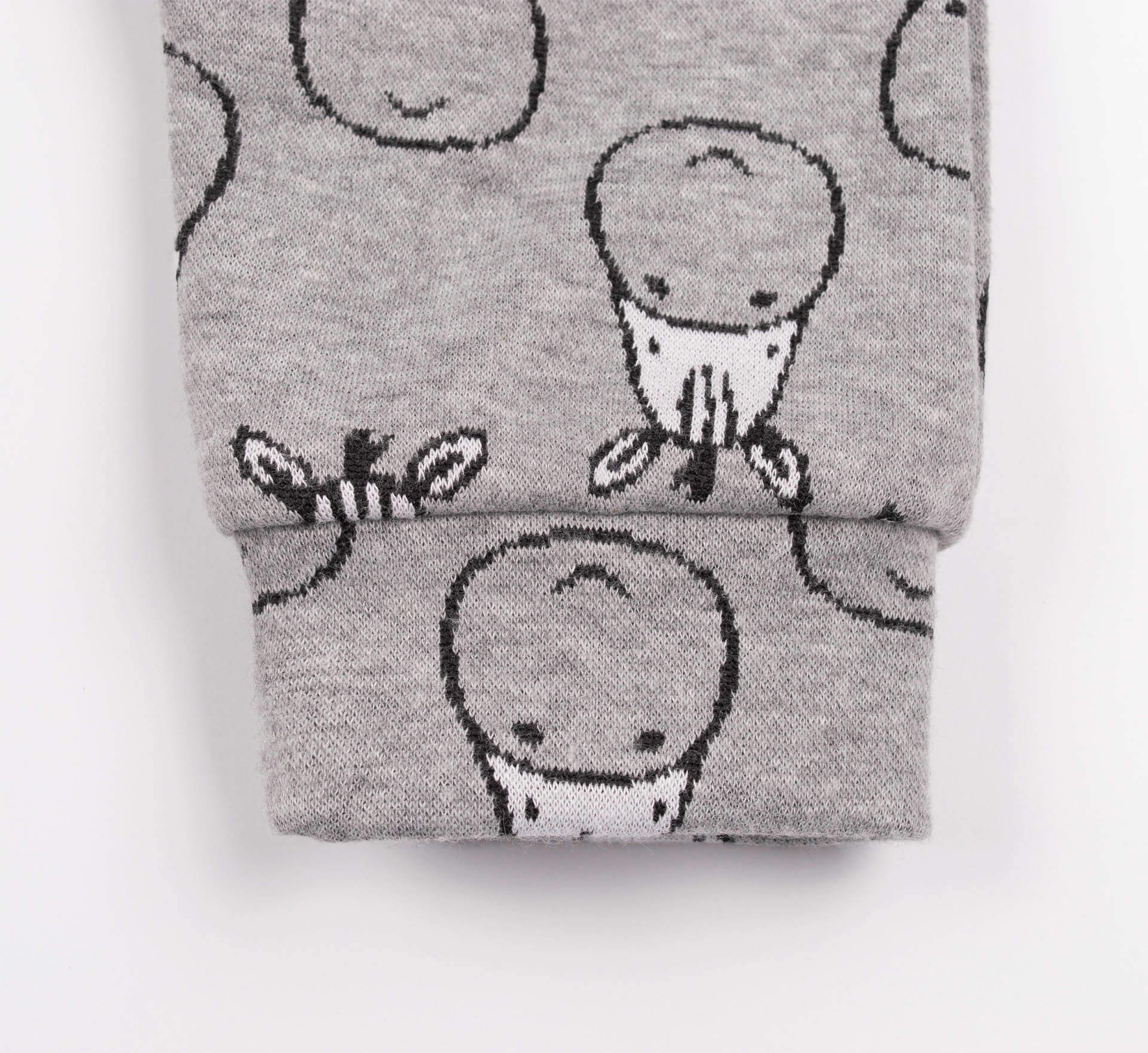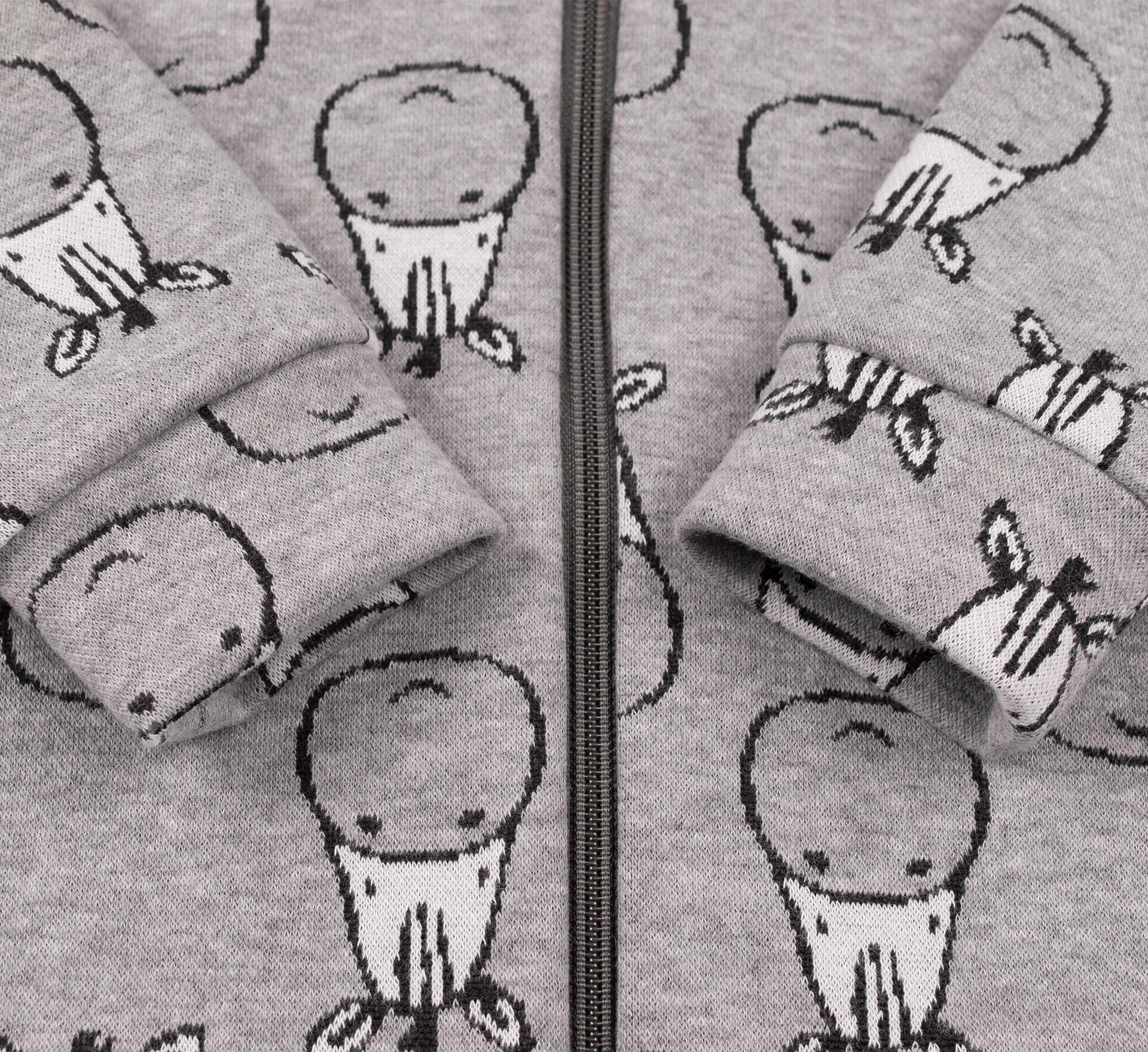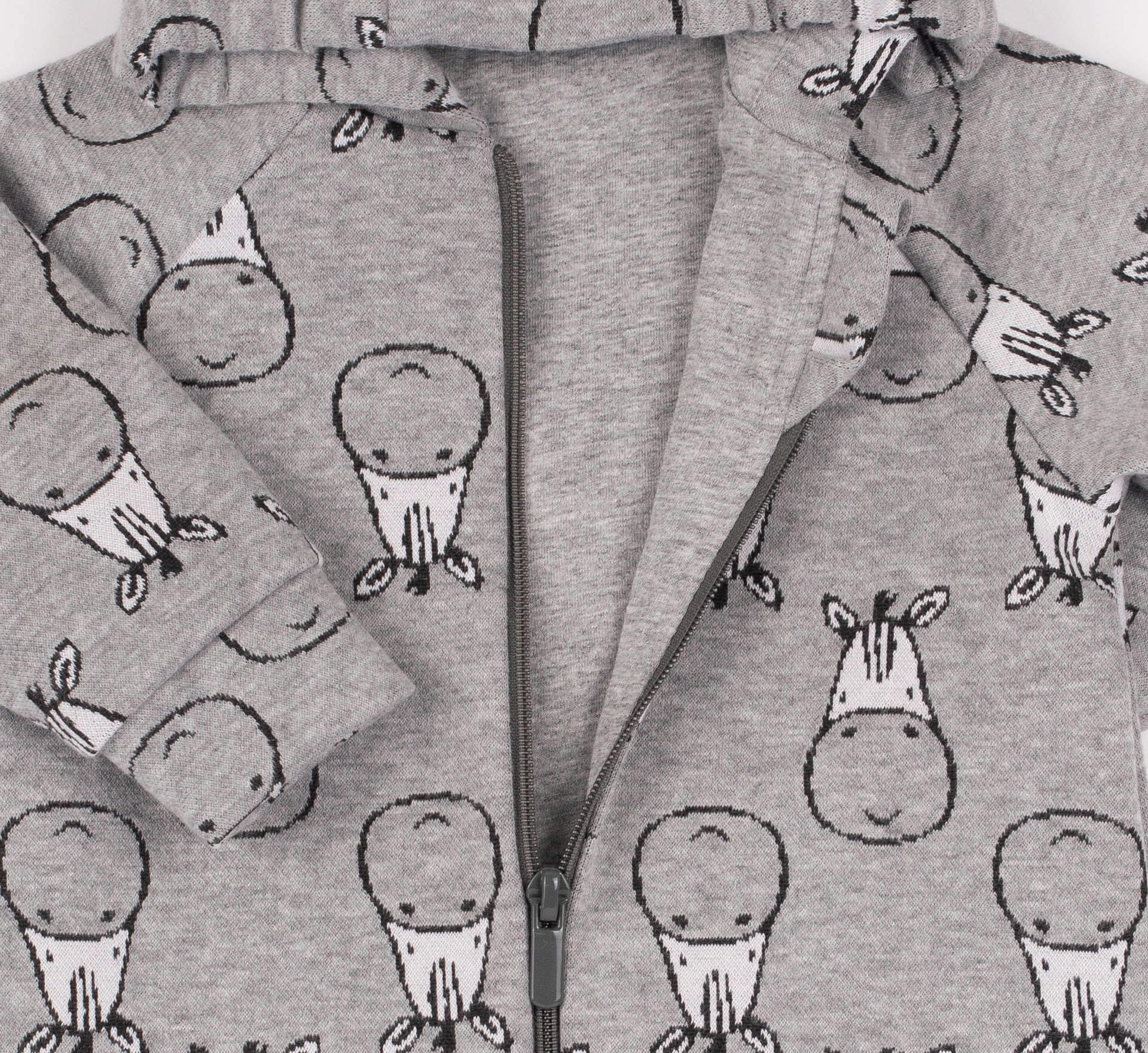 Сірий дитячий комбінезон з зебрами. Пошитий з трикотажу джерсі. Має відкриті ніжки та манжети з основного матеріалу. Комбінезон з капюшоном застібається на блискавку та має довгий рукав реглан. Зручний універсальний комбінезон малюкам.
