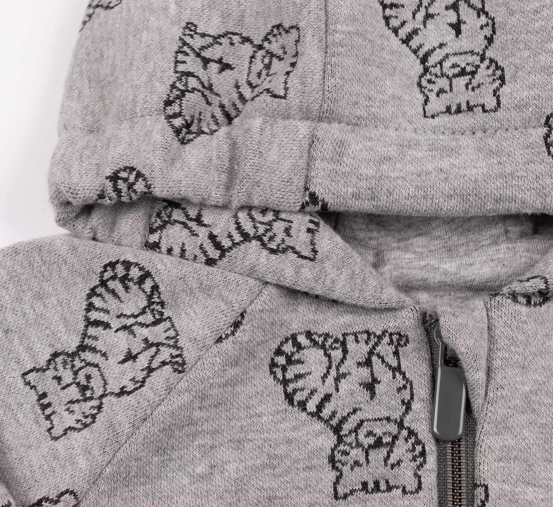Сірий дитячий комбінезон з тиграми. Пошитий з трикотажу джерсі. Має відкриті ніжки та манжети з основного матеріалу. Комбінезон з капюшоном застібається на блискавку та має довгий рукав реглан. Зручний універсальний комбінезон малюкам.