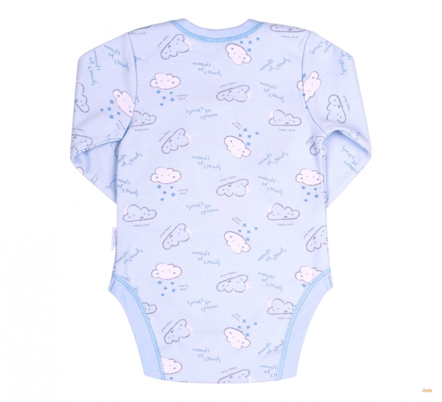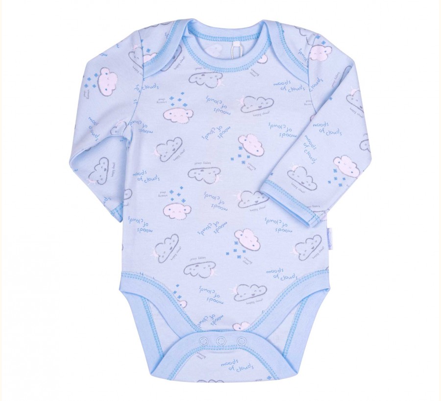 Дитячий блакитний бодік з принтом. Пошитий з бавовняного трикотажу. Зручний та приємний на дотик. Має довгий рукав. Спинка та перед з кокетками внахлест для зручного одягання. Внизу застібається на кнопочки.