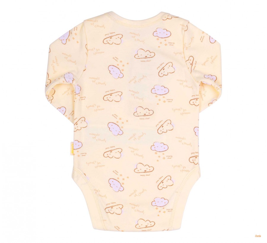 Дитячий молочний бодік з принтом. Пошитий з бавовняного трикотажу. Зручний та приємний на дотик. Має довгий рукав. Спинка та перед з кокетками внахлест для зручного одягання. Внизу застібається на кнопочки.