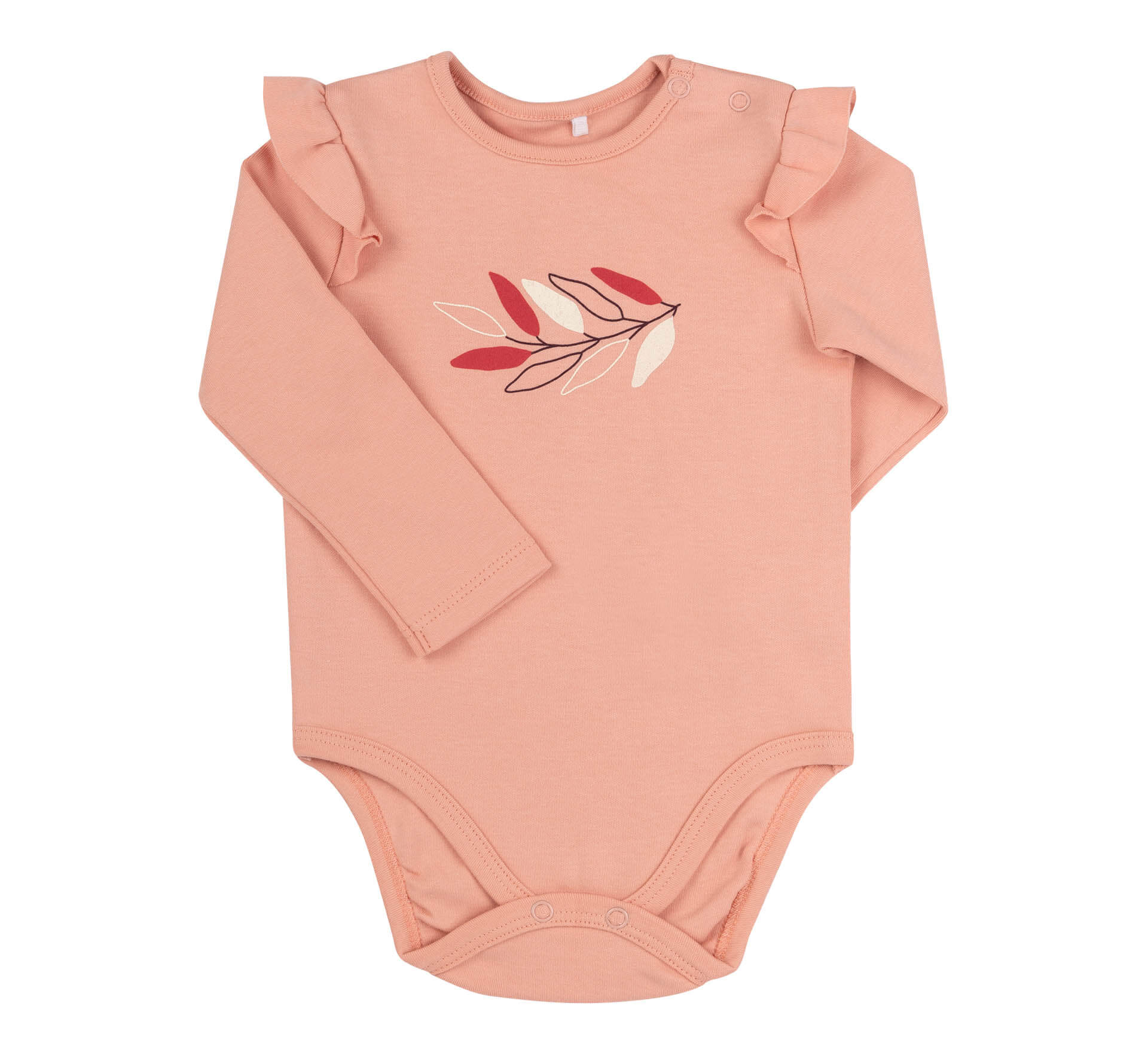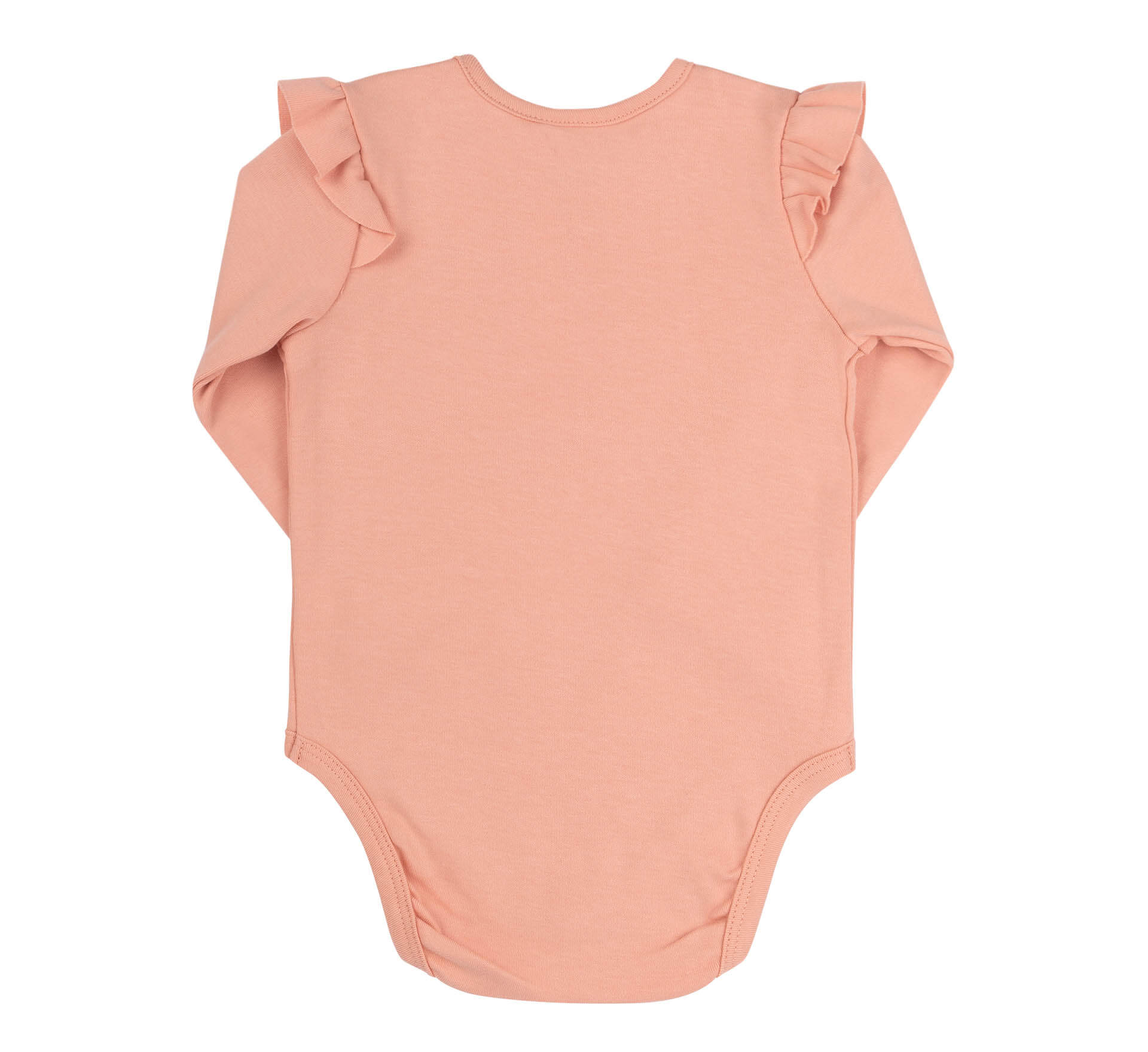 Дитячий персиковий бодік з гілочкою для дівчаток. Має довгий рукав та прикрашений на плечах воланами. Боді для дівчинки виконане з м'якого та щільного бавовняного трикотажу. Застібається на кнопочки на плечі та внизу.