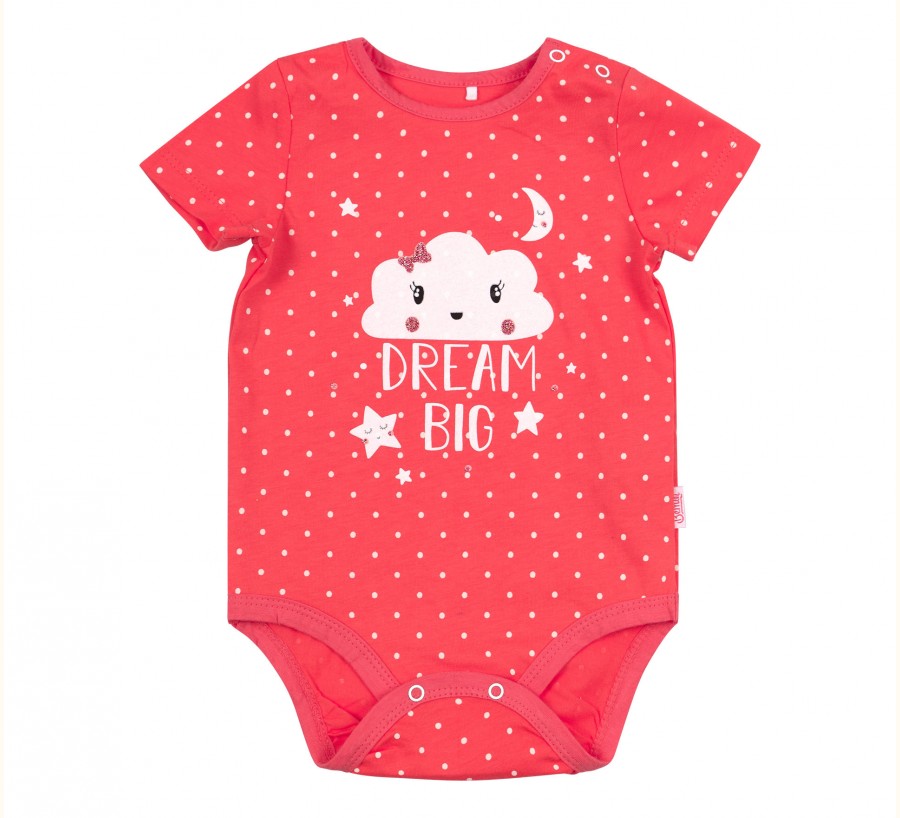 Літній кораловий дитячий бодік з принтом для дівчаток. Пошитий з тонкого бавовняного трикотажу, приємний на дотик та простий у догляді. Має короткий рукав та круглу горловину. Застібається внизу та на плечі на кнопочки. Зручний крій не стримує рухів.
