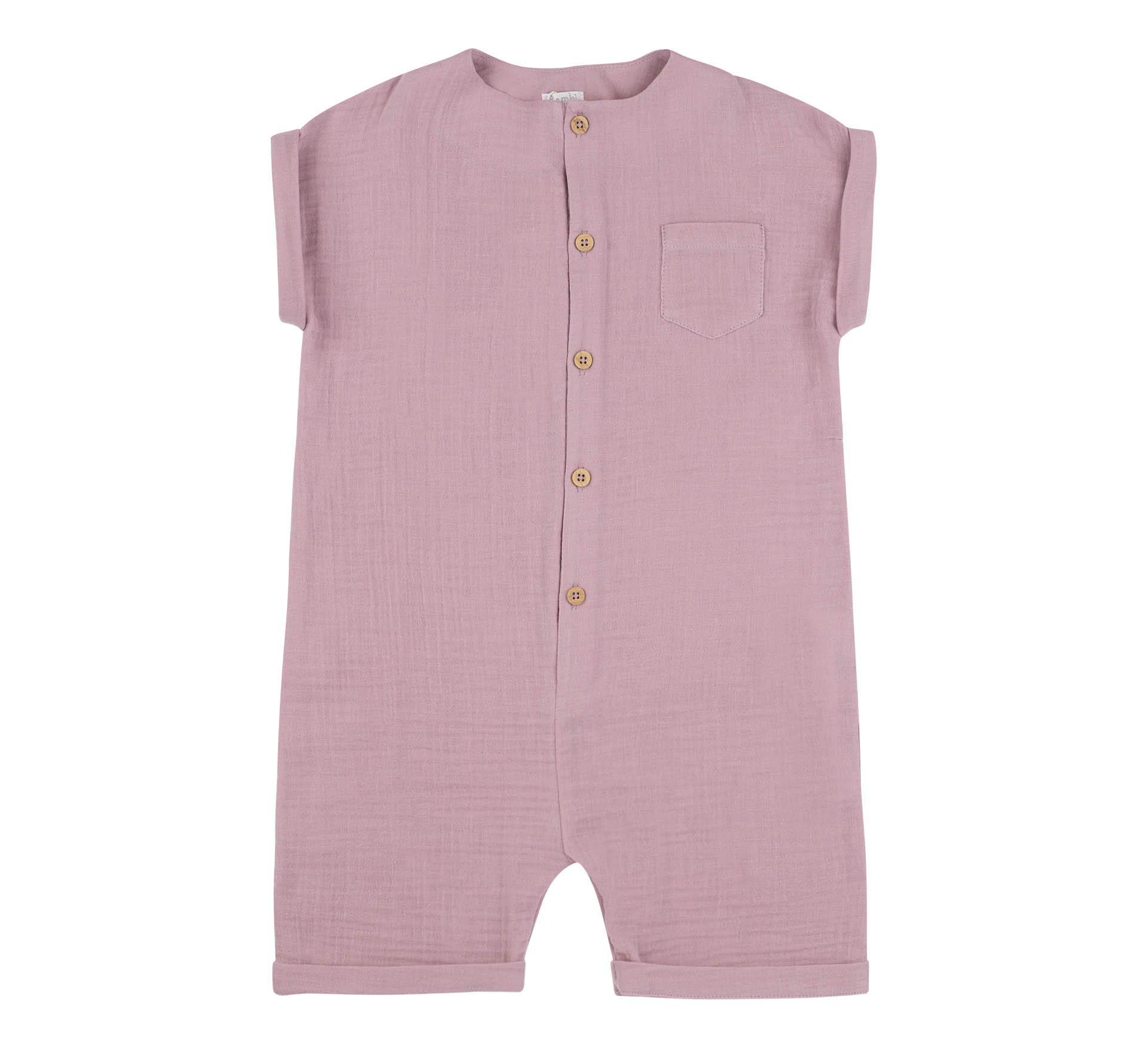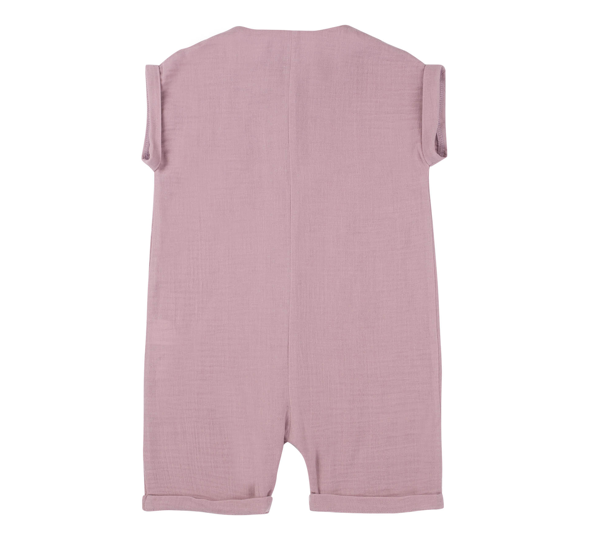 Мусліновий дитячий напівкомбінезон бузкового кольору. Пошитий з легкої та м'якої тканини - муслін. Має короткий рукав та край виробу з заворотами. Застібається спереду на ґудзики по всій довжині виробу. Дитячий літній пісочник прикрашено накладною кишенею.