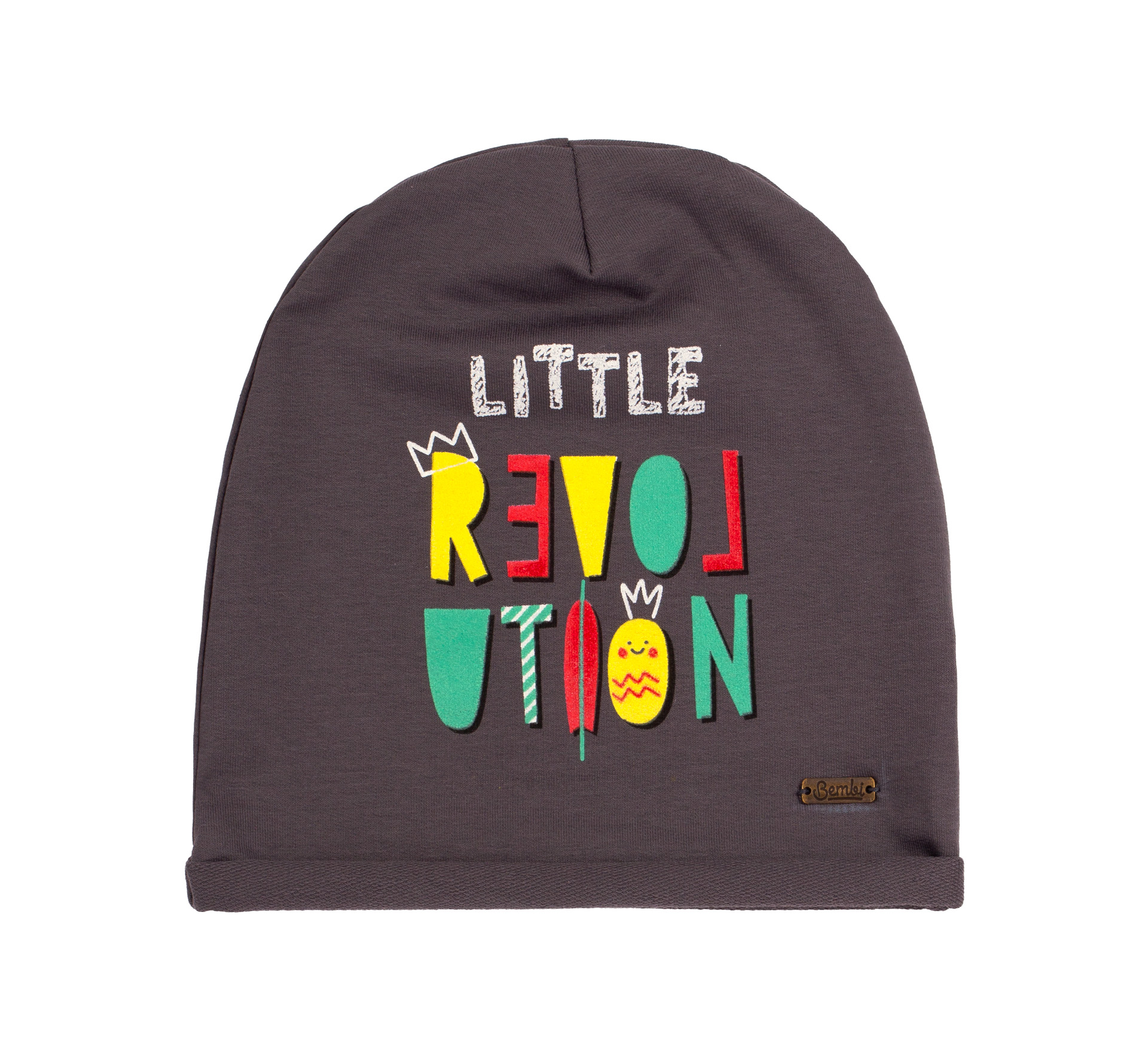 Трикотажна сіра дитяча шапочка для хлопчика. Прикрашена стійким яскравим принтом. По краю має заворот виворітньою стороною тканини. Зручна та легка шапочка на весну, осінь та холодні дні літа.