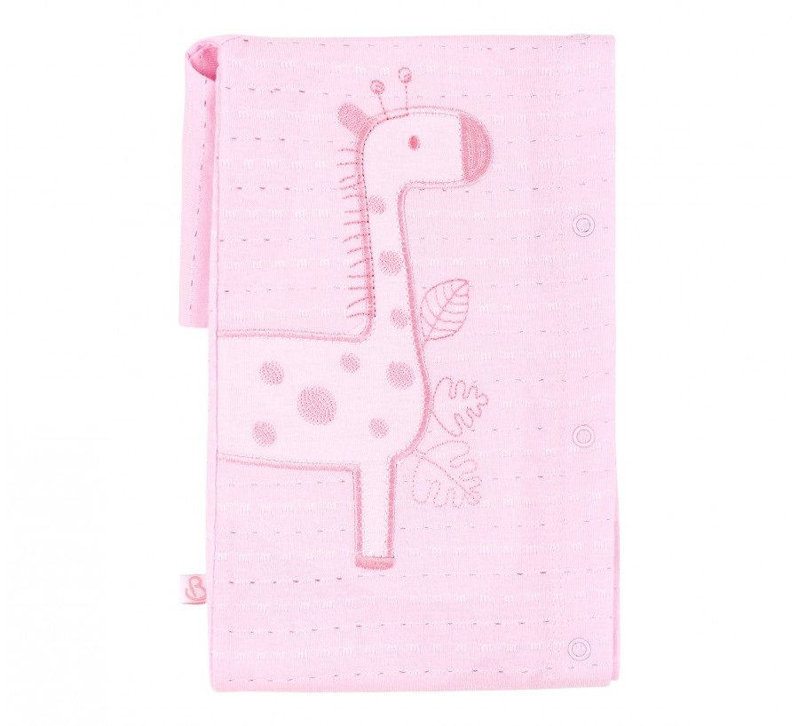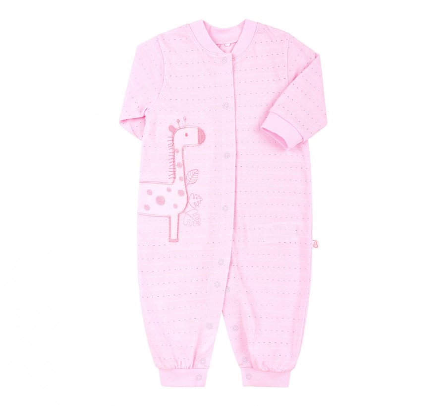 Дитячий рожевий комплект одягу з тонкого фактурного трикотажу. Прикрашений милим жирафиком. Складається з комбінезону, шапочки та капчиків. Комбінезон з жирафом має довгий рукав та відкриті ніжки, застібається на кнопочки. Для ніжок є тонкі капчики. Шапочка з зав'язками.