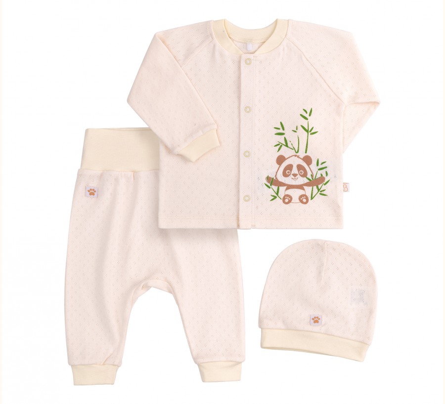 Молочний комплект для малюка. Складається з кофти, штанців та шапочки. Кофта на кнопочках, прикрашена принтом з пандою. Штанці на еластичному поясі. Шапочка однотонна.