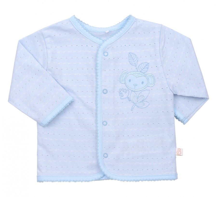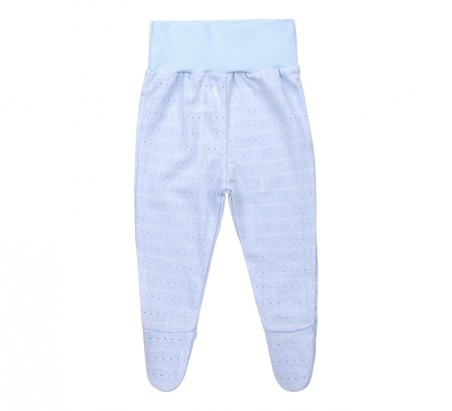 Блакитний дитячий комплект для малюка. Складається з чепчика, кофти та повзунків. Кофта застібається на кнопочки, має довгий рукав. Шапочка з зав'язками. Штанці з широким поясом та закритими ніжками. Набір пошитий з тонкого фактурного бавовняного трикотажу.