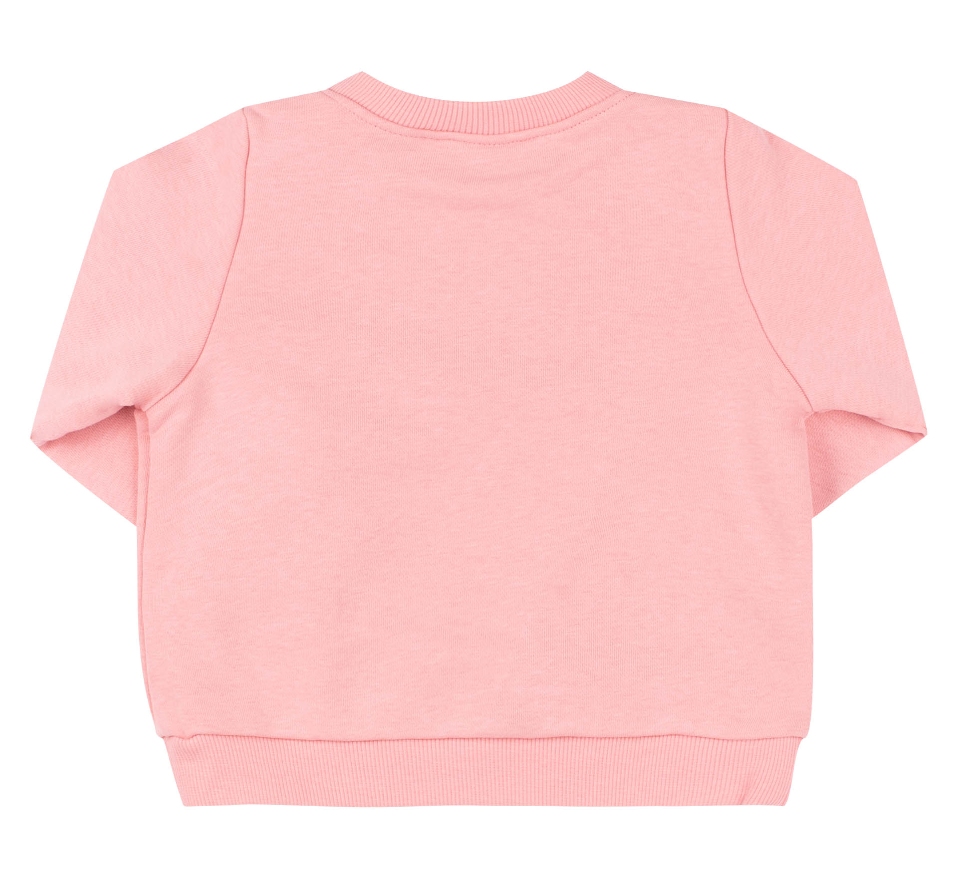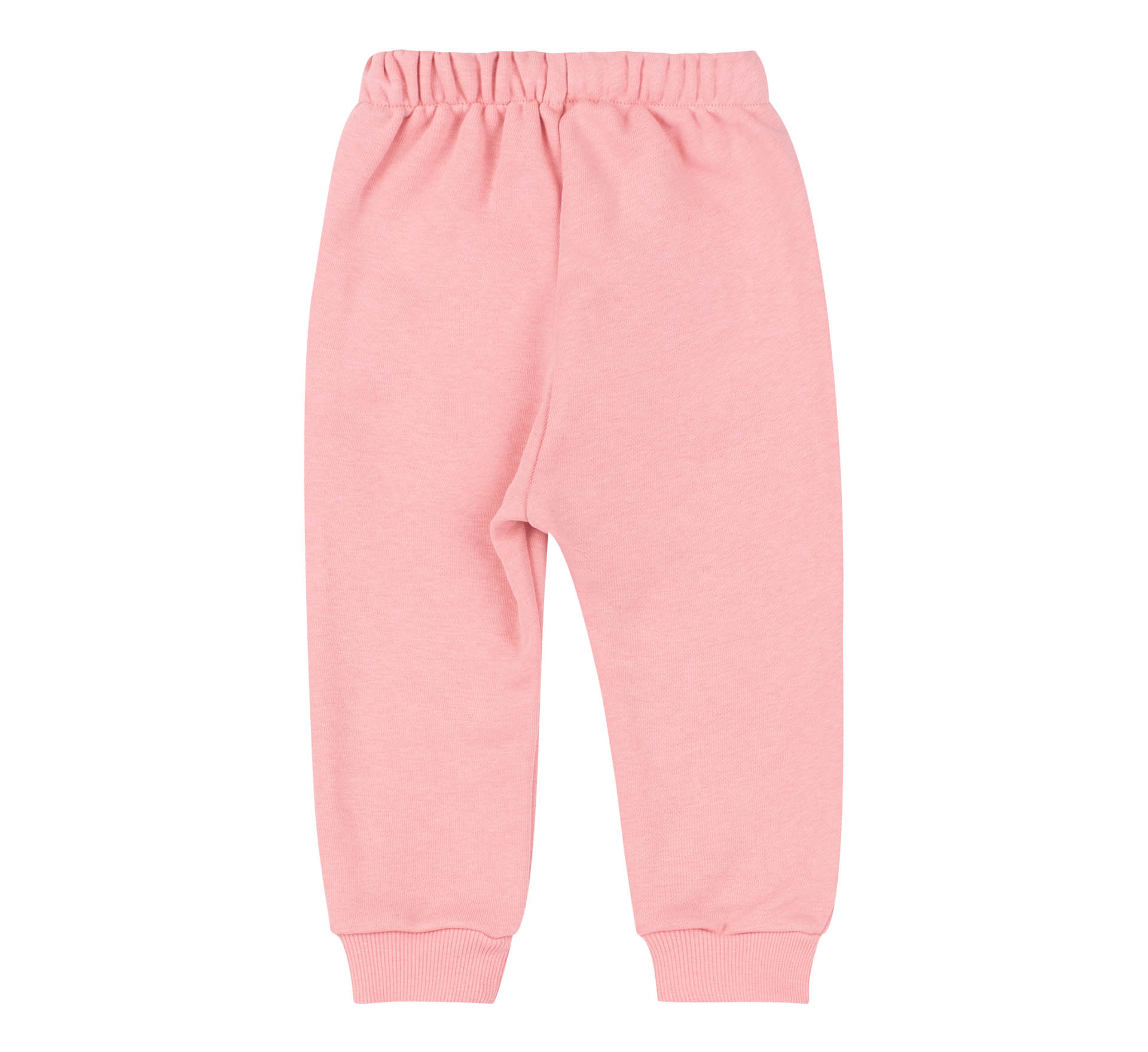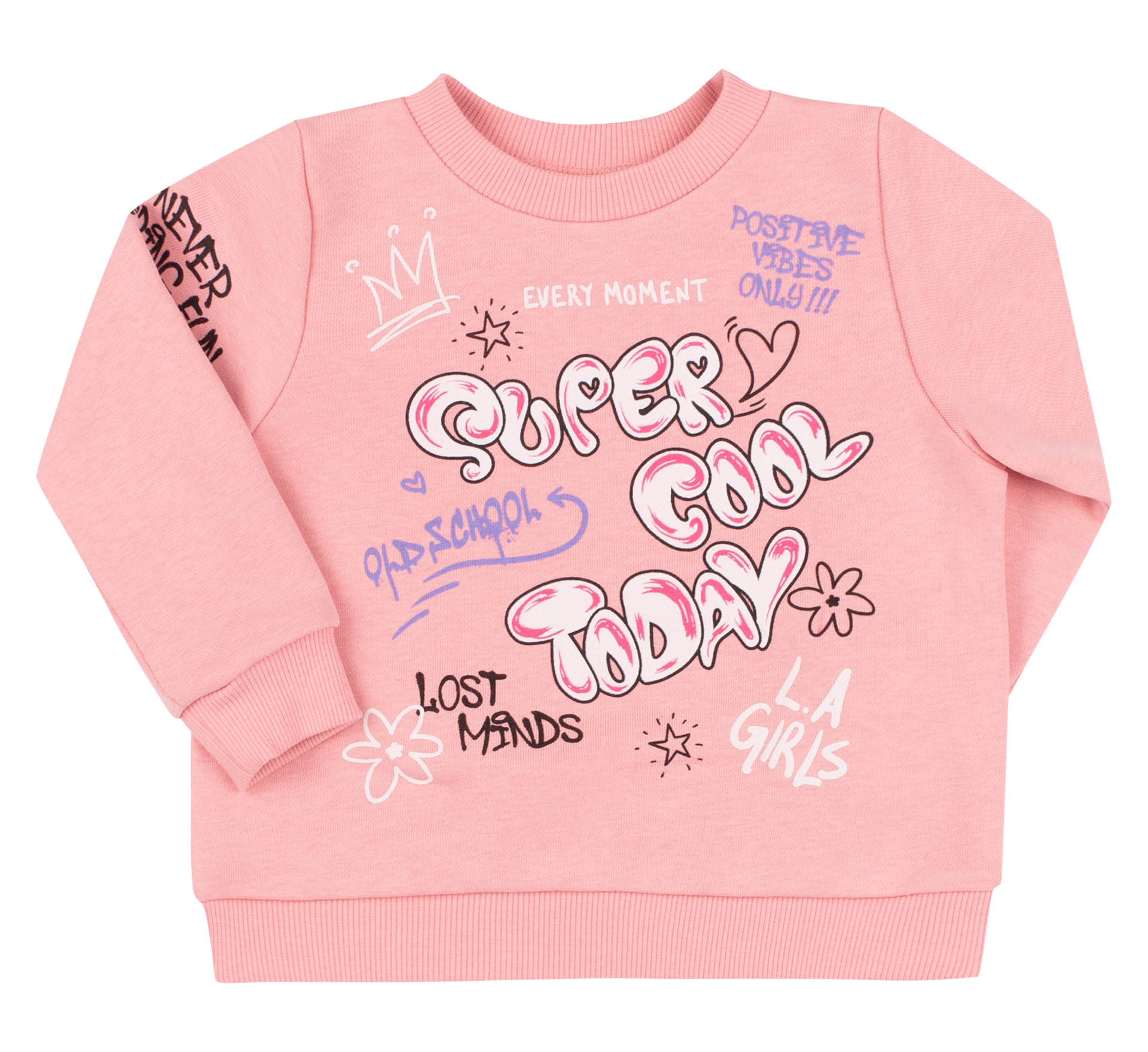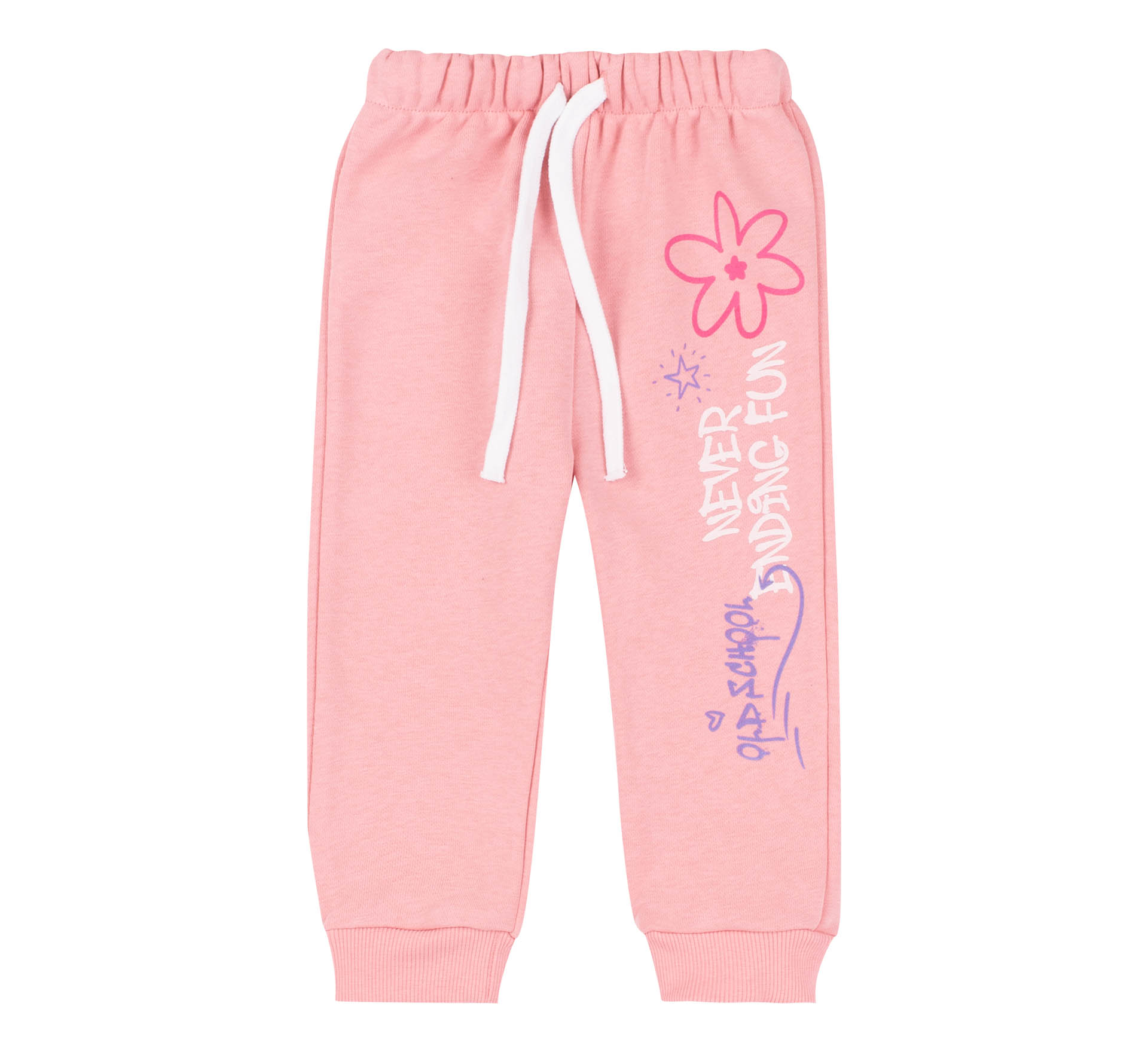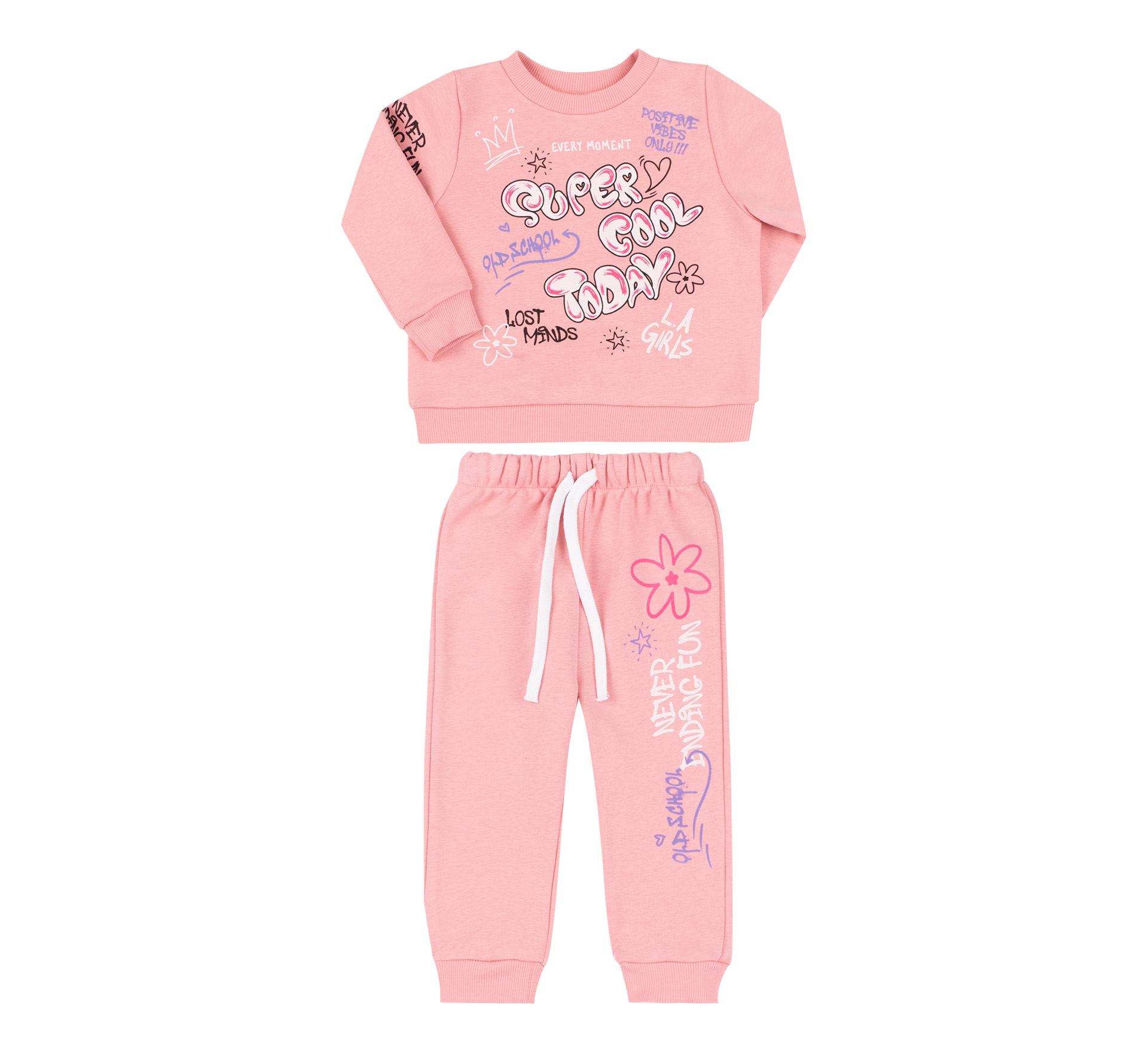 Дитячий рожевий костюм з принтом. Пошитий з трикотажу тринитка та входить у весняну колекцію дитячого одягу. Складається з вільного джемперу та спортивних штанів. Кругла горловина та манжети на рукавах та штанинах з трикотажу в рубчик (качкорса). Пояс штанів на резинці зі шнурочком.